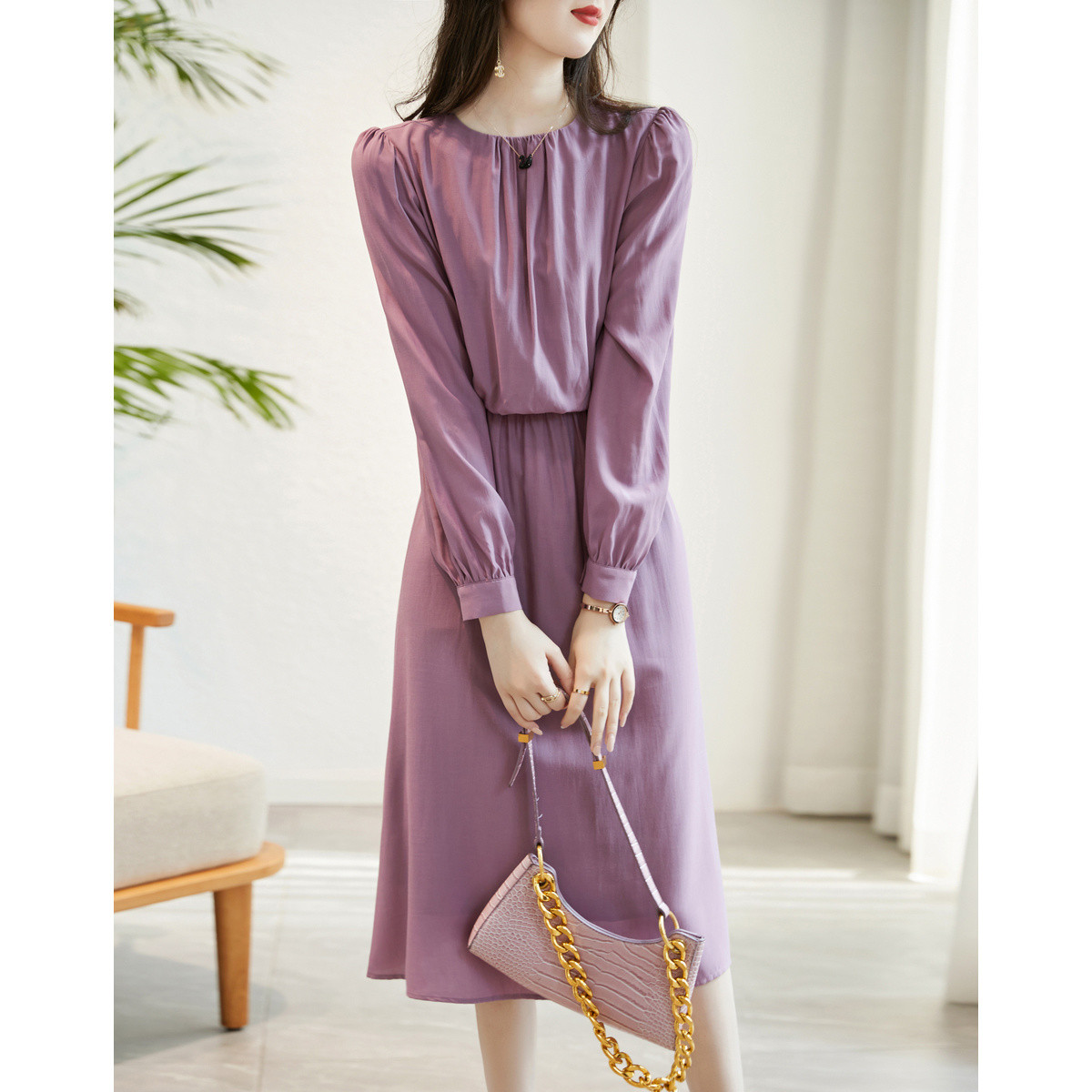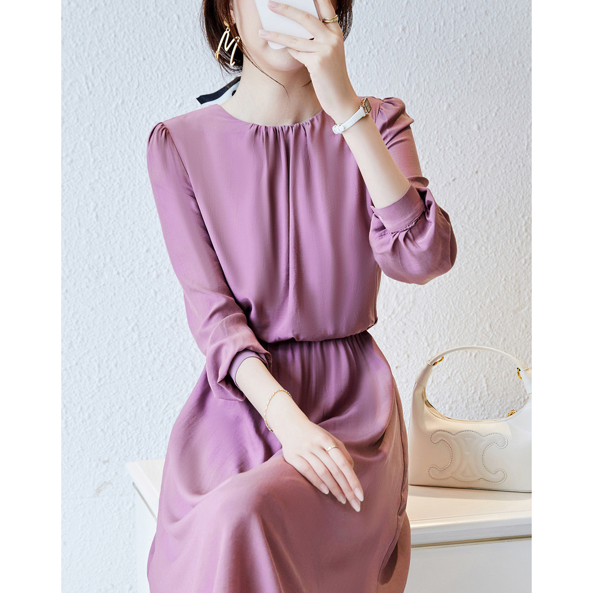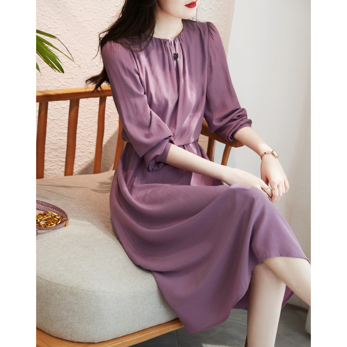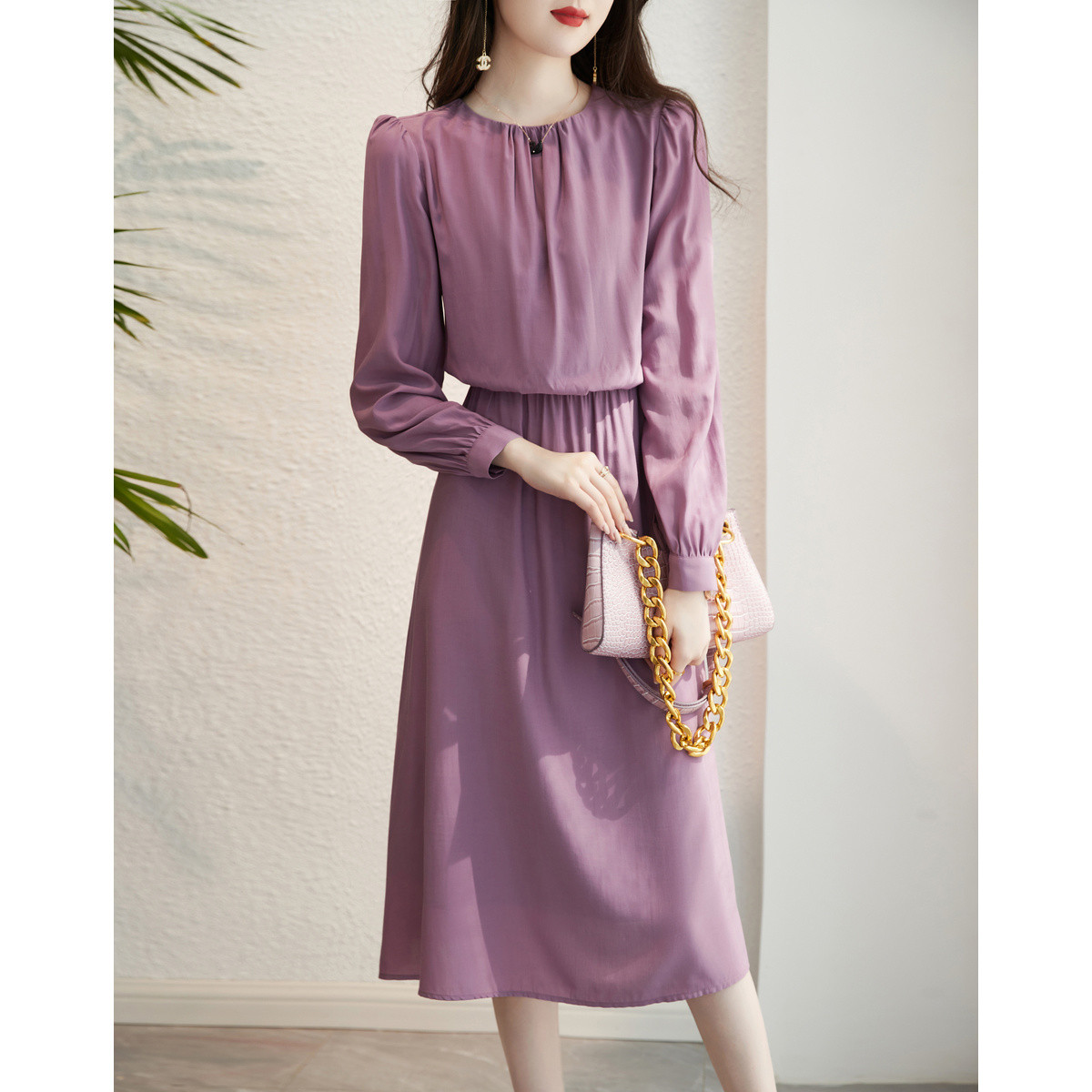 商品名称:【岁月如歌】春秋法式圆领设计感收褶优雅松紧高腰大摆女式连衣裙 140801