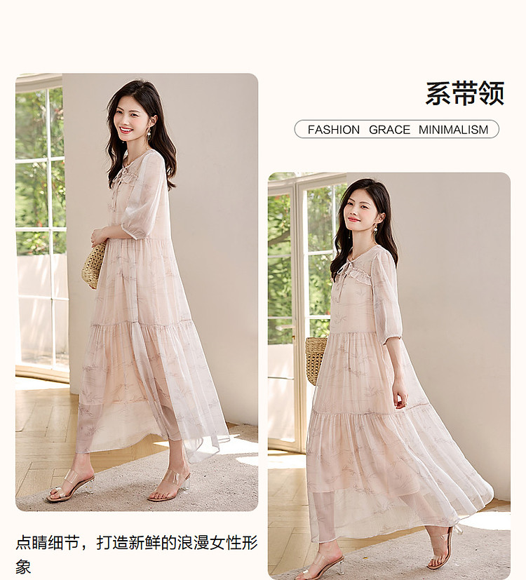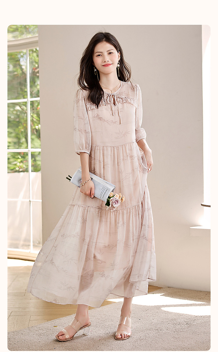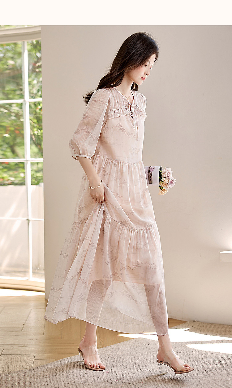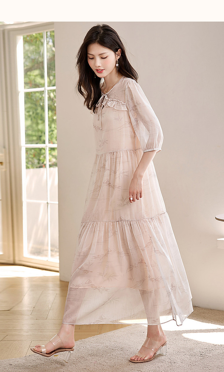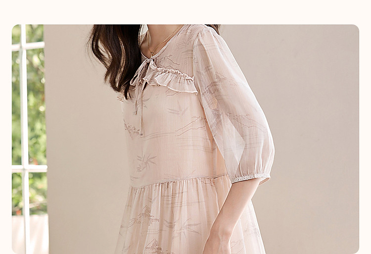 【疏影清浅】夏国风新中式度假淑女系带领雪纺印花七分袖连衣裙女 254849