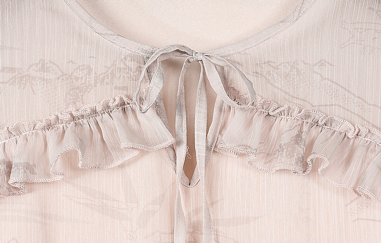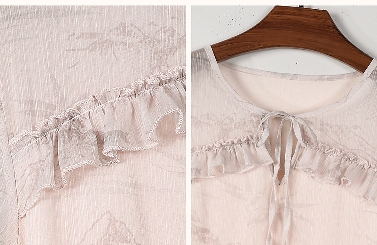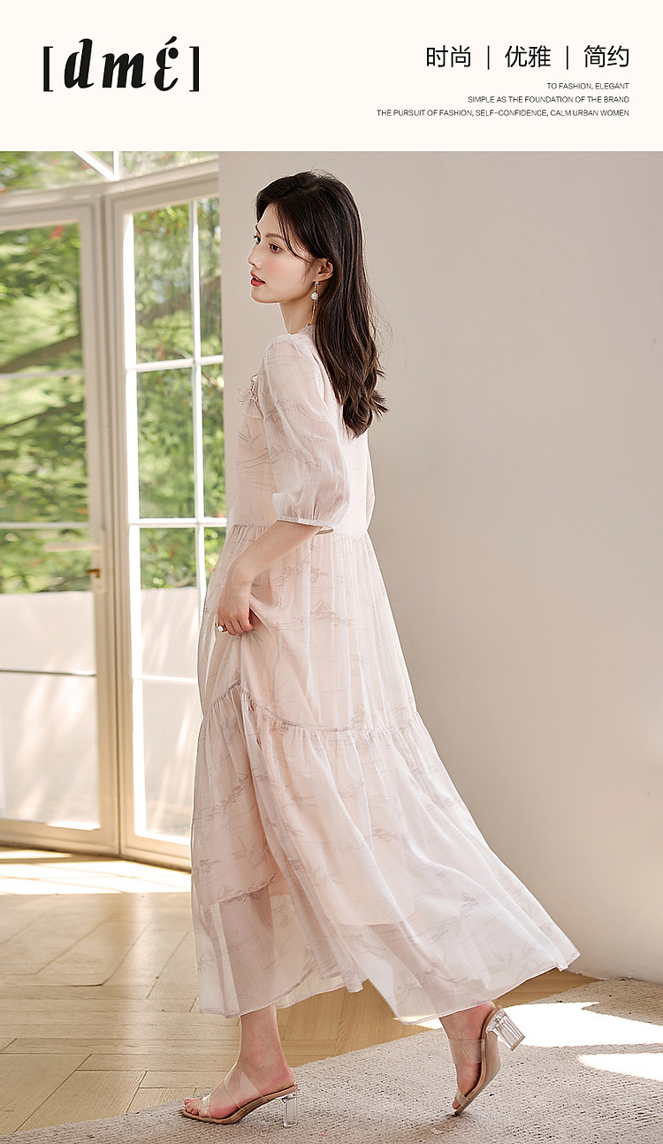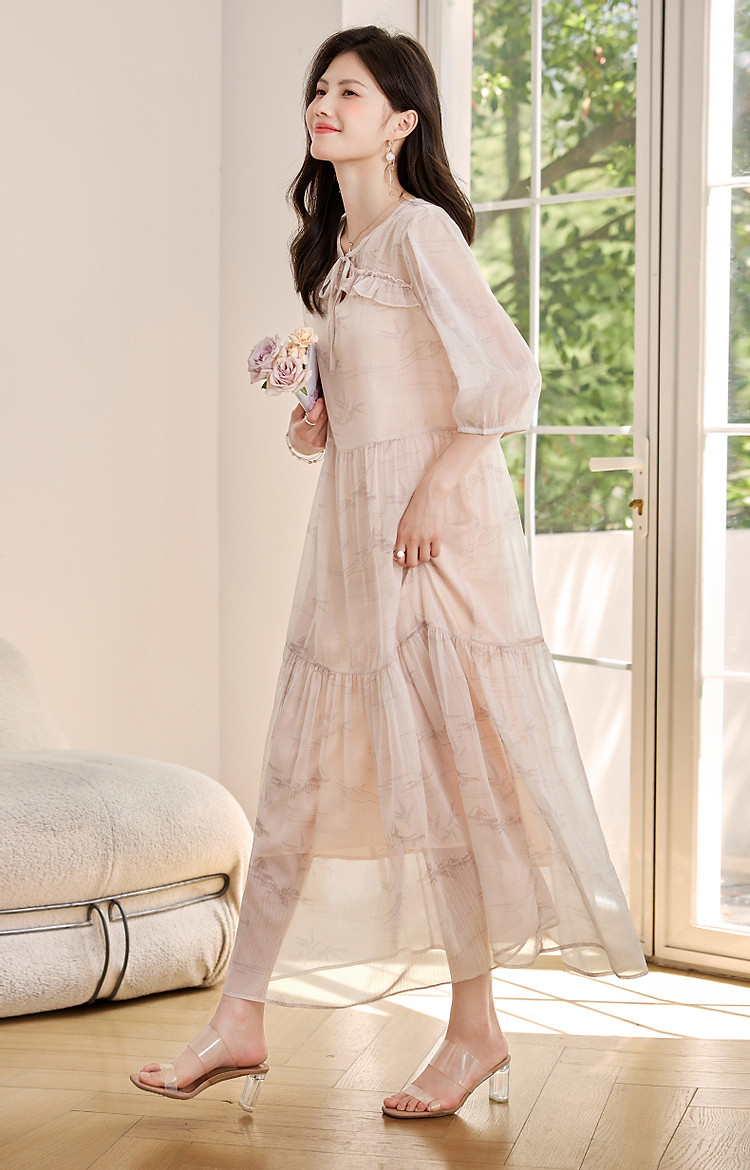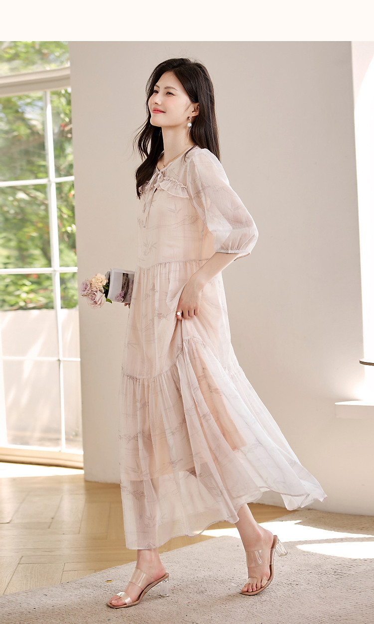 【疏影清浅】夏国风新中式度假淑女系带领雪纺印花七分袖连衣裙女 254849