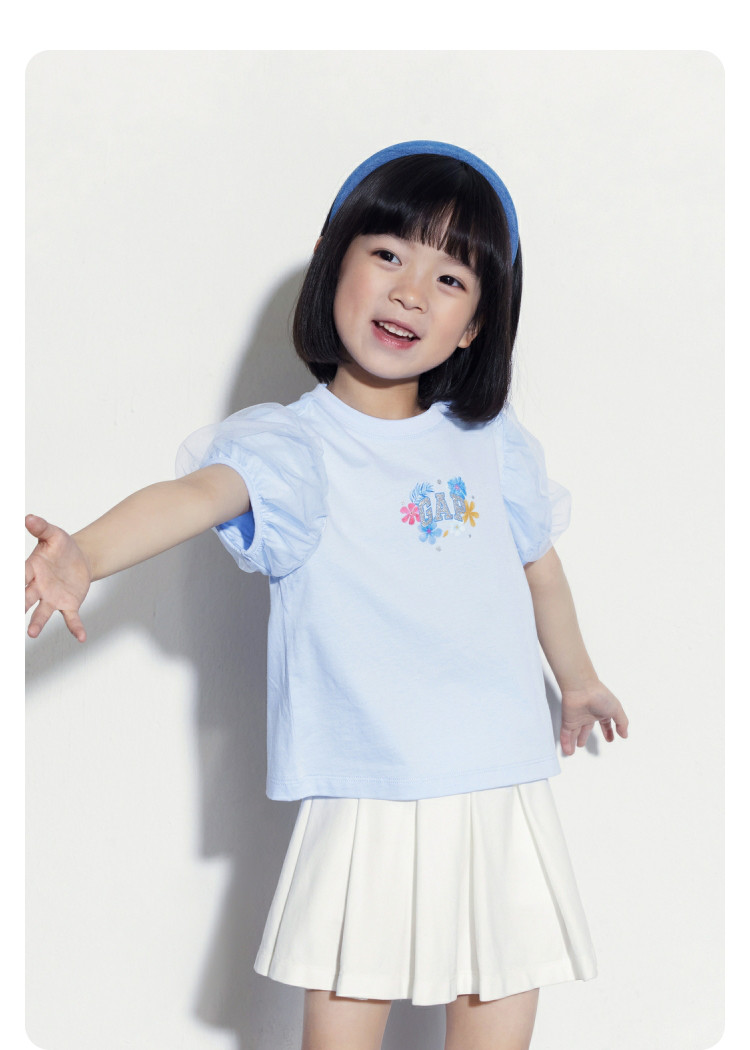 Gap女幼童2024春秋季印花网纱泡泡短袖T恤儿童装上衣466776 172826