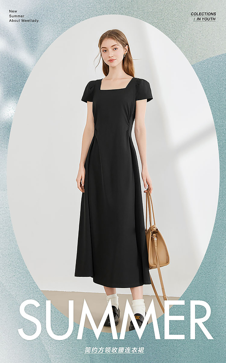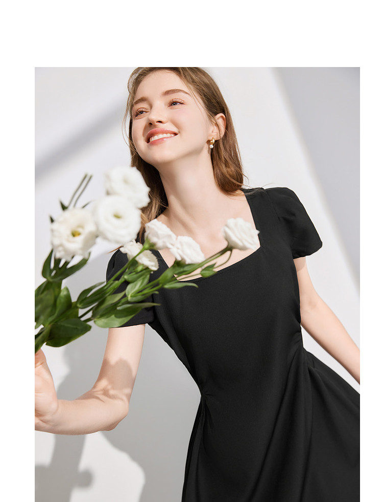 【夏季热卖】法式优雅收腰连衣裙休闲气质方领纯色简约裙子 016468