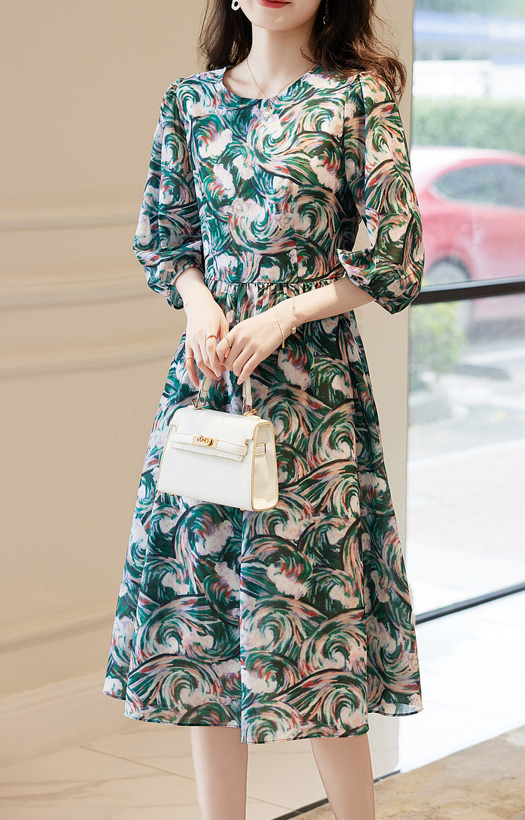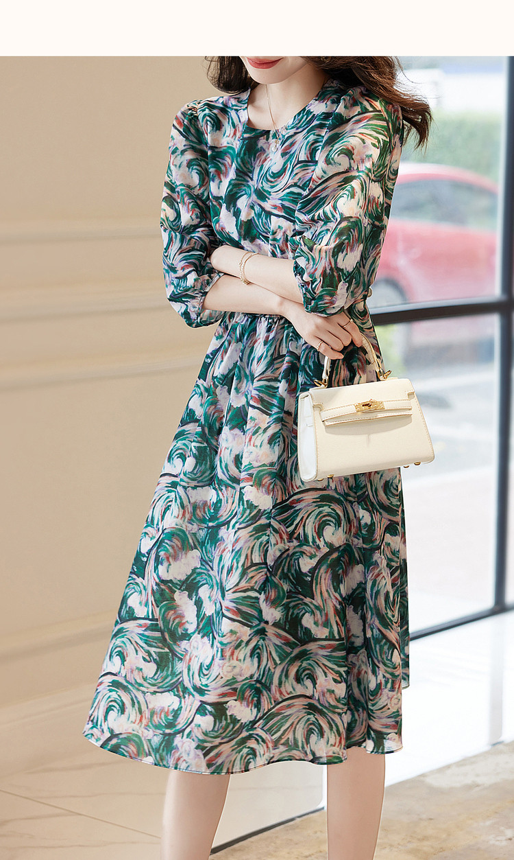 【艺术感娃娃裙】春秋圆领收腰七分袖连衣裙女中长款 177665