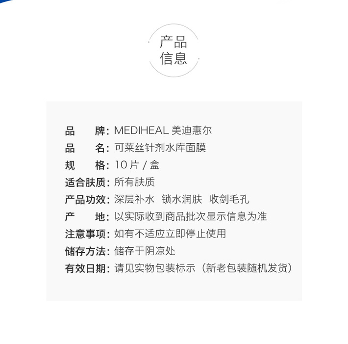 商品名称:Mediheal/美迪惠尔 可莱丝针剂水库面膜 10片/盒