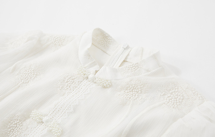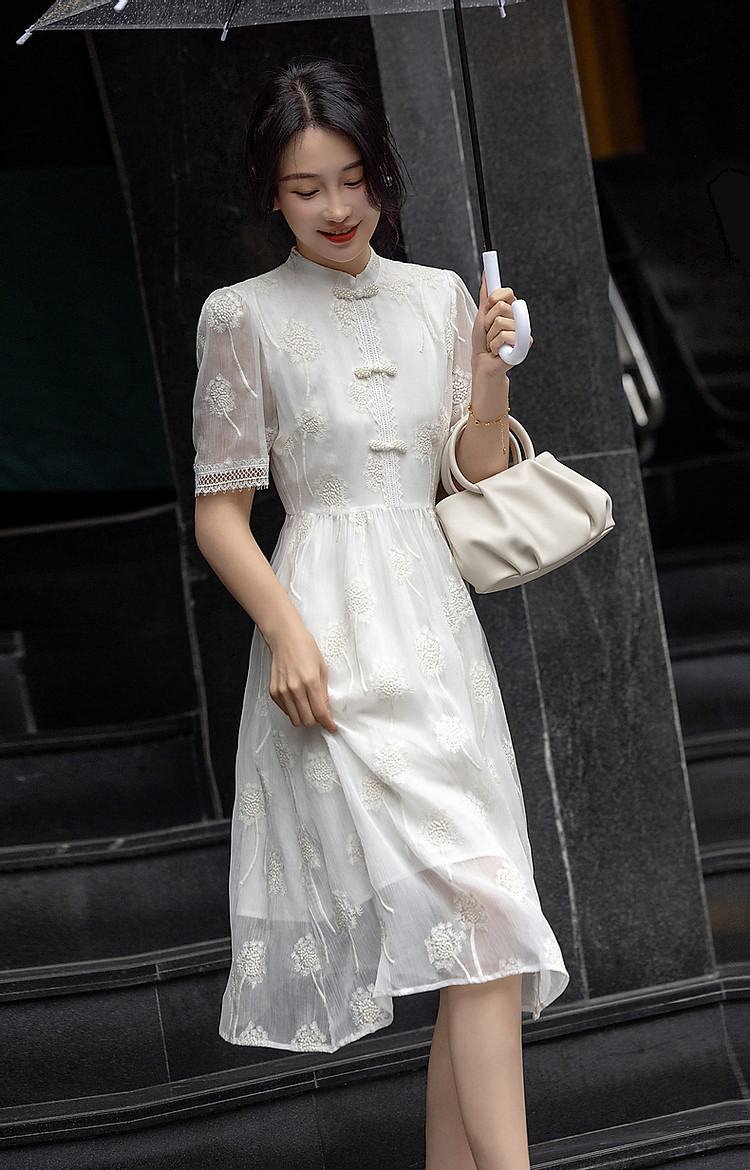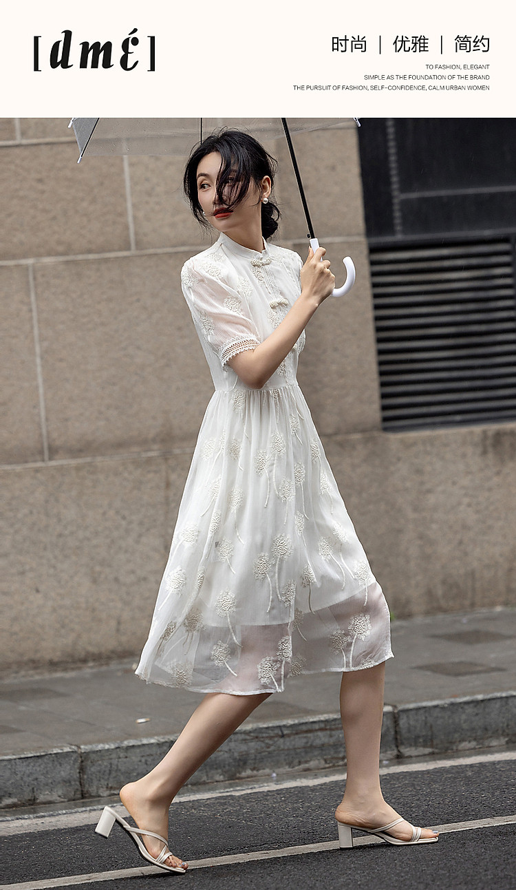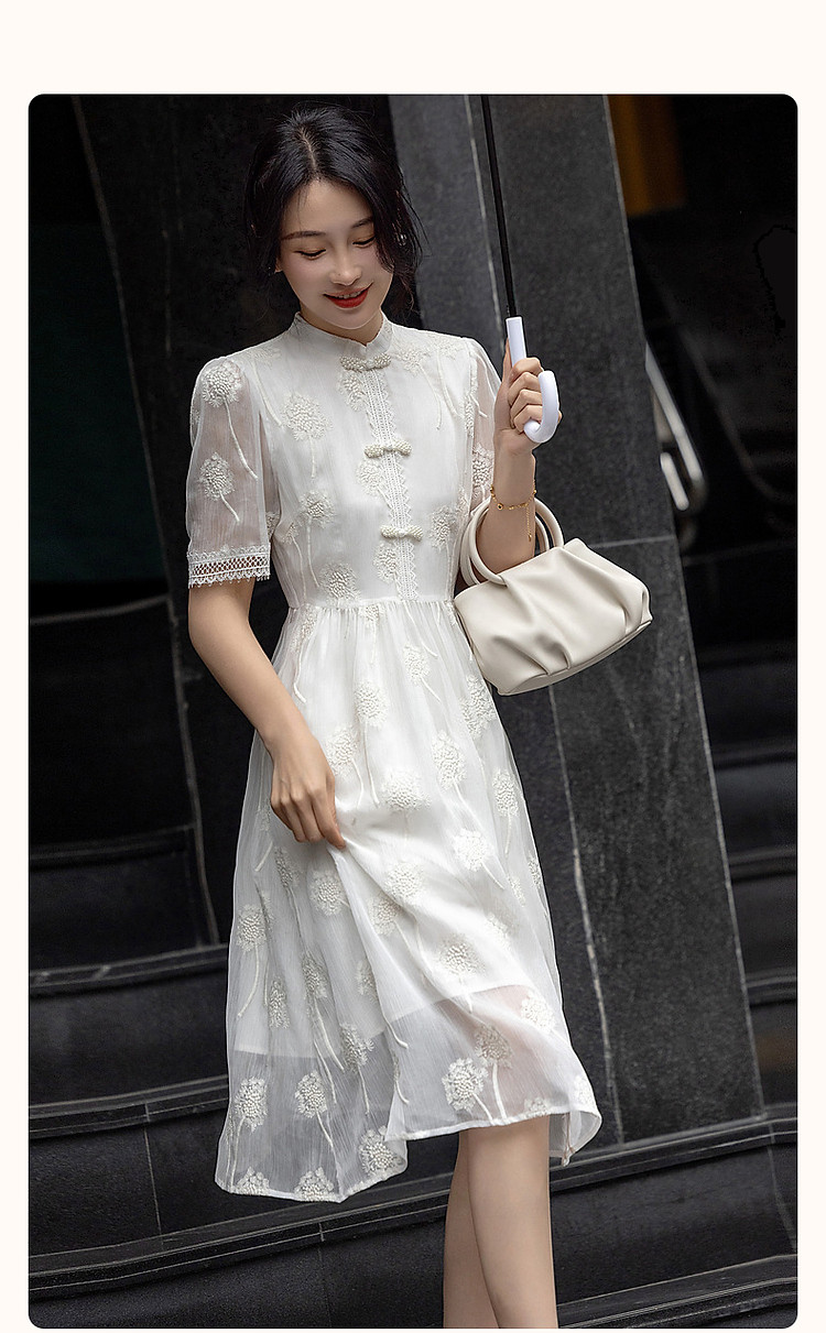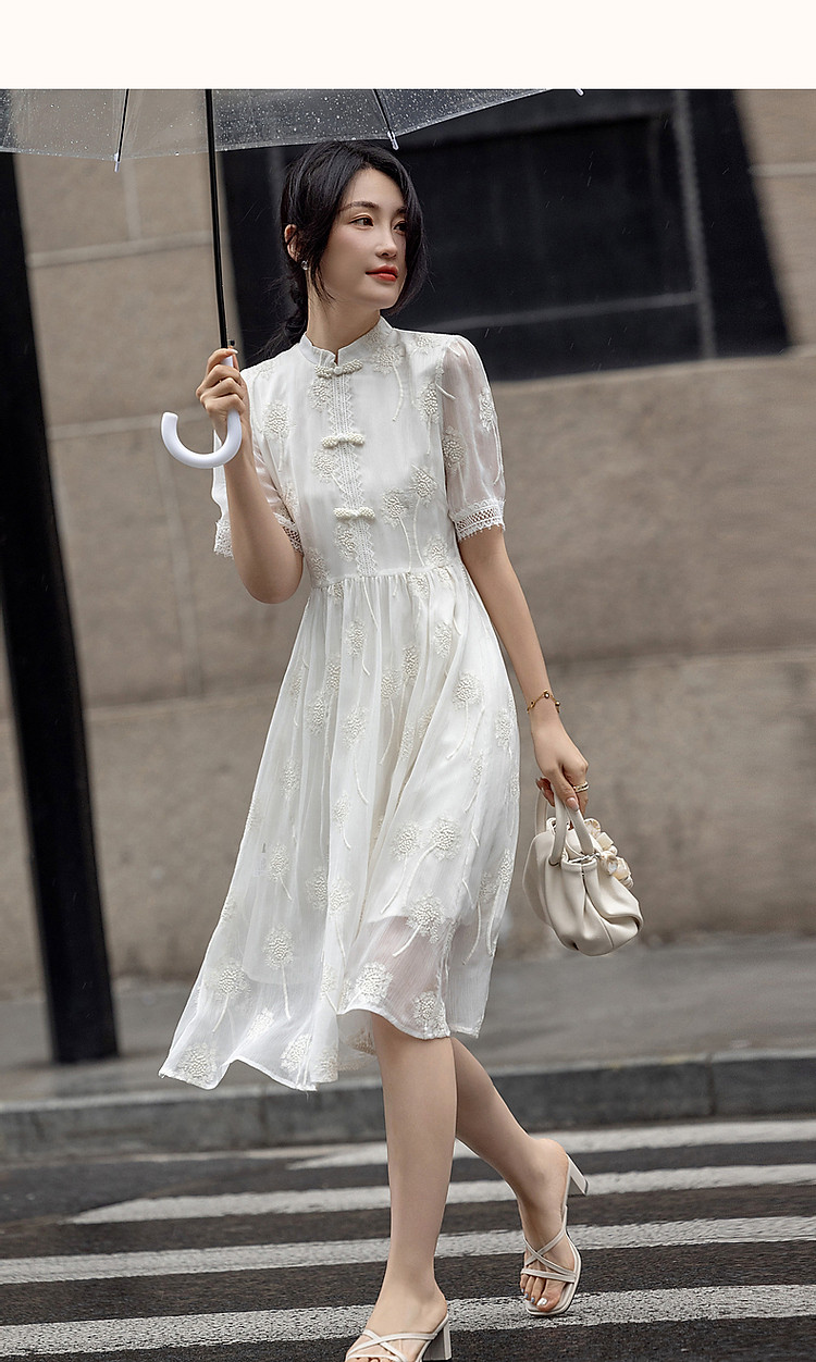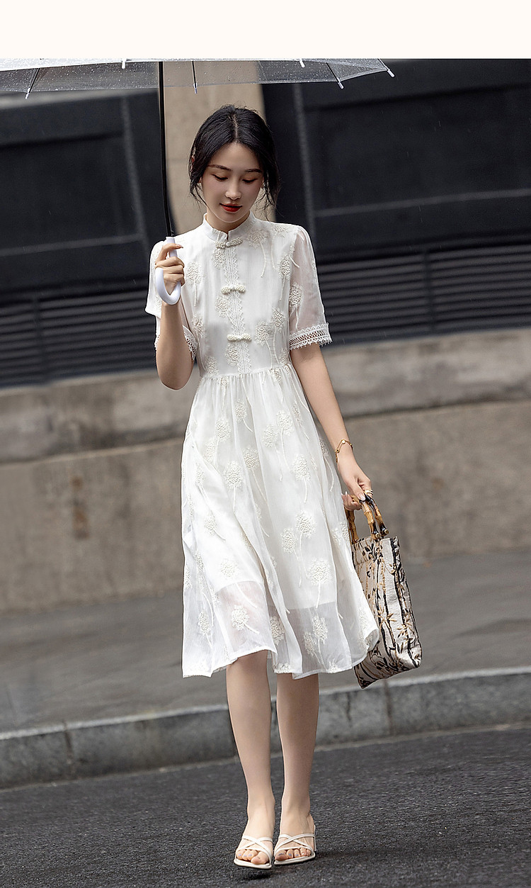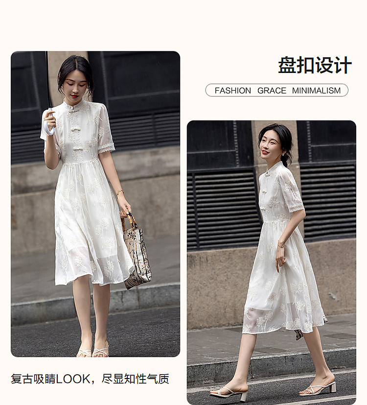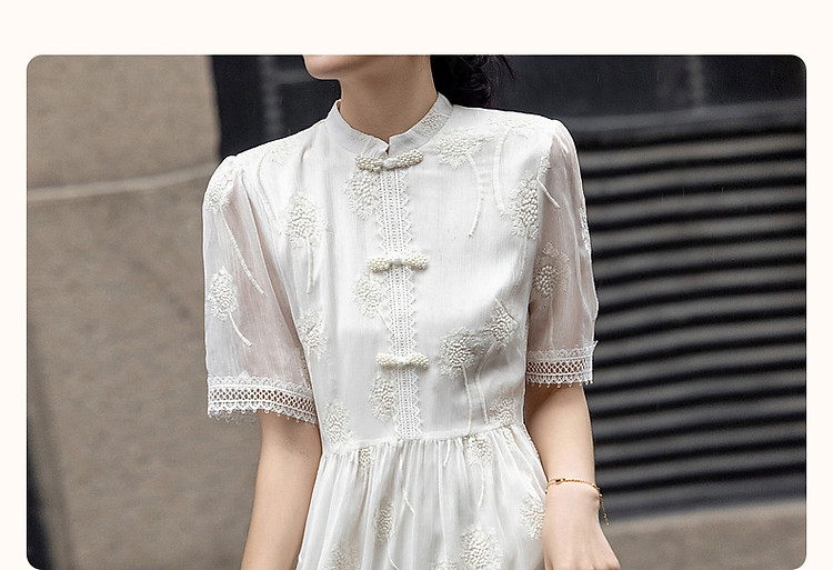 商品名称:【清冷白茶】夏国风新中式立领盘扣顺纡绉刺绣藏肉连衣裙女中长款 168833