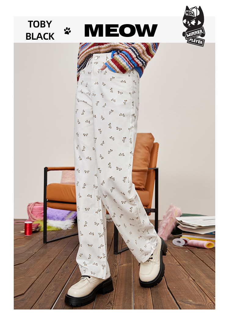 韩系可爱蝴蝶结碎花满印直筒裤夏季休闲小清新女式牛仔裤 297053
