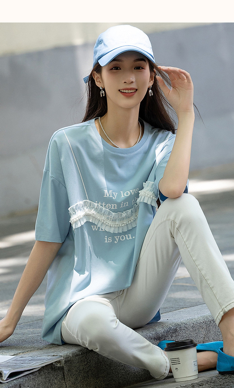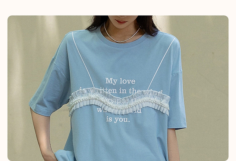 【假两件蕾丝字母t恤】夏减龄时髦休闲宽松显瘦舒适女式t恤 539969
