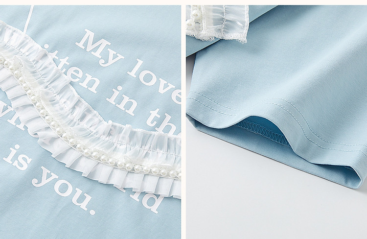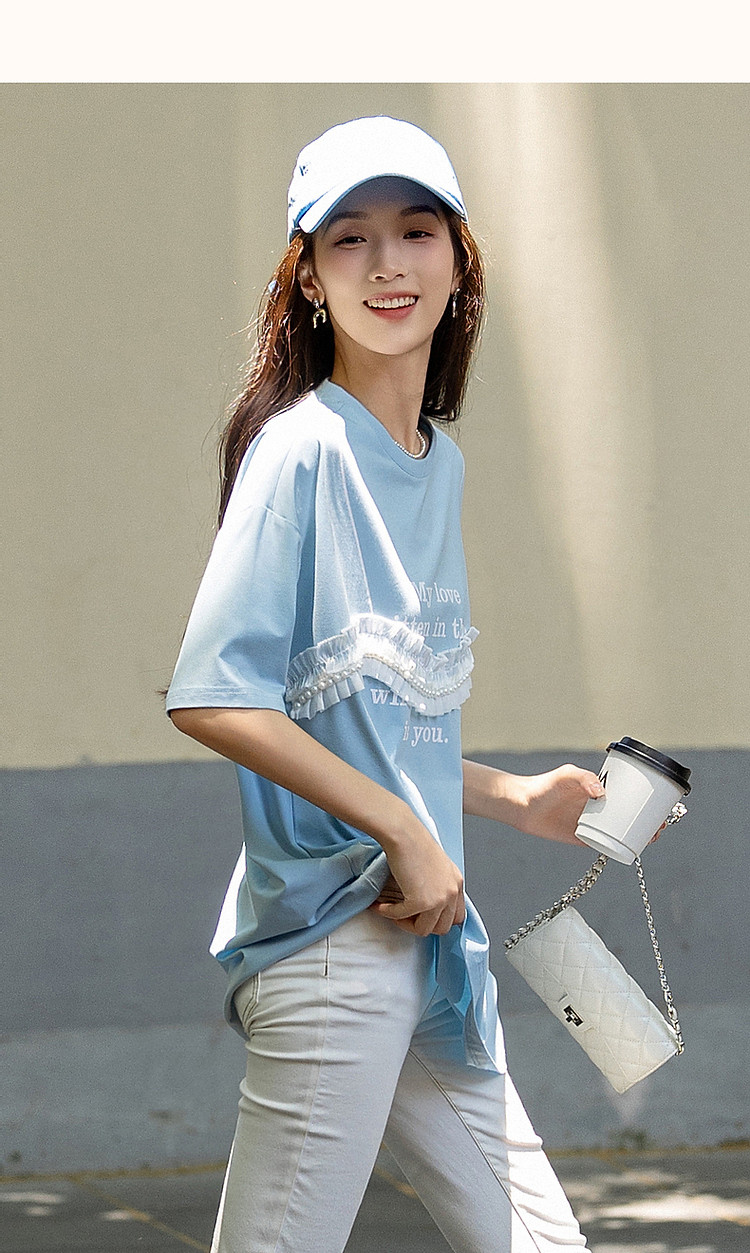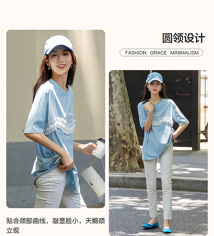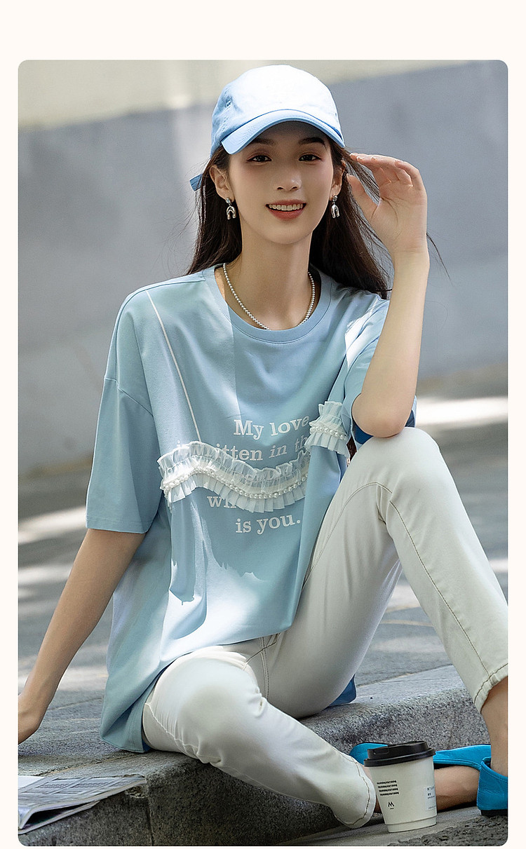 商品名称:【假两件蕾丝字母t恤】夏减龄时髦休闲宽松显瘦舒适女式t恤 539969