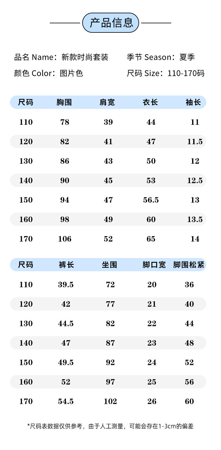 | 尺码 | 肩宽(cm) | 袖长(cm) | 上装号型 | 适合年龄 | 下装号型 | 衣长(cm) | 身高(cm) | 腰围(cm) | 裤长(cm) | 胸围(cm) | 号型 |