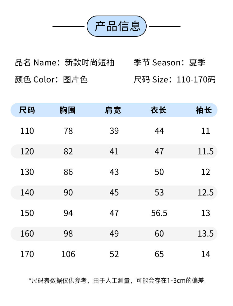 | 尺码 | 衣长(cm) | 肩宽(cm) | 身高(cm) | 袖长(cm) | 适合年龄 | 胸围(cm) | 号型 |