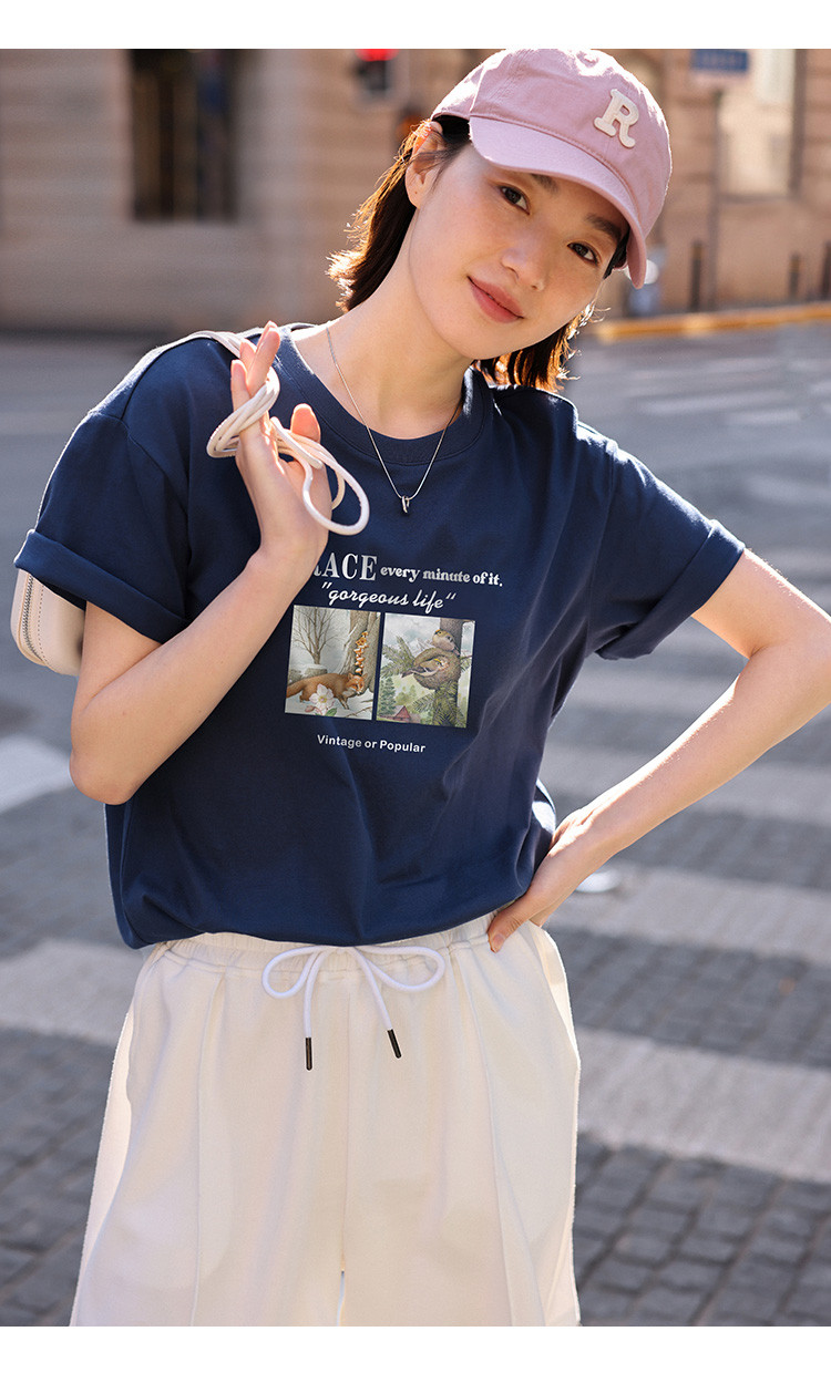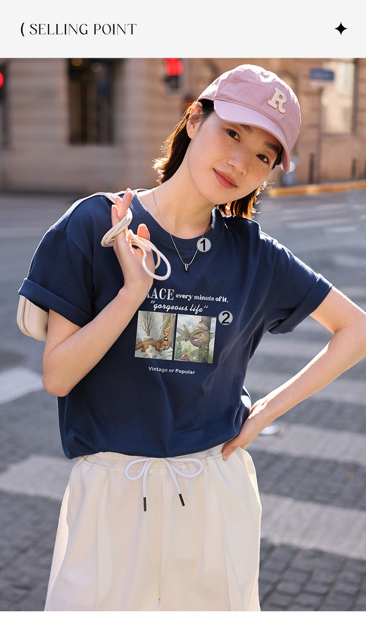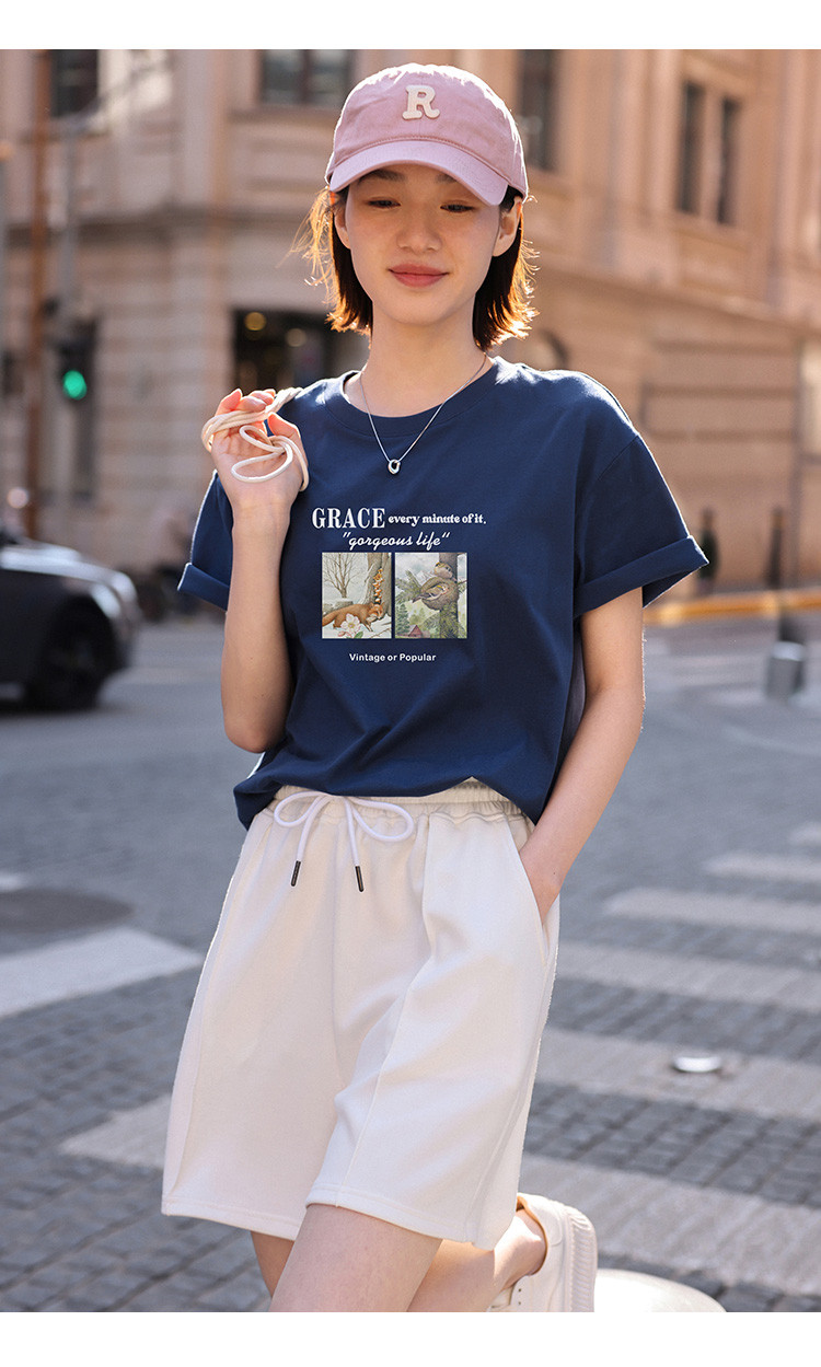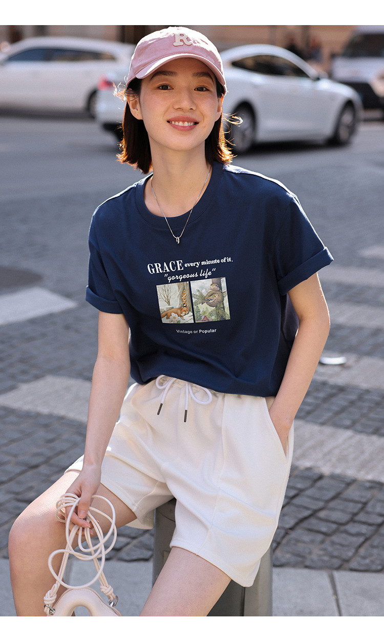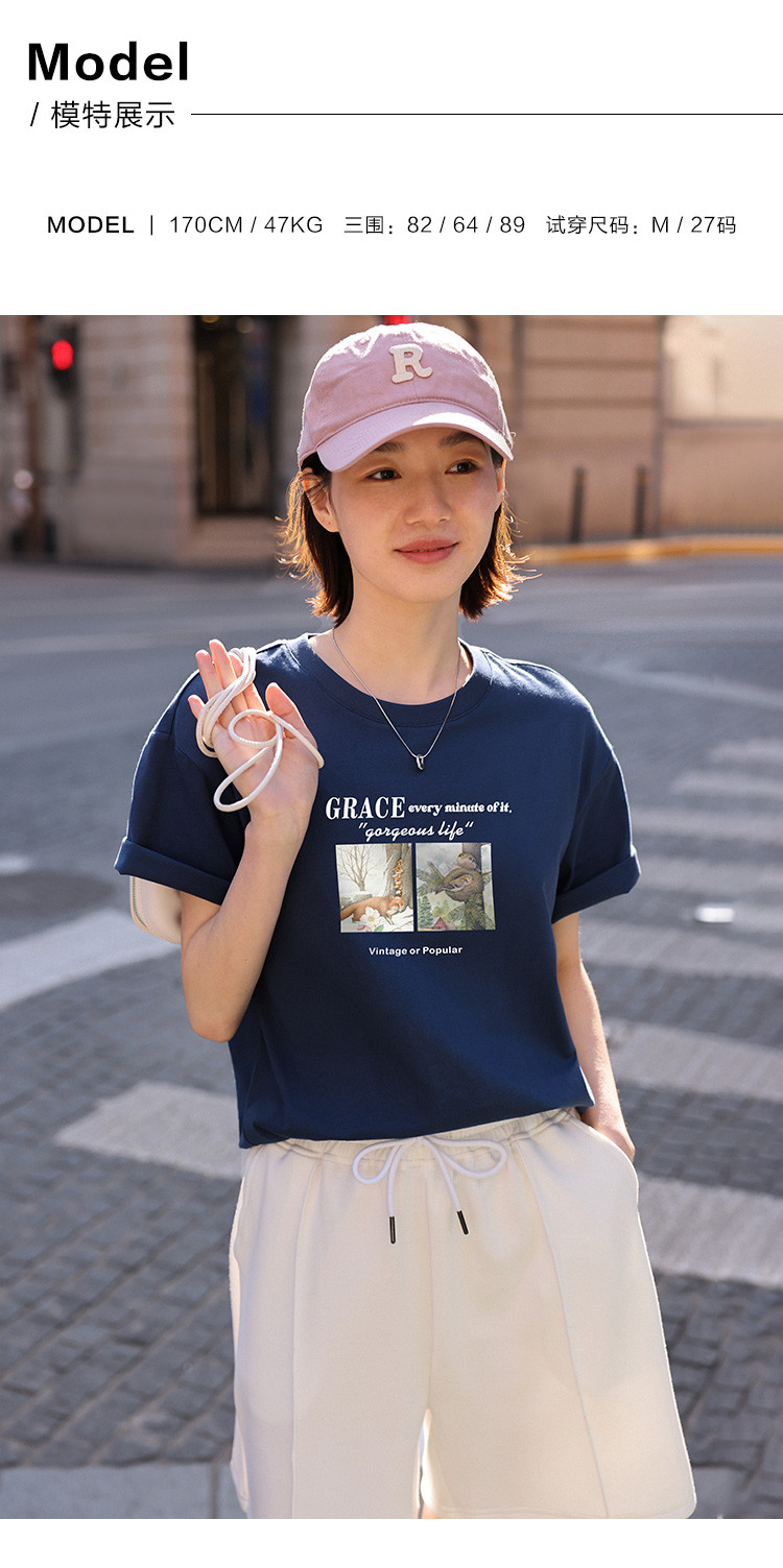 商品名称:【油画印花翻边短袖】夏款清新休闲风圆领短袖T恤女 608194