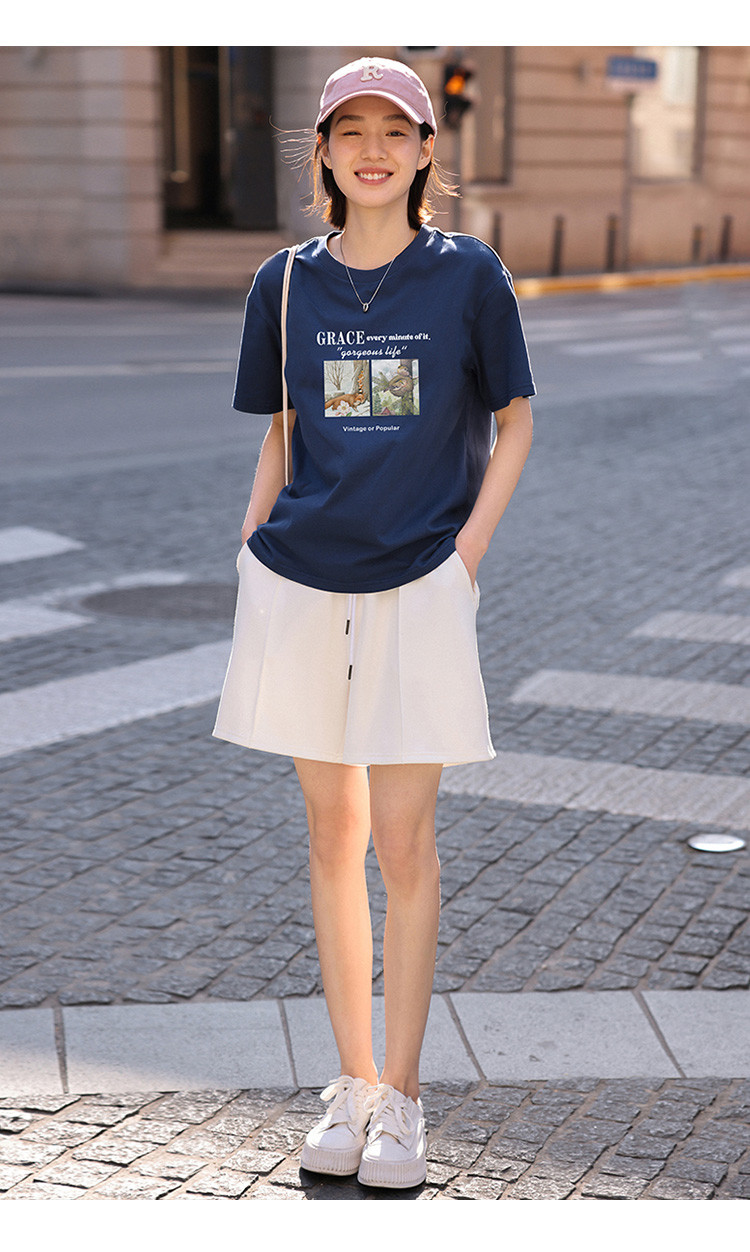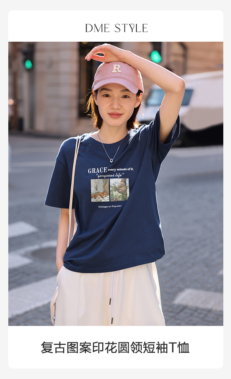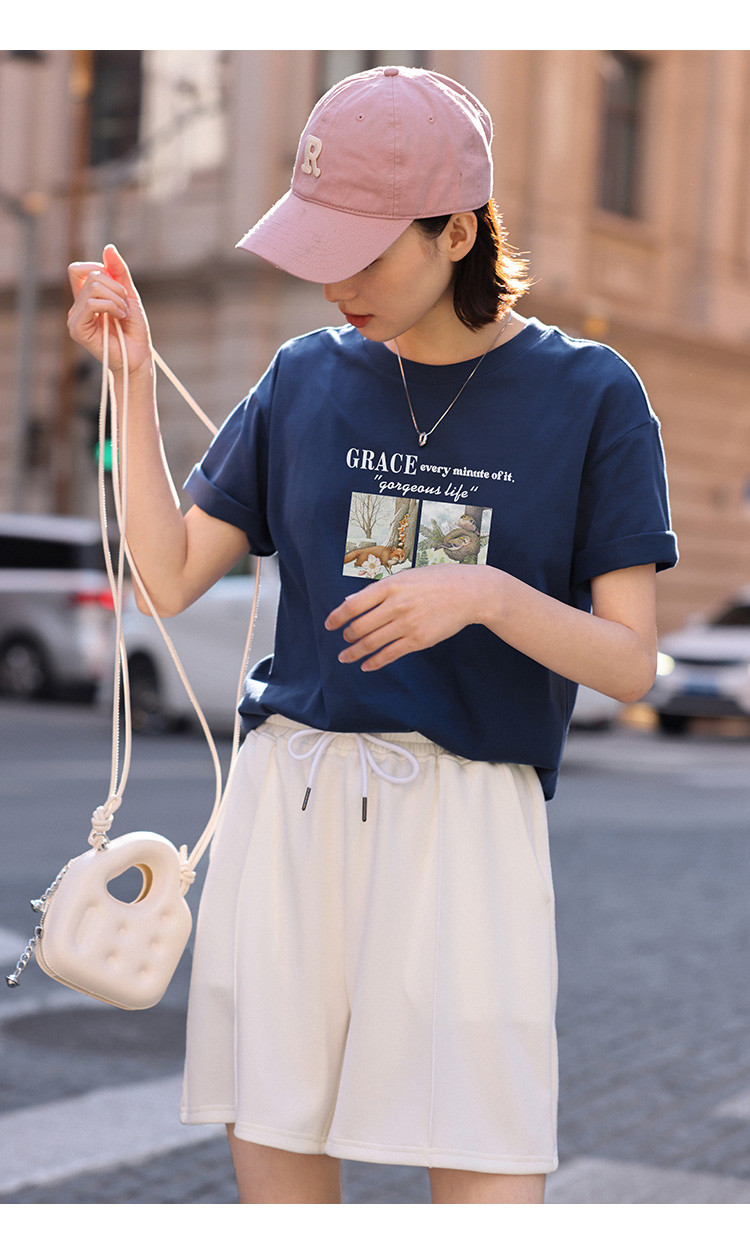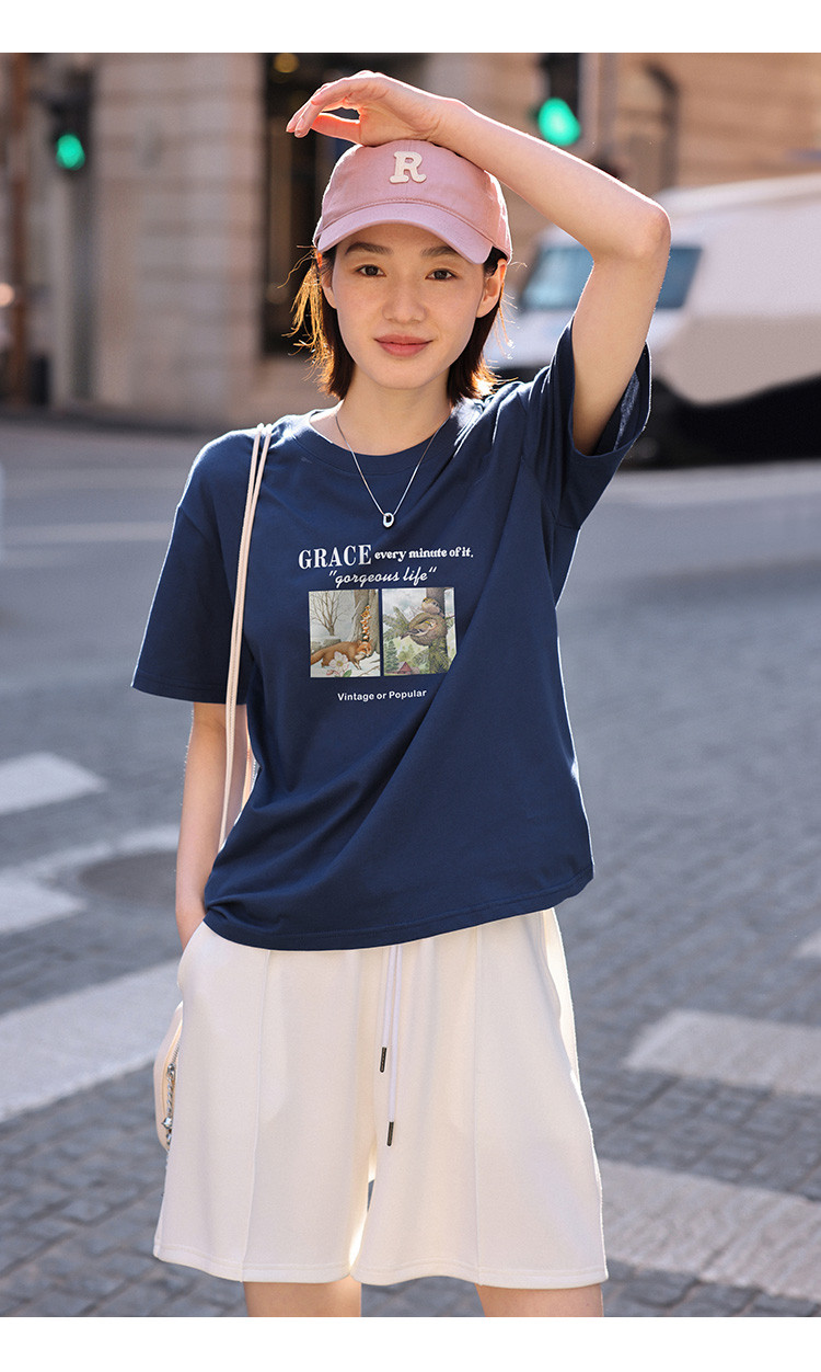 商品名称:【油画印花翻边短袖】夏款清新休闲风圆领短袖T恤女 608194