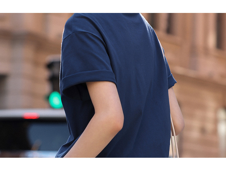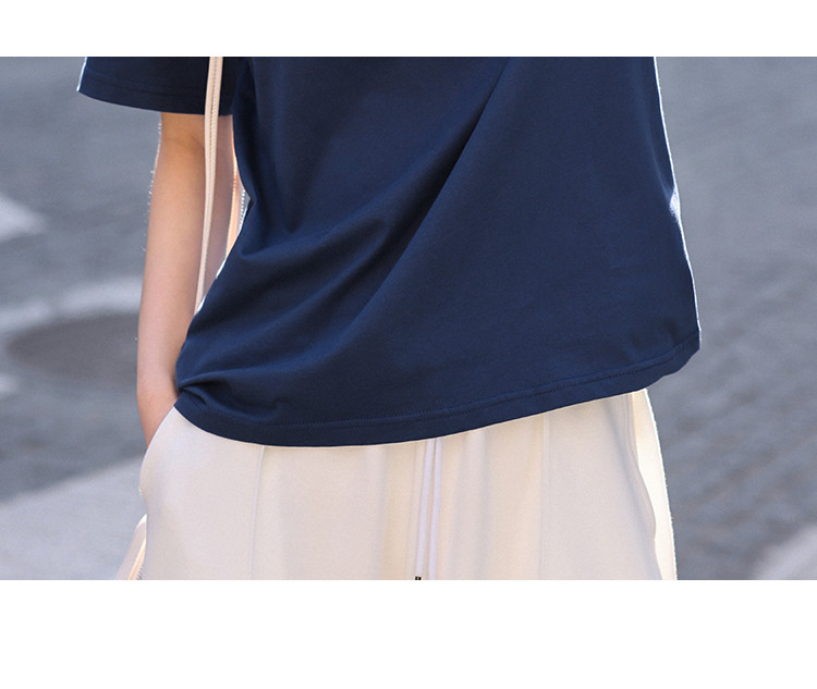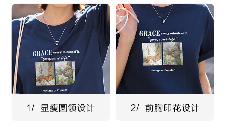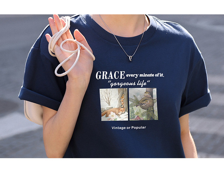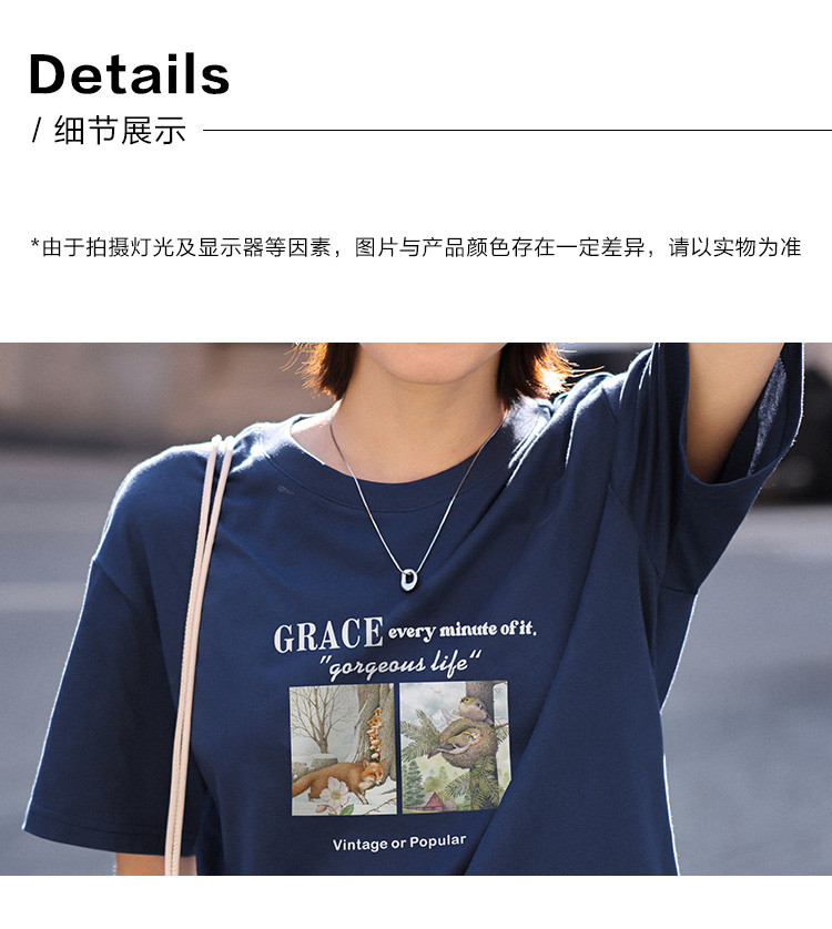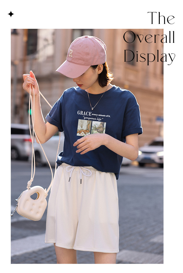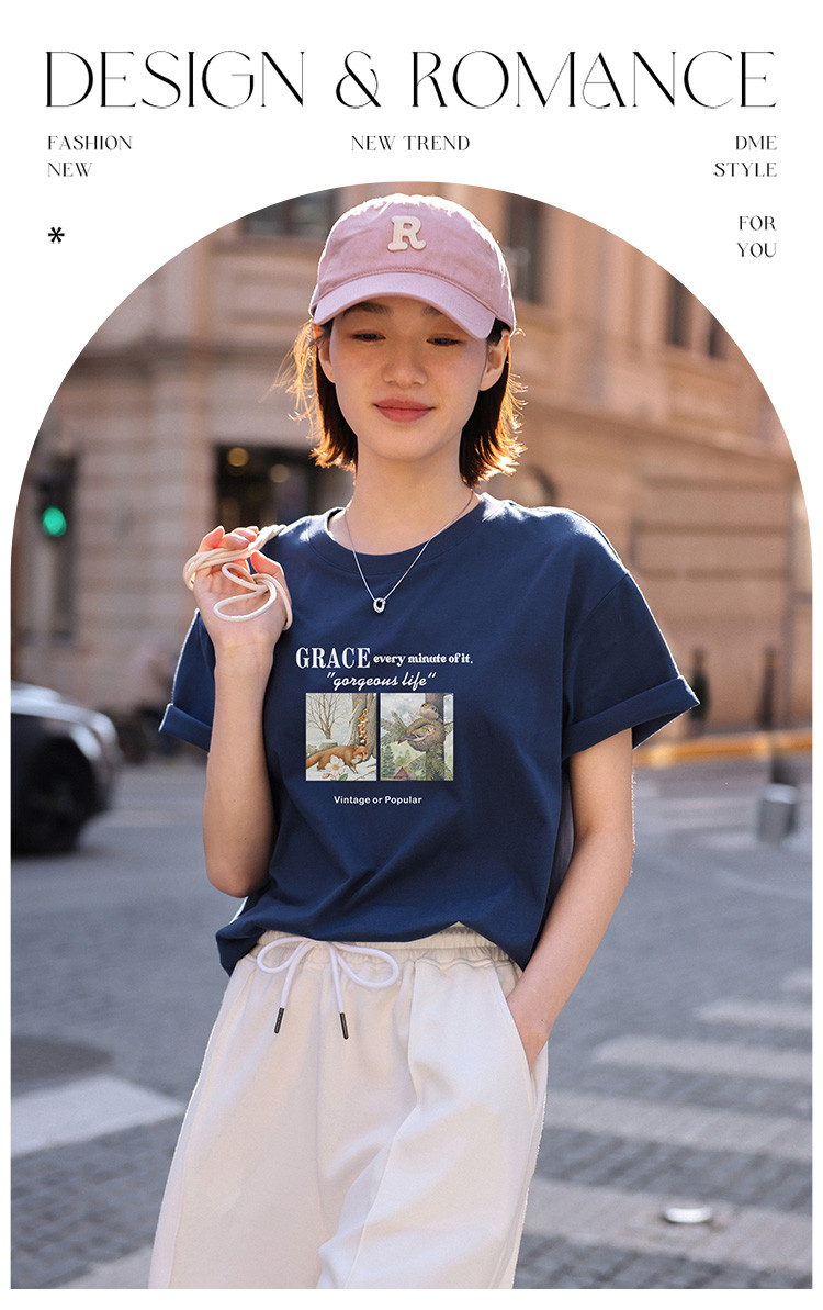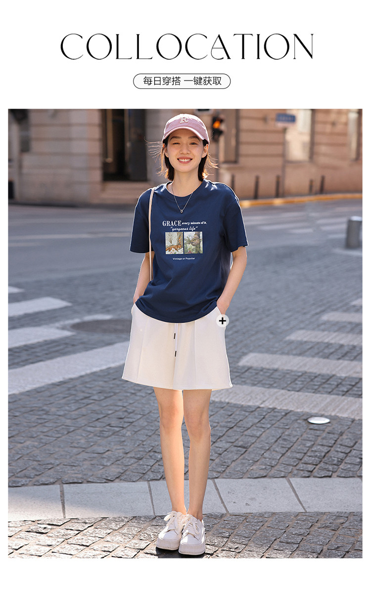 商品名称:【油画印花翻边短袖】夏款清新休闲风圆领短袖T恤女 608194