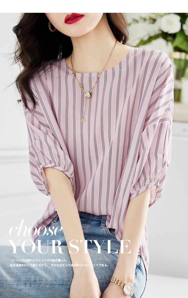 【线条美学】夏法式复古条纹衬衫丝滑柔润舒适雪纺藏肉衬衣女上衣 716353