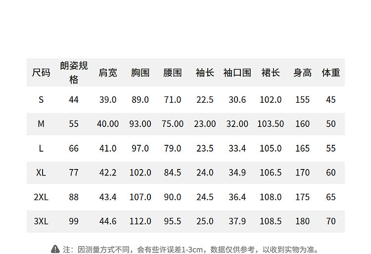 | 尺码 | 裙长(cm) | 肩宽(cm) | 腰围(cm) | 袖长(cm) | 胸围(cm) | 号型 |