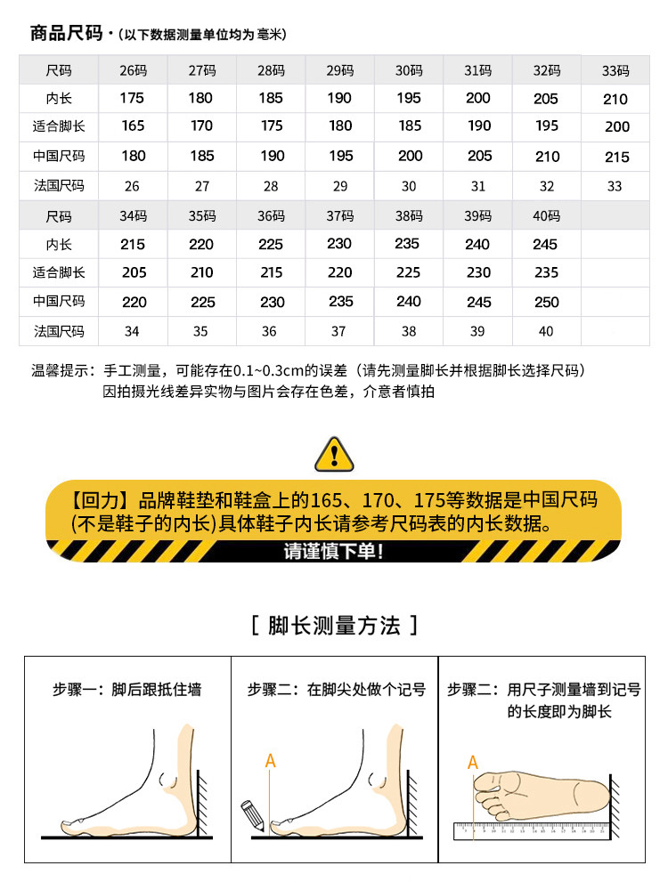 | 尺码 | 中国码 | 法国码 | 脚长(mm) | 鞋内长(mm) |