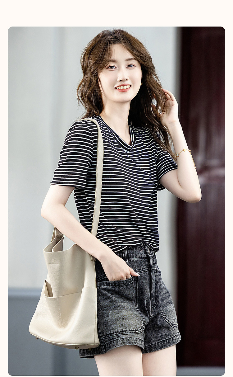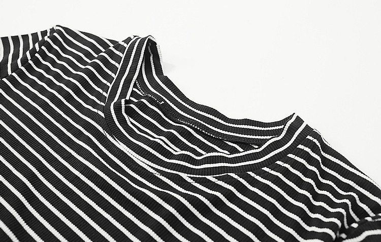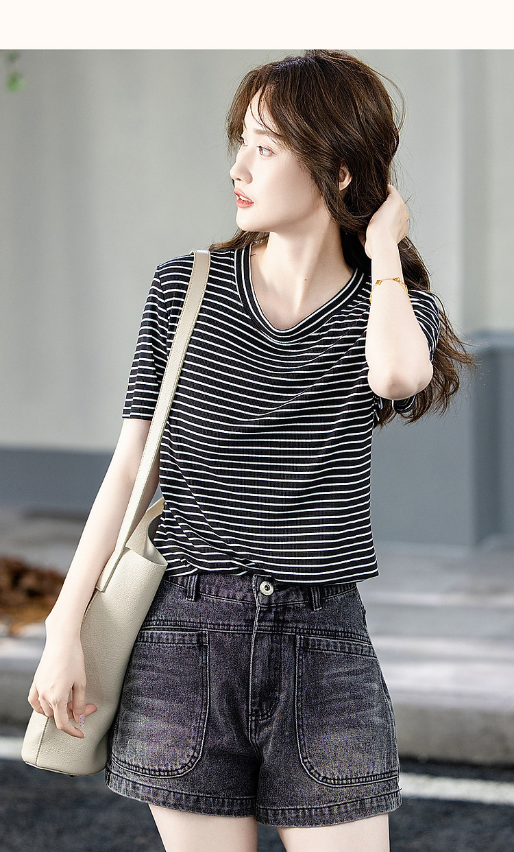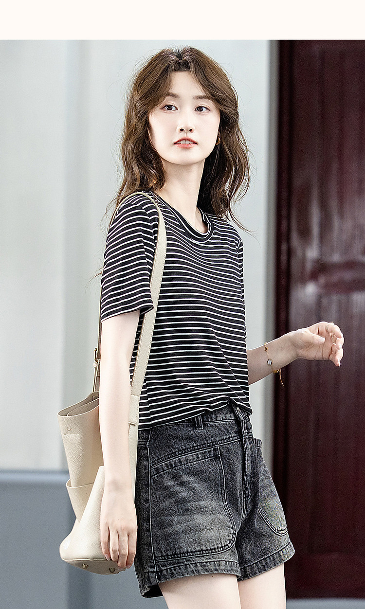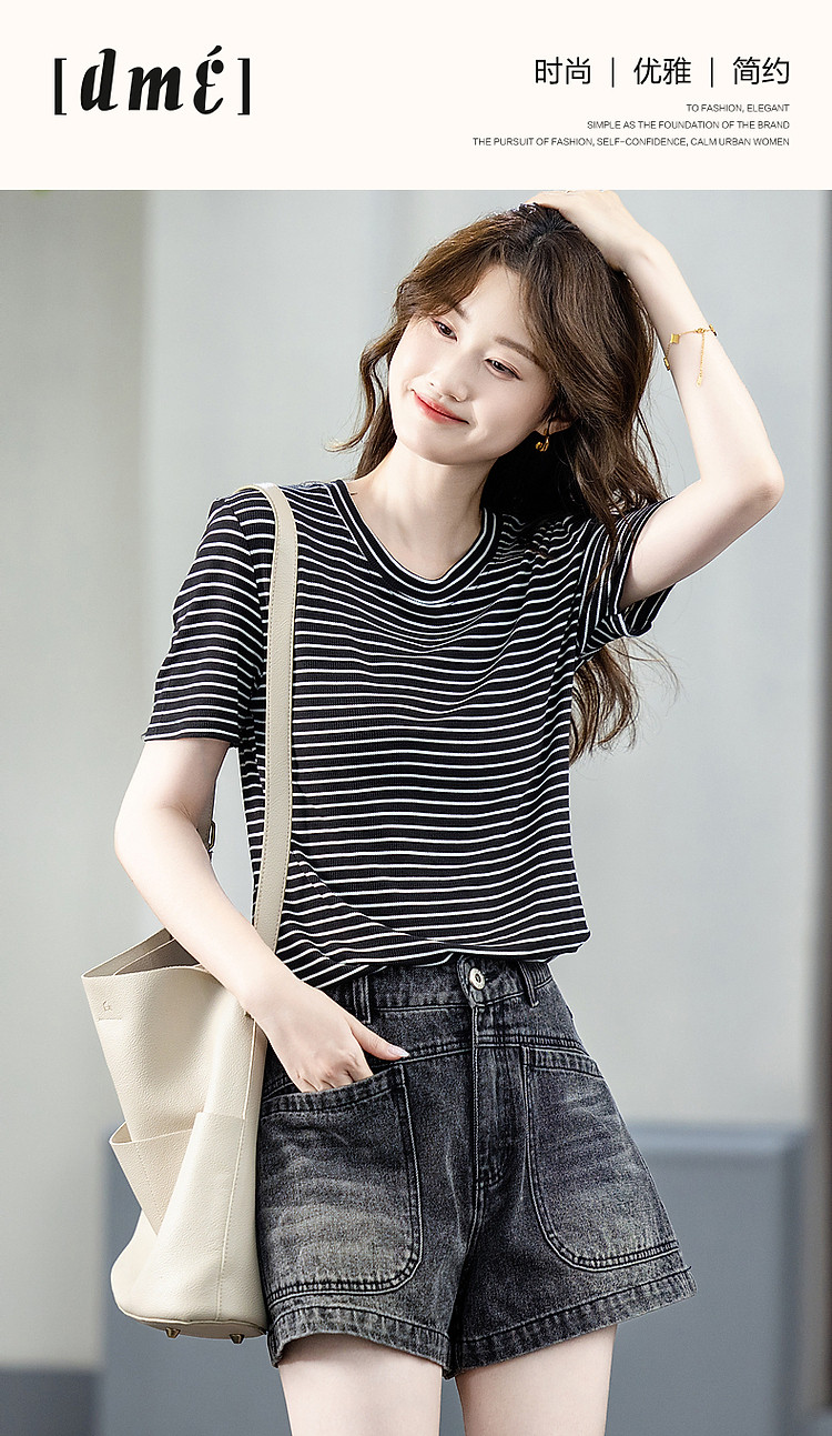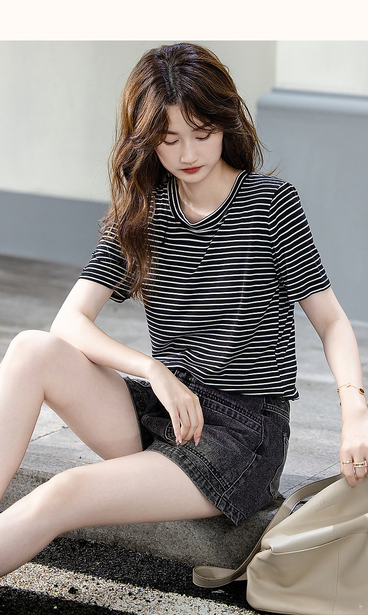 商品名称:【格雷系穿搭】夏简约风休闲圆领条纹短袖舒适藏肉女式t恤 711169