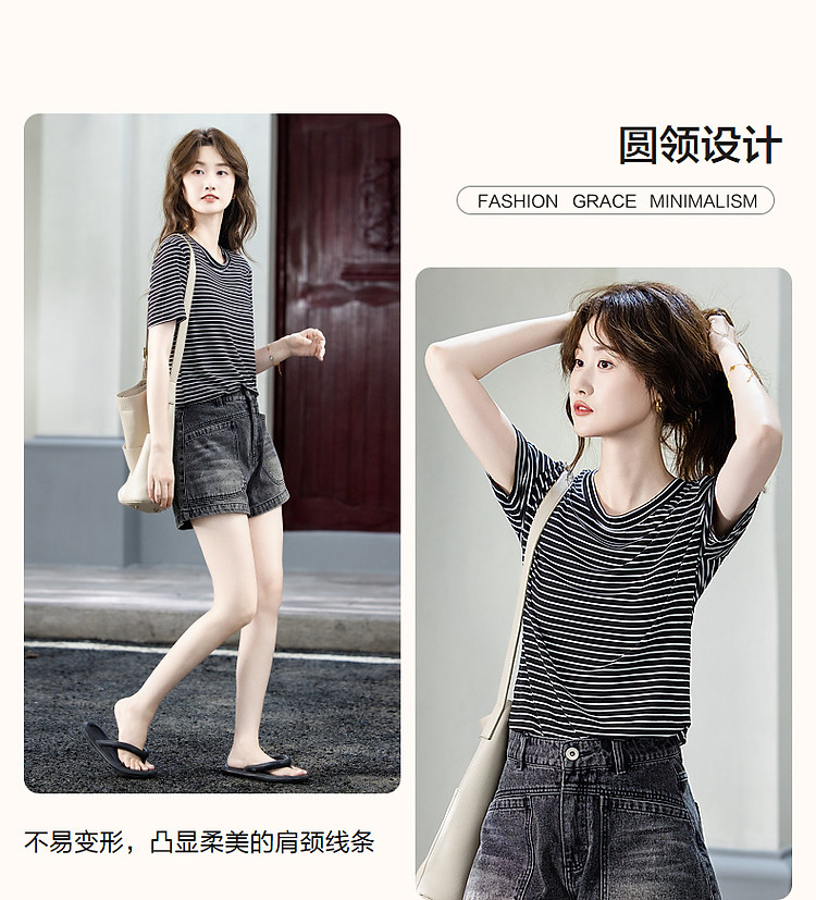 【格雷系穿搭】夏简约风休闲圆领条纹短袖舒适藏肉女式t恤 711169