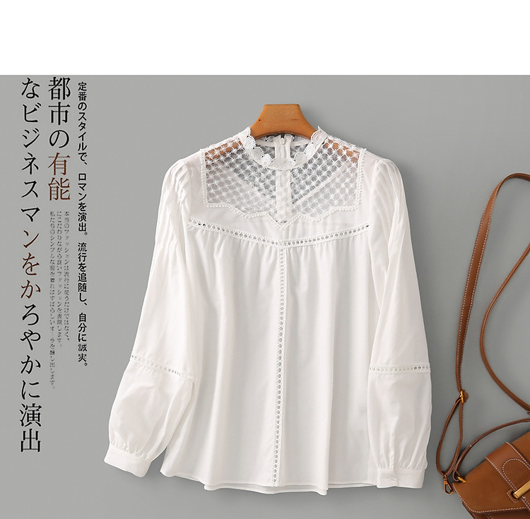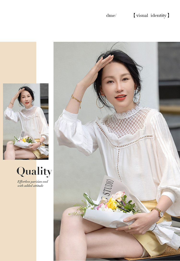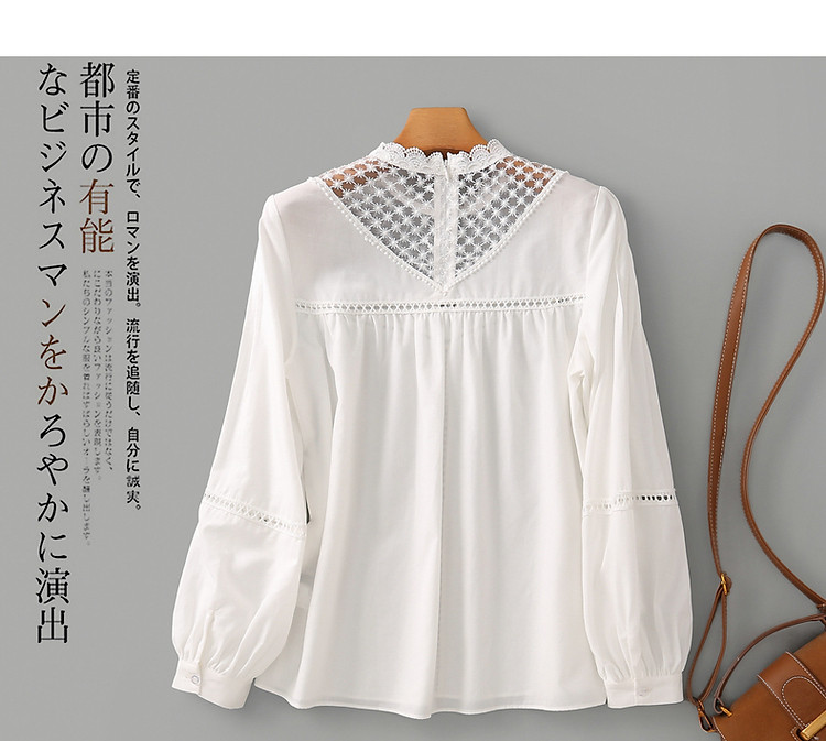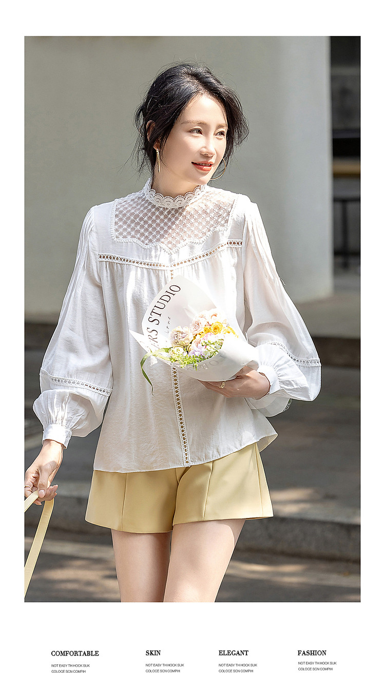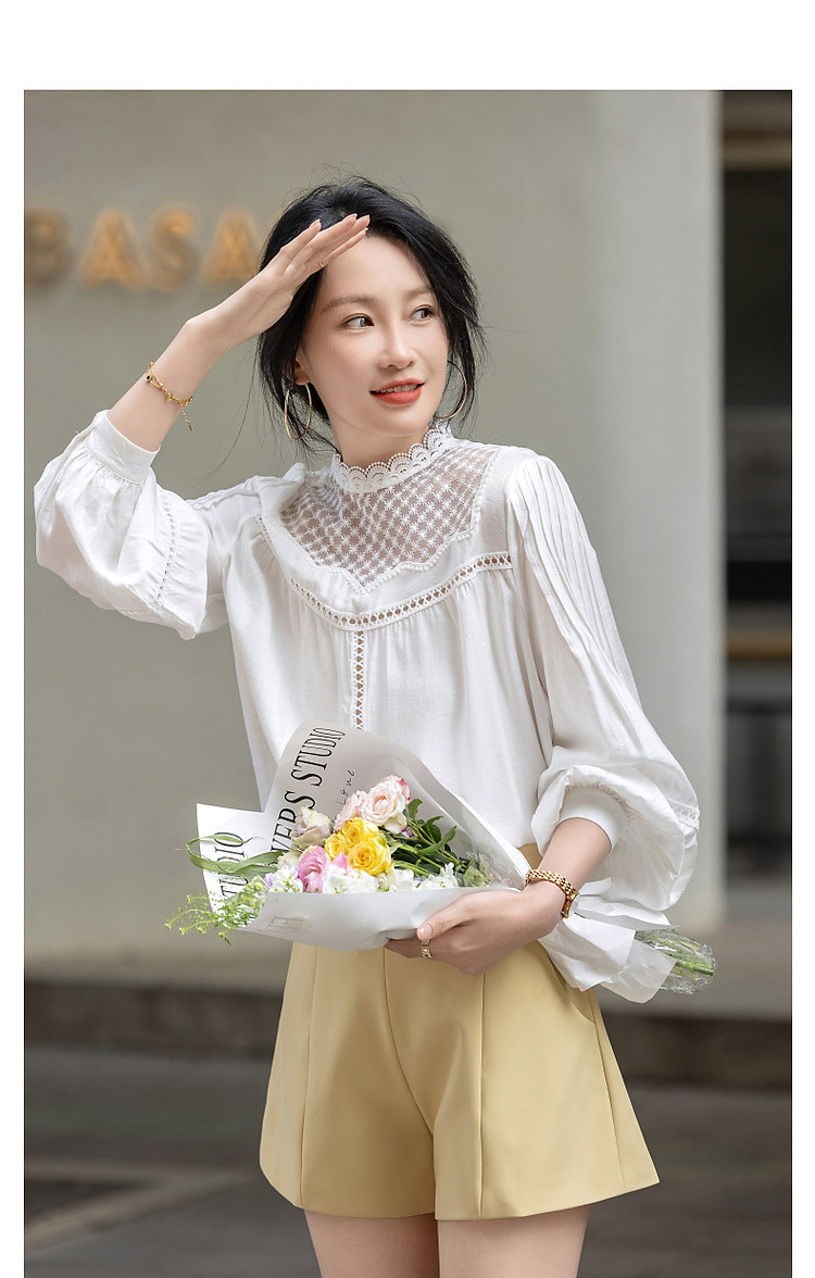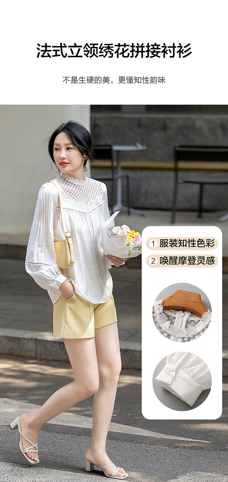 商品名称:【天使之吻】春秋法式立领一粒扣灯笼袖衬衫绣花拼接衬衣女上衣 891969