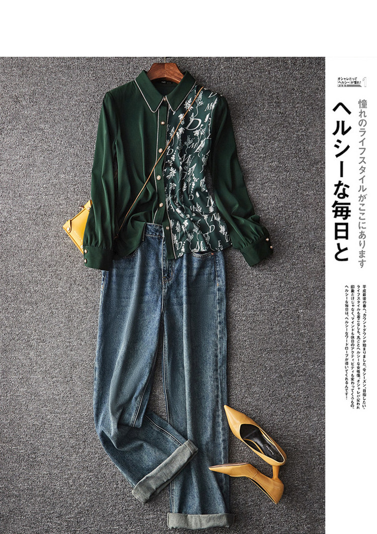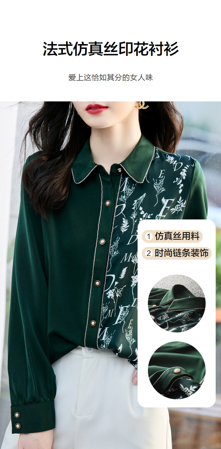 春秋新拼接翻领印花链条装饰衬衫女春秋季上衣 670017