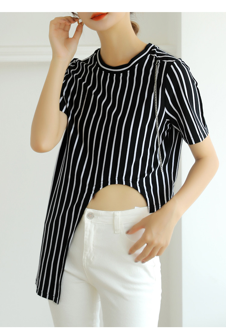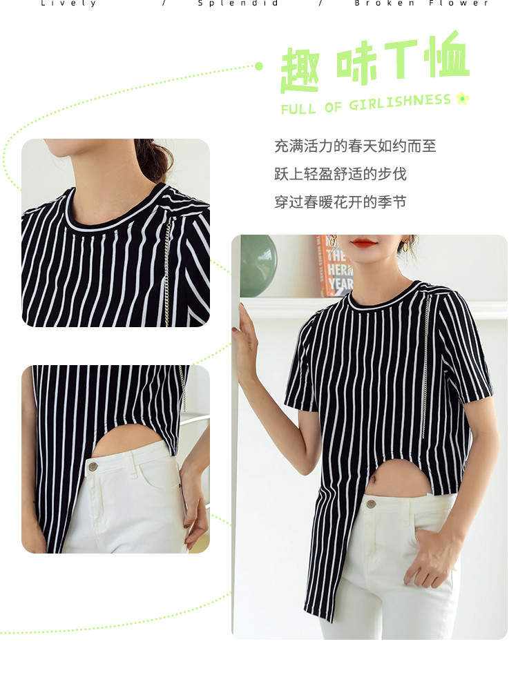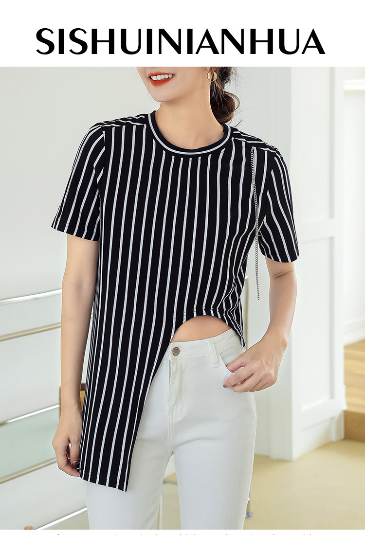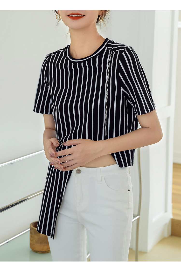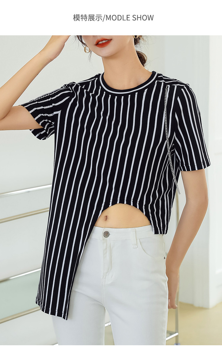 商品名称:夏季时尚宽松短袖t恤女设计感不规则下摆竖条纹圆领上衣 348632
