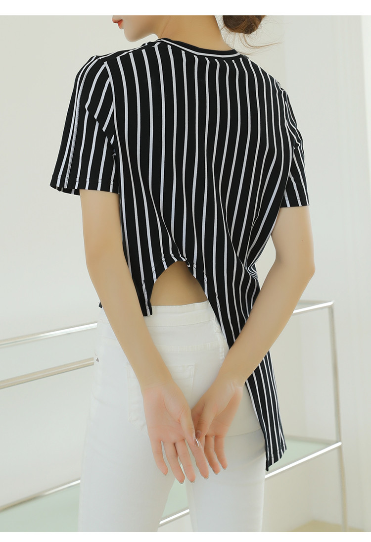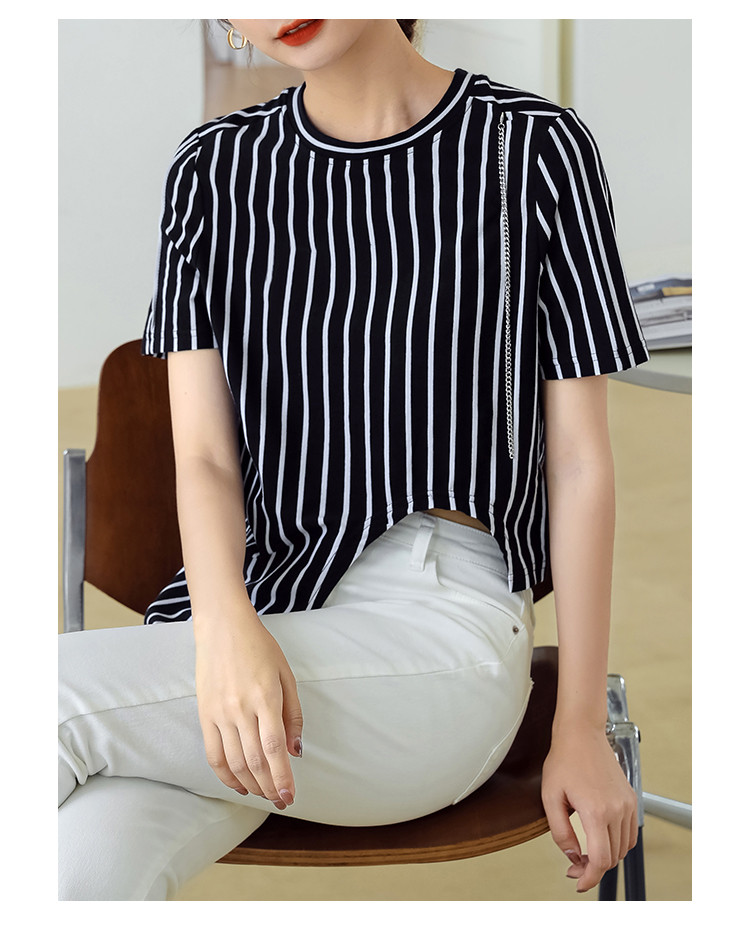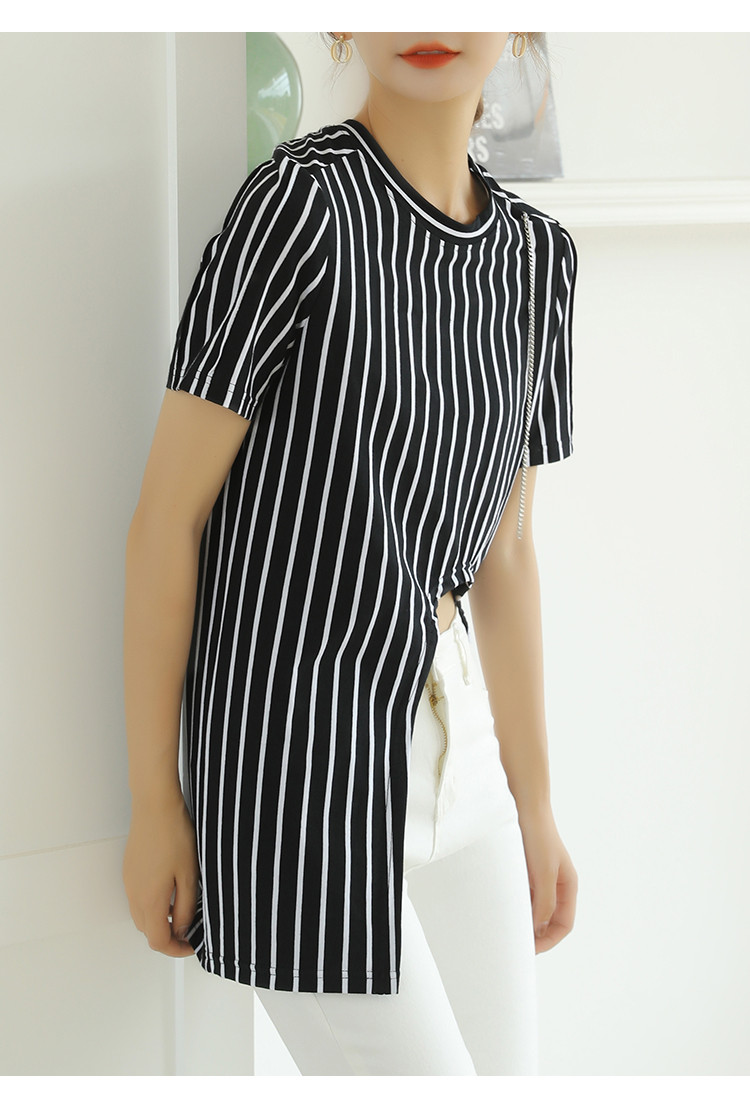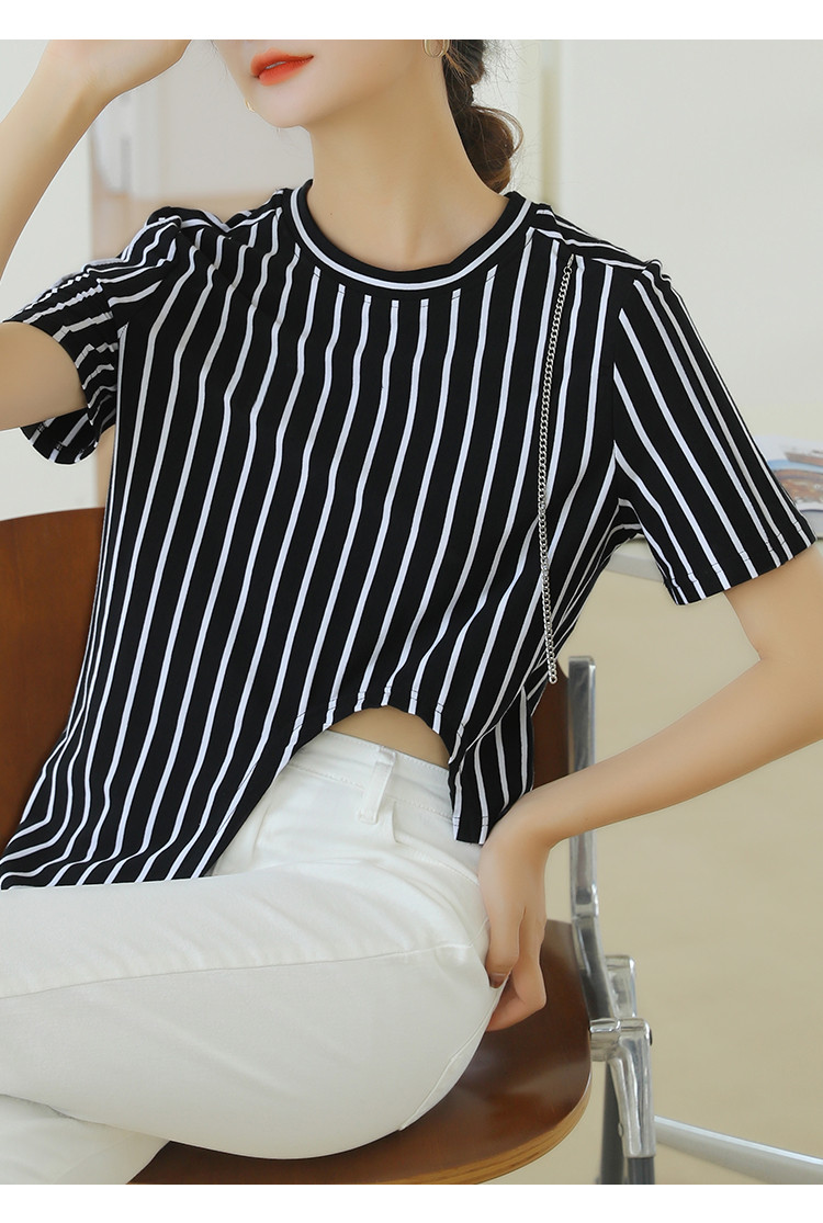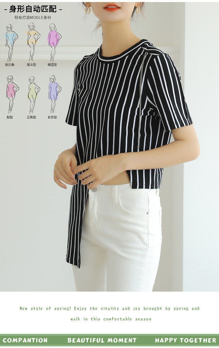 商品名称:夏季时尚宽松短袖t恤女设计感不规则下摆竖条纹圆领上衣 348632
