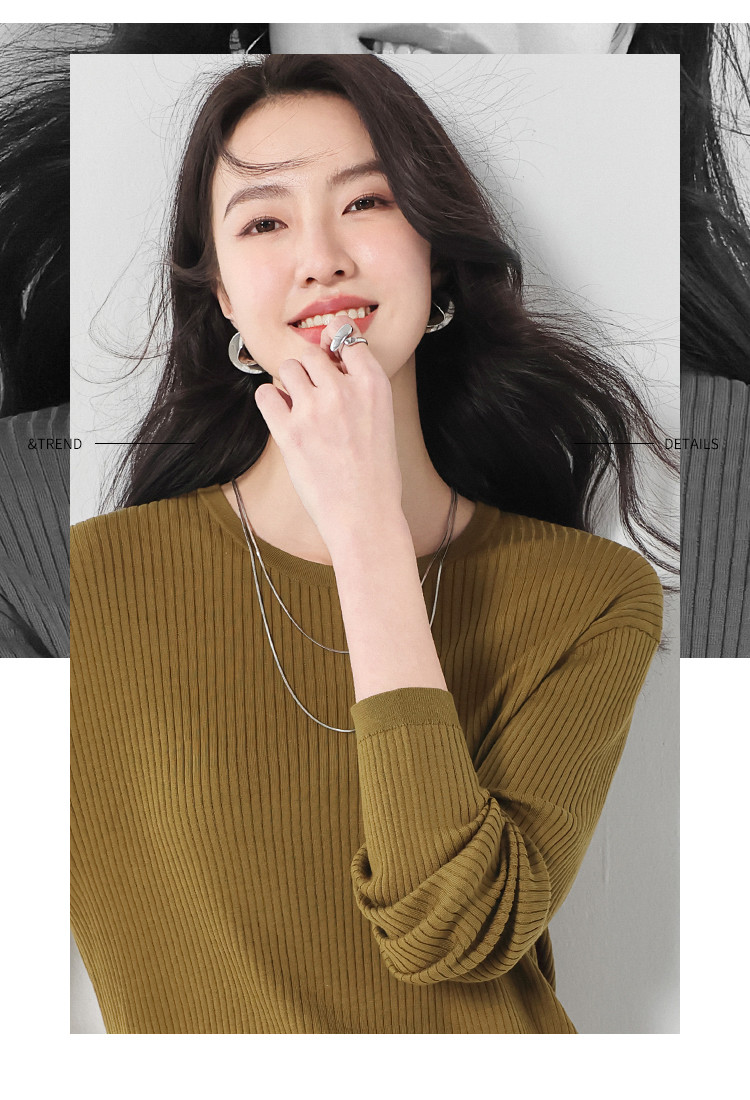 春款轻薄透气含桑蚕丝纯色坑条圆领基础针织打底衫长袖T恤针织衫 997331