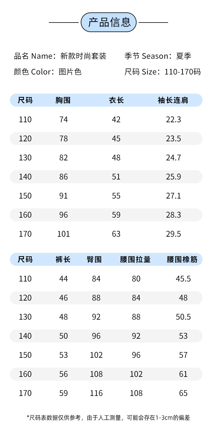 | 尺码 | 袖长(cm) | 上装号型 | 适合年龄 | 下装号型 | 衣长(cm) | 身高(cm) | 腰围(cm) | 裤长(cm) | 臀围(cm) | 胸围(cm) | 号型 |