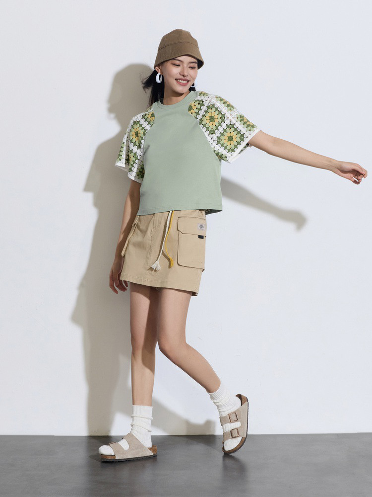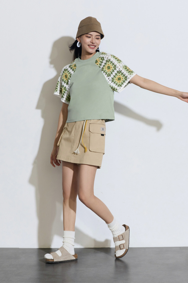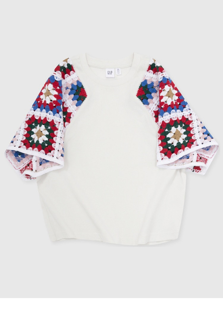 Gap女装夏季洋气拼接钩花短袖T恤宽松时尚圆领上衣874528 225306