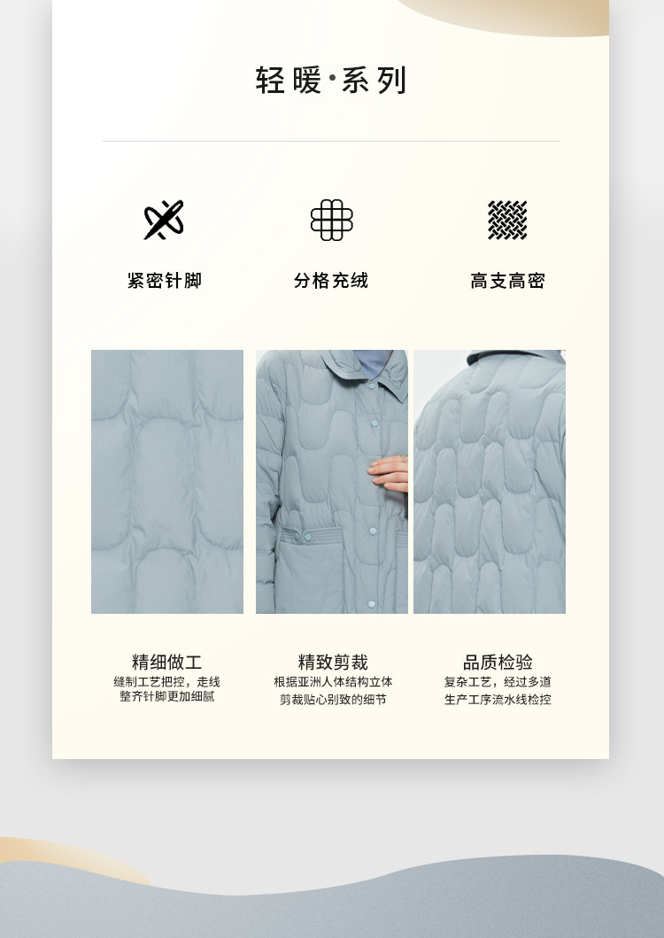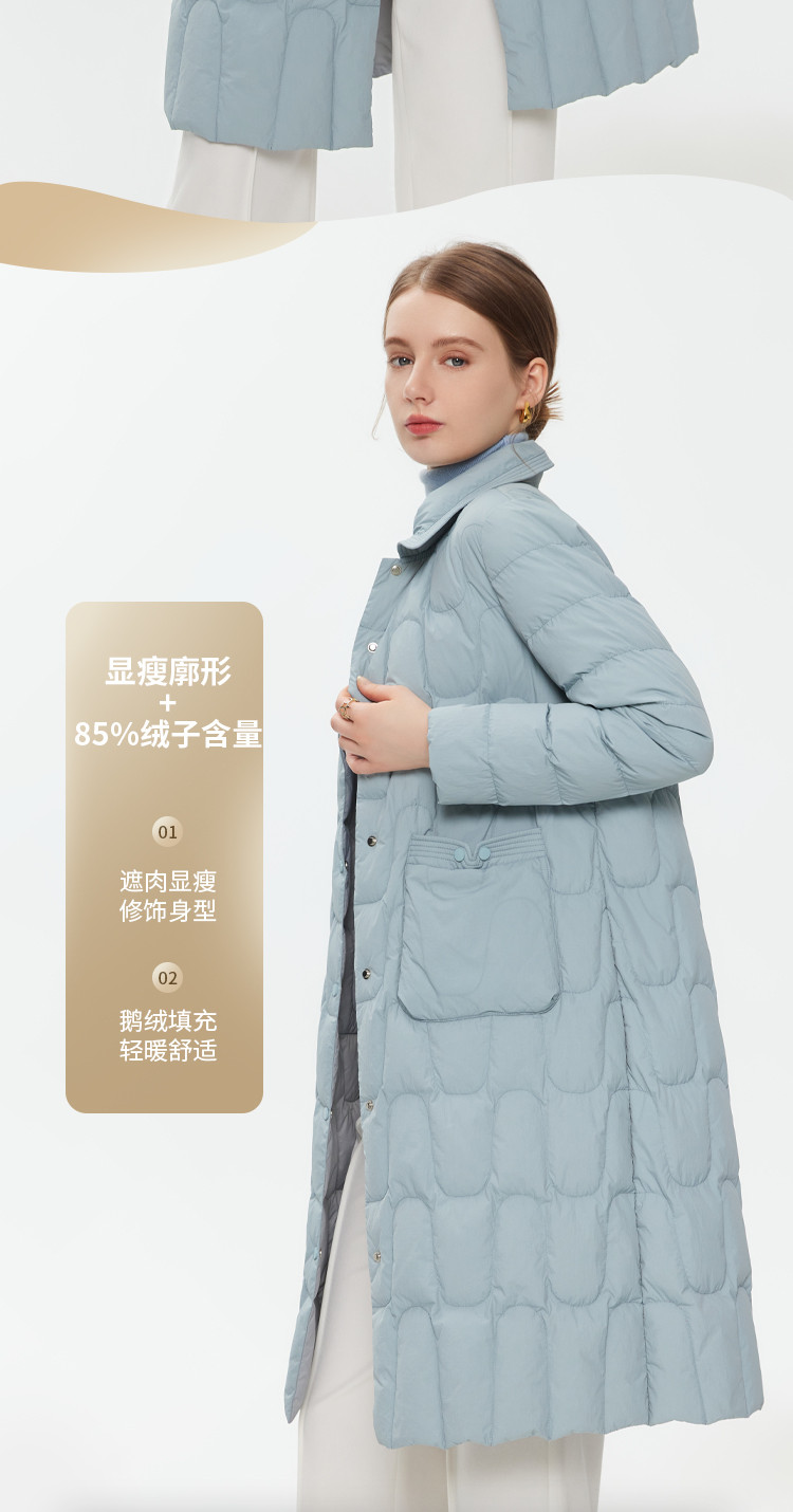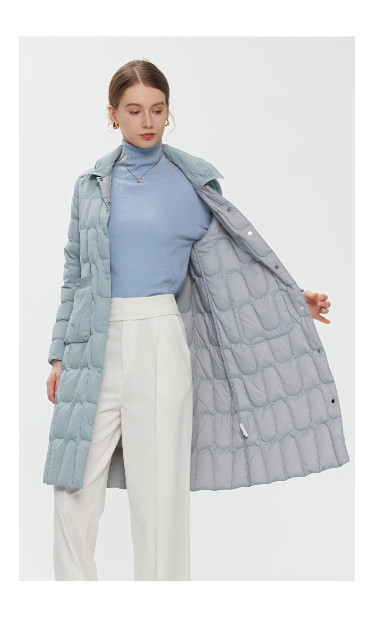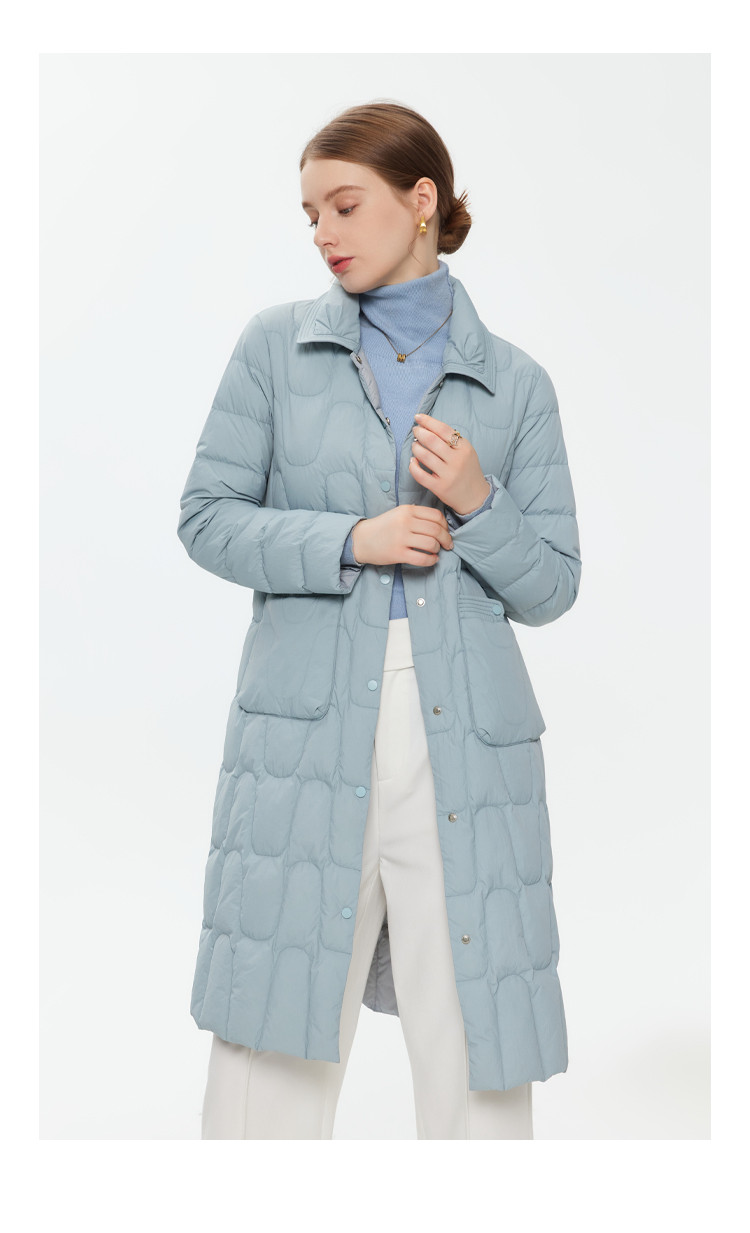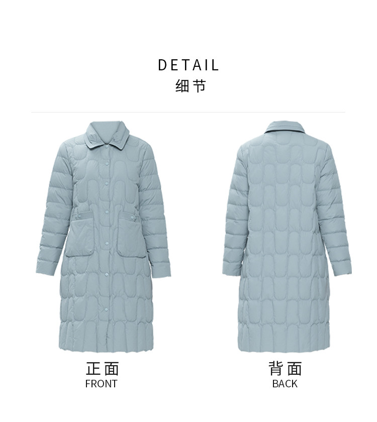 商品名称:【鹅绒】莫兰迪色系轻薄蓄暖小翻领直筒中长羽绒服 439519