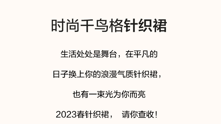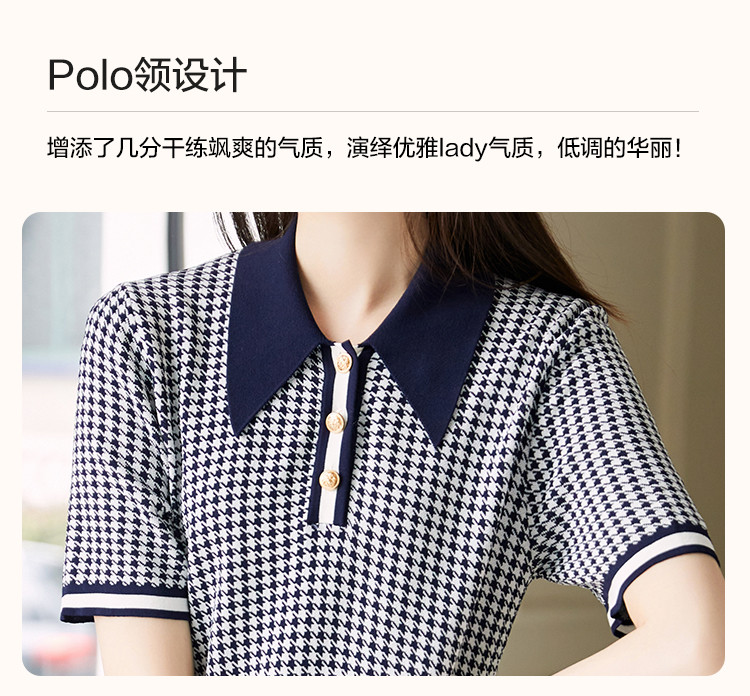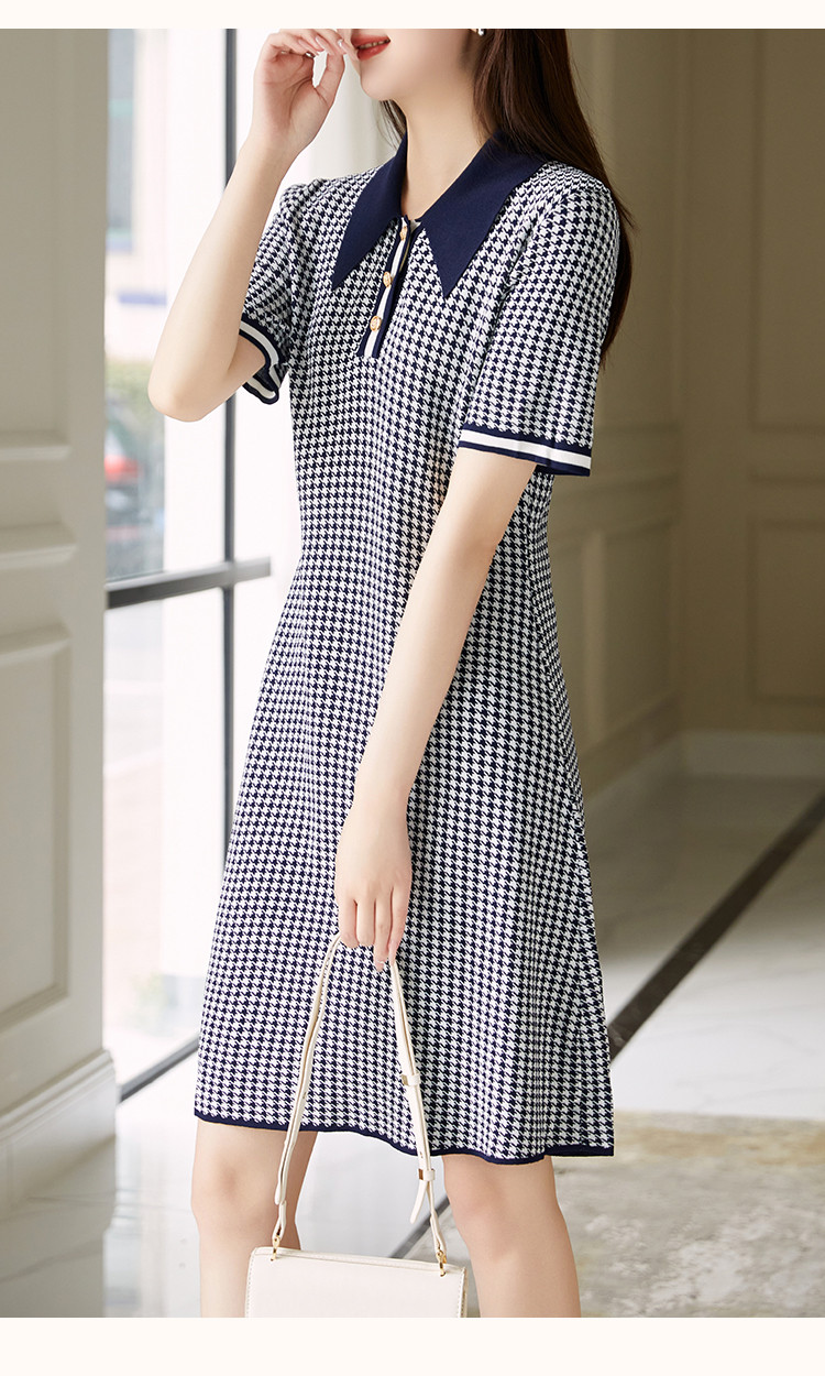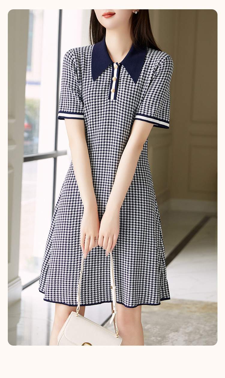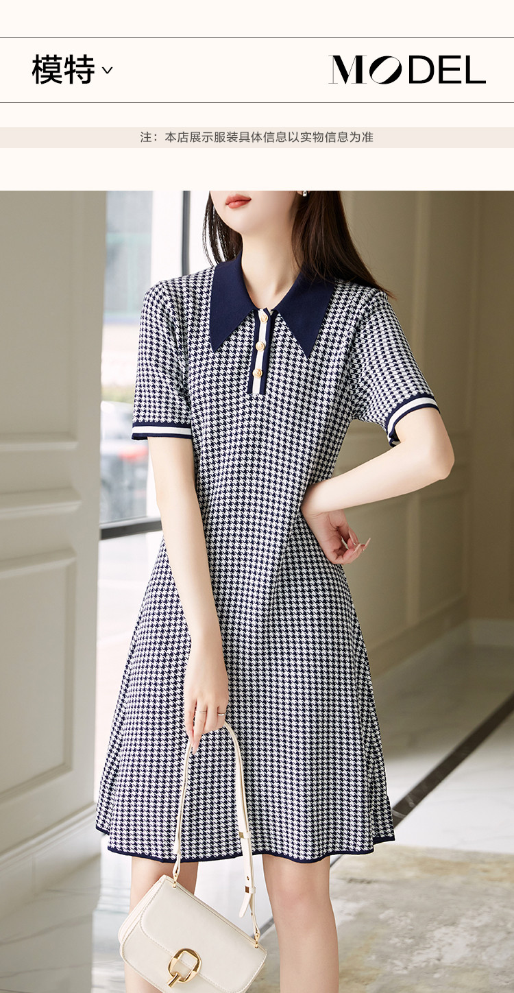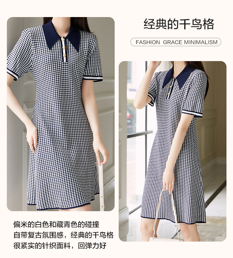 商品名称:【千鸟格针织裙】早秋气质名媛风翻领可内搭A字短袖连衣裙女 521345