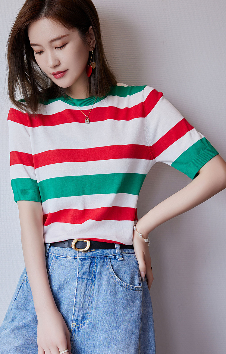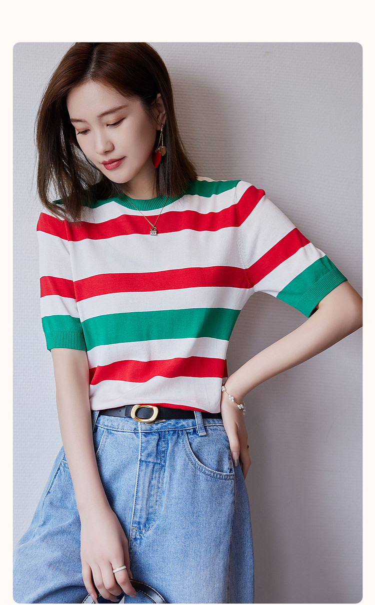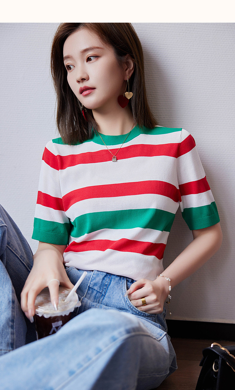 【复古撞色条纹线衫】夏季圆领短袖针织衫女上衣 339841