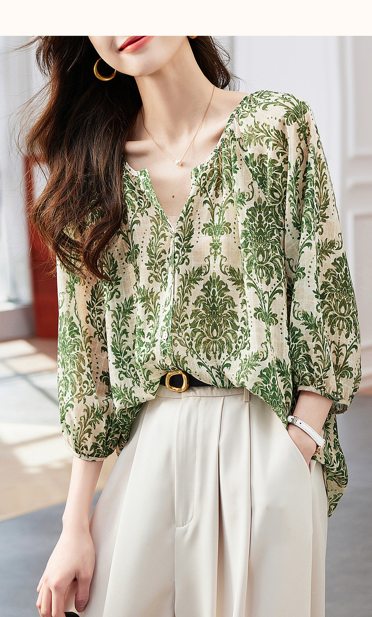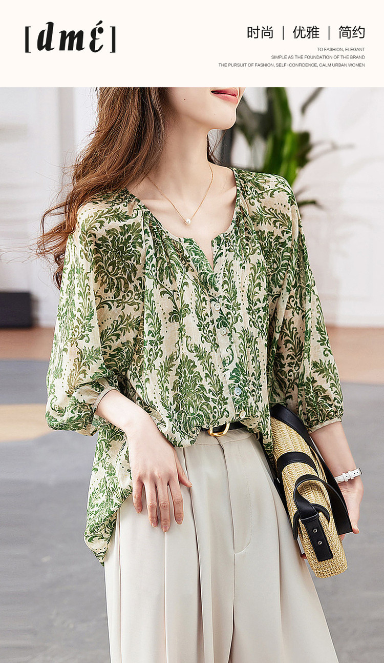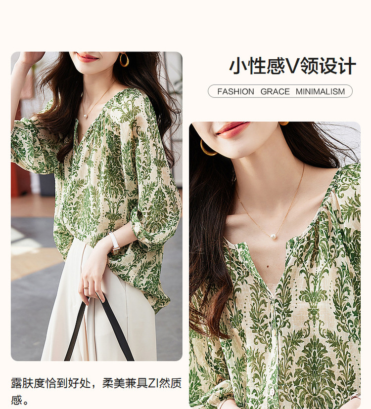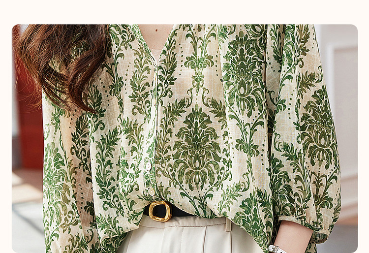 商品名称:【通勤抽褶印花衬衫】夏V领短袖雪纺衬衣女装上衣 989441