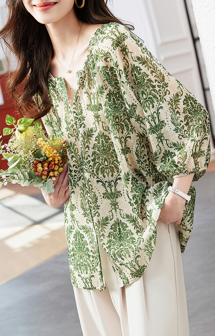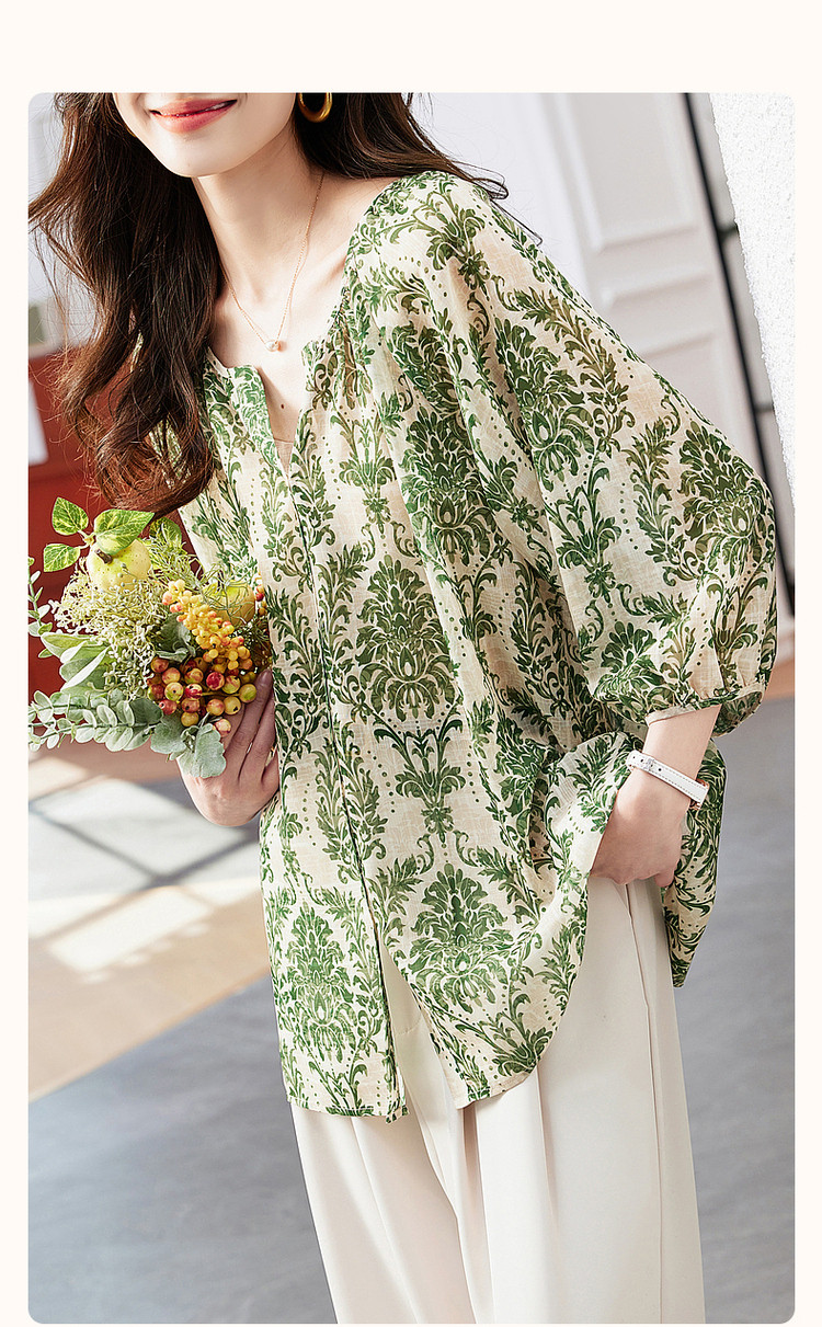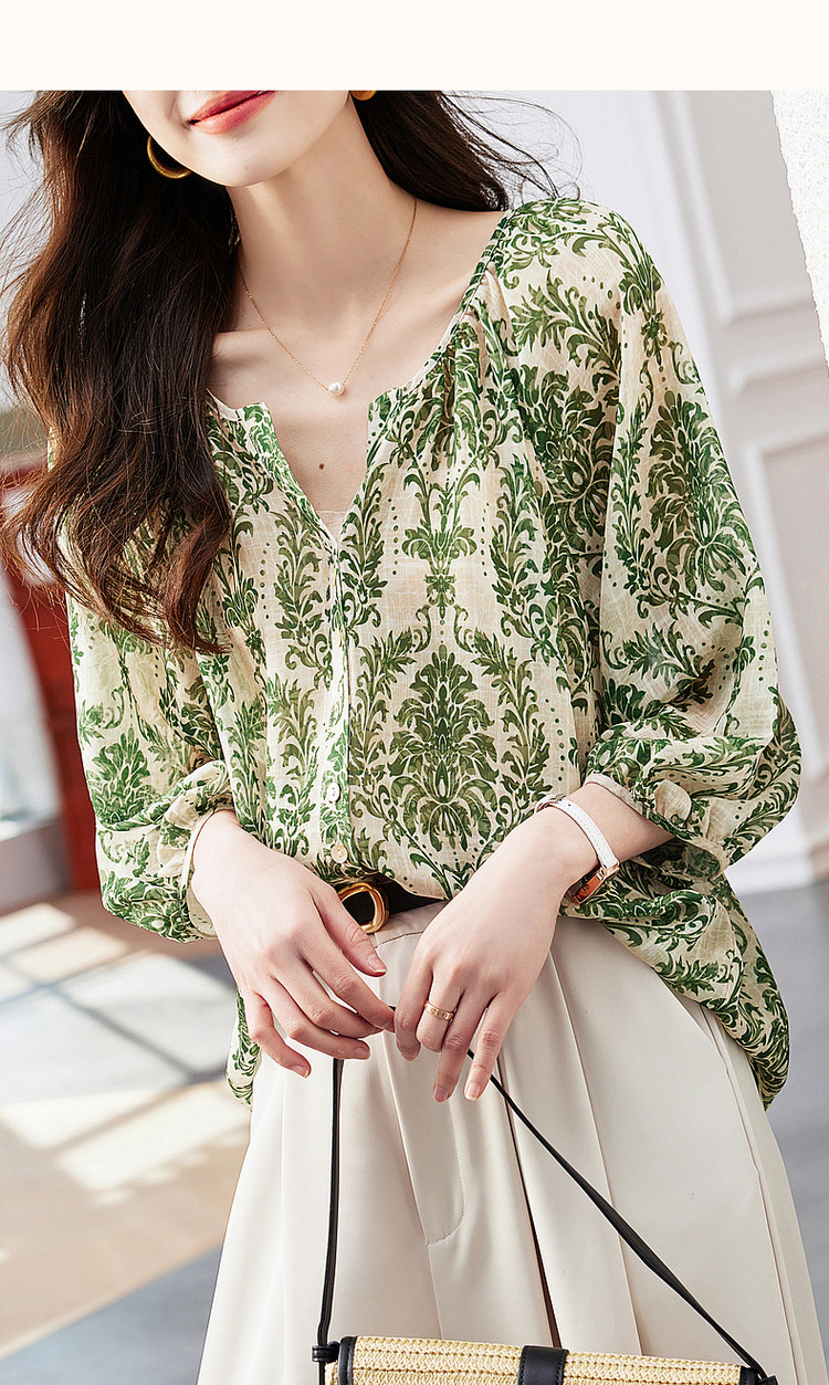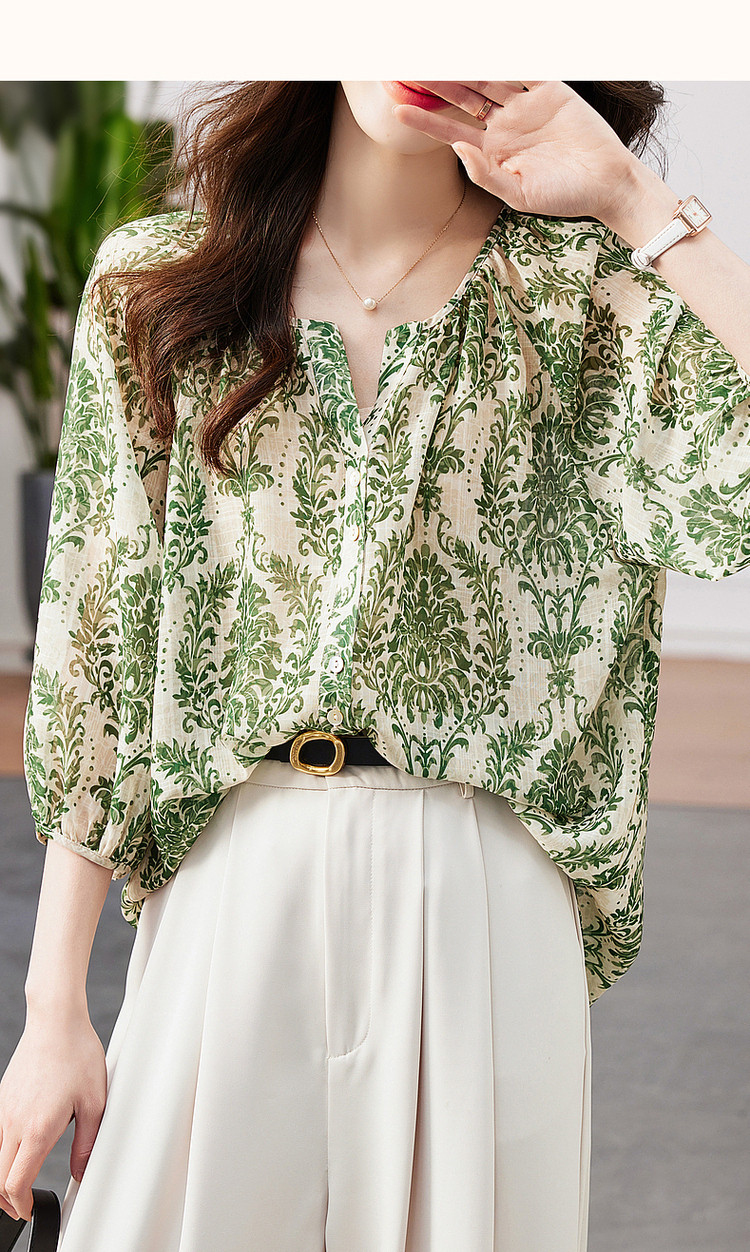 商品名称:【通勤抽褶印花衬衫】夏V领短袖雪纺衬衣女装上衣 989441