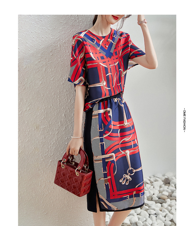 【印花套装】夏季圆领宽松短袖上衣开衩半裙套装女时尚 405377