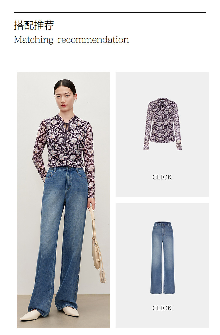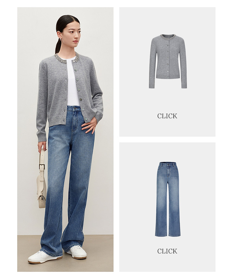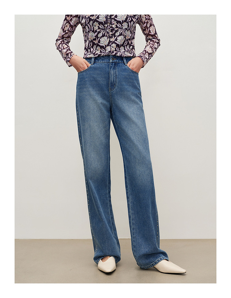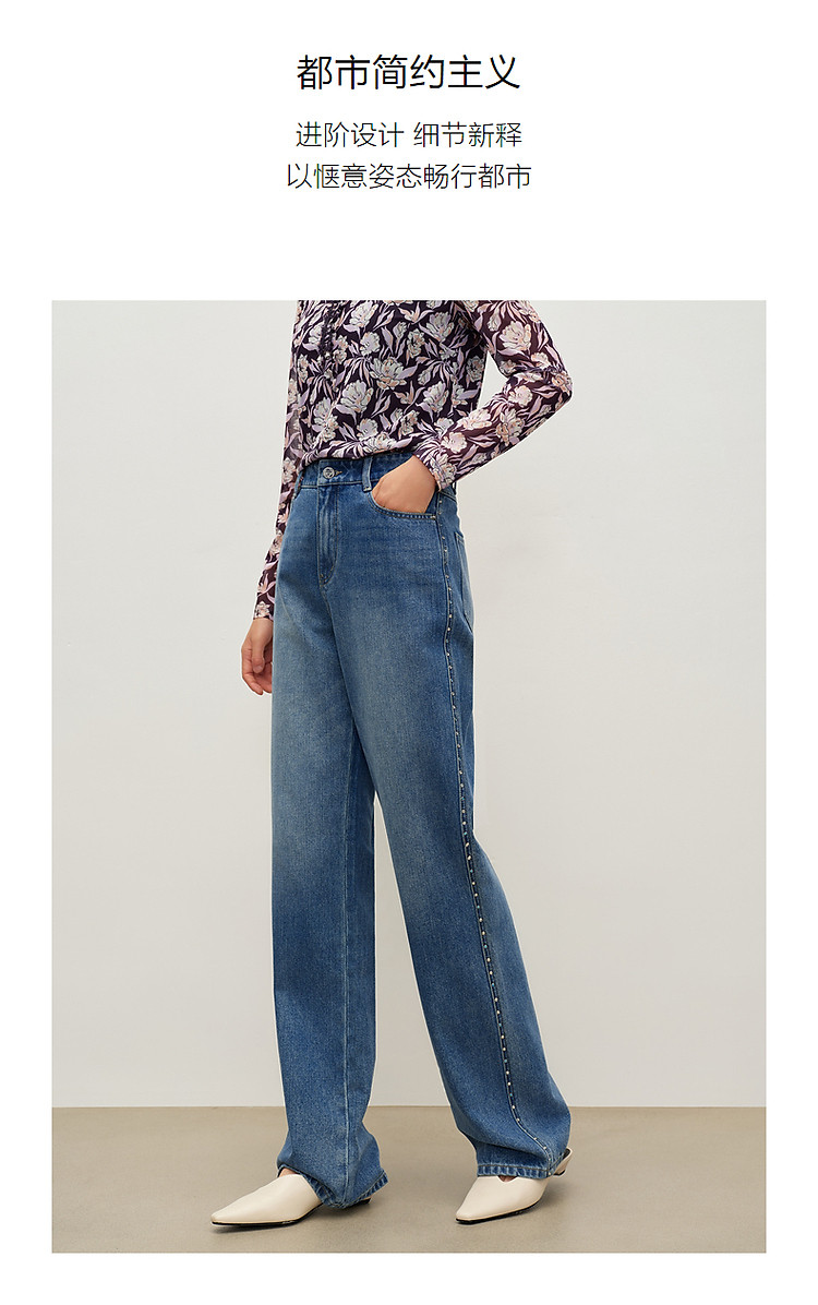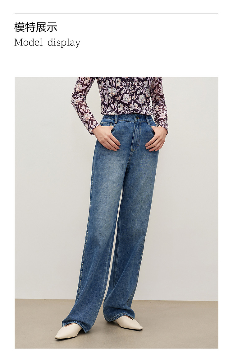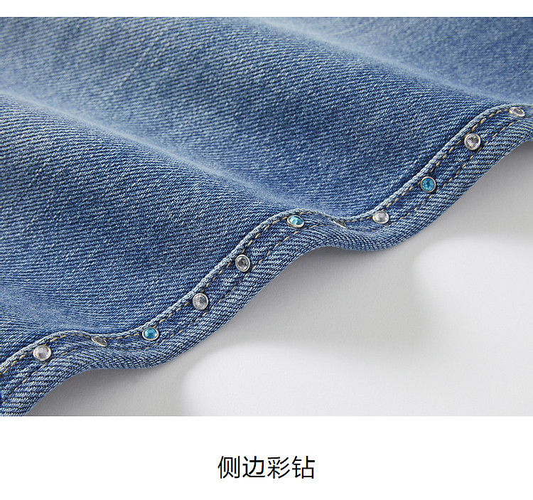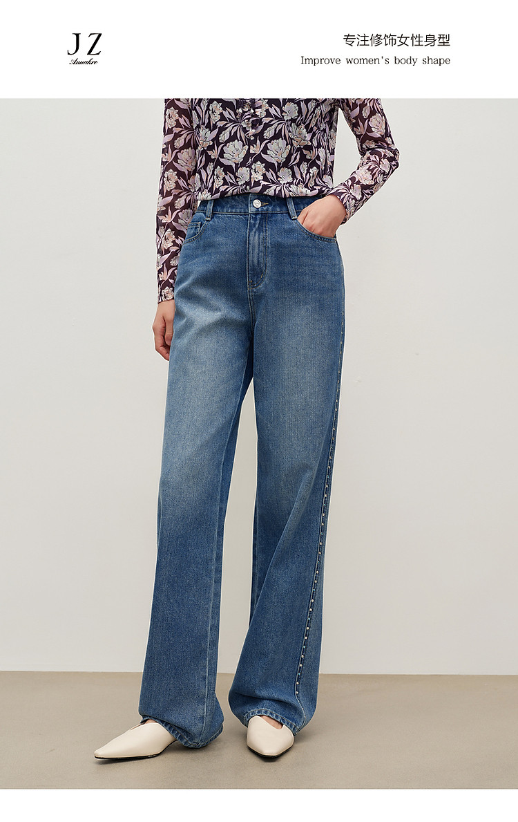 商品名称:玖姿旗下安娜蔻系列时髦设计感侧边彩钻水洗直筒牛仔裤女秋季 512652