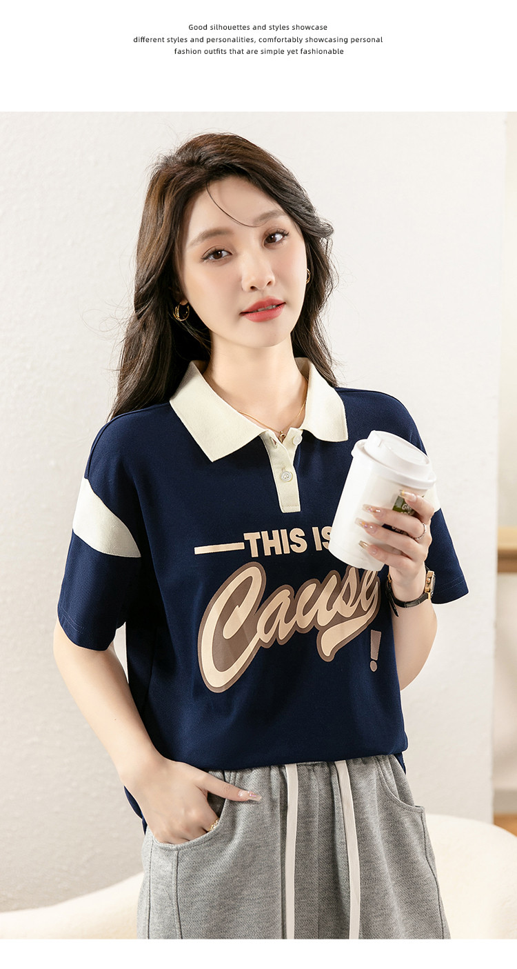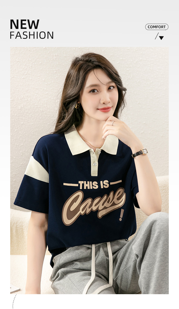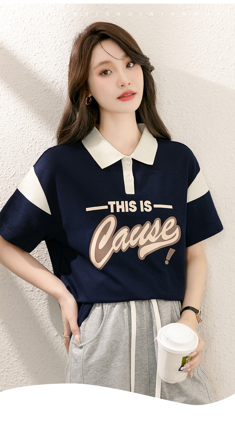 商品名称:设计感撞色POLO领上衣女印花时尚宽松休闲显瘦短袖T恤女 928088