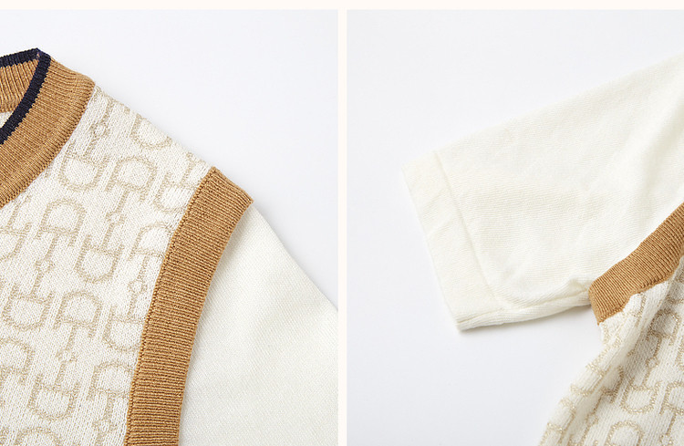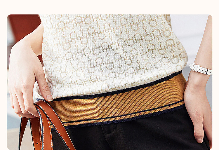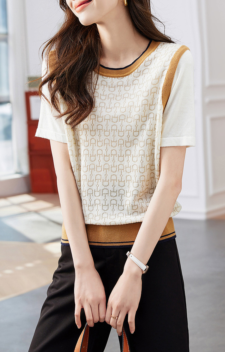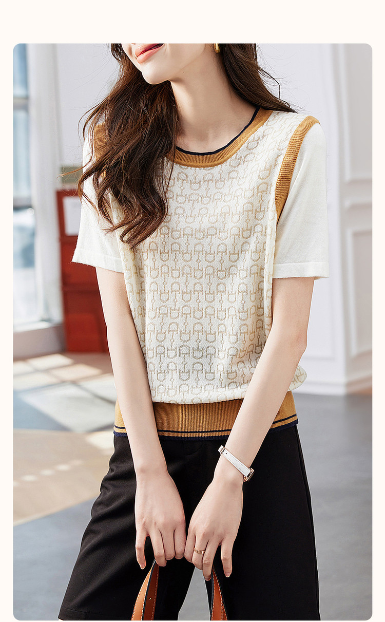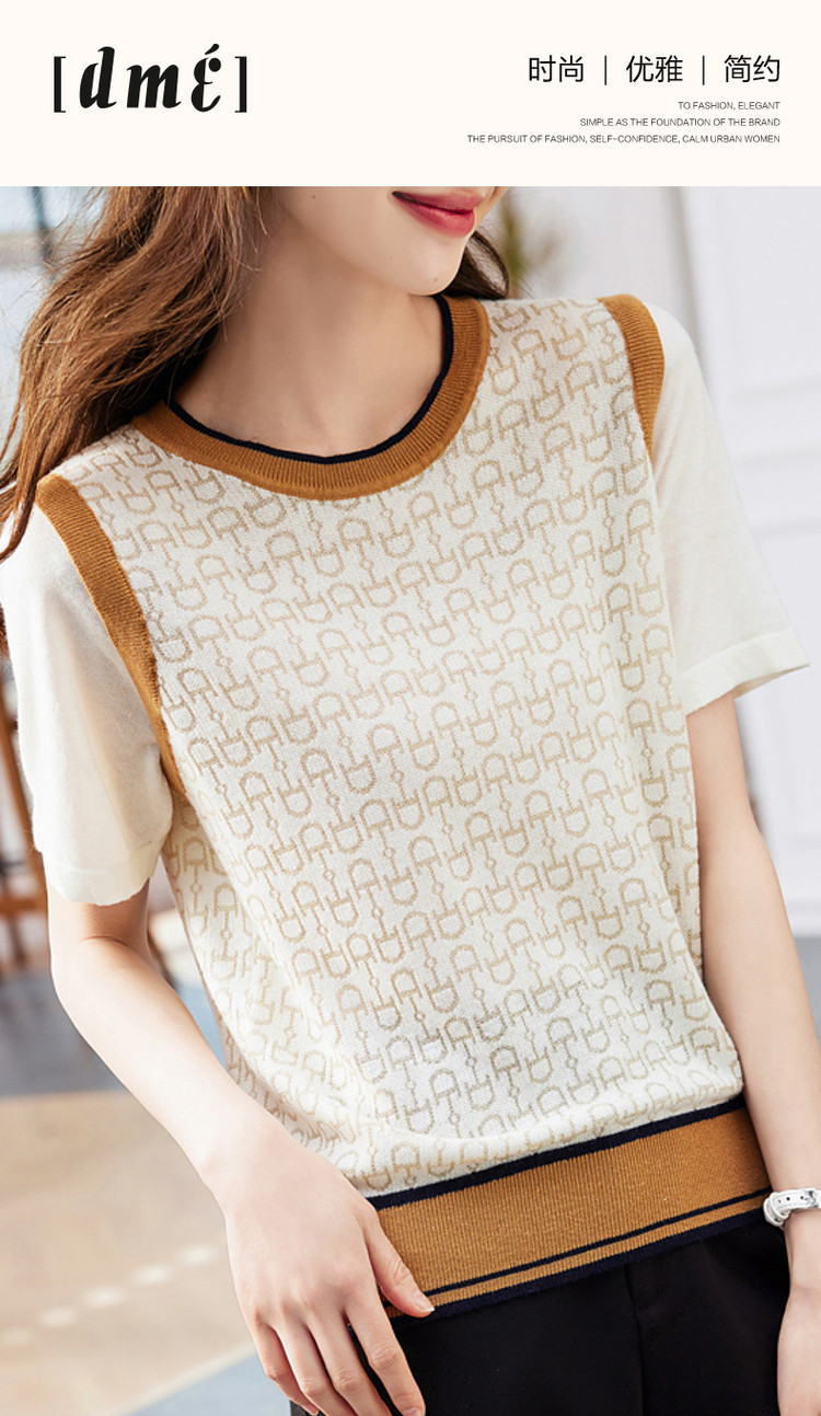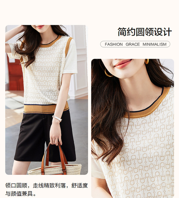 商品名称:【通勤几何拼色线衫】夏圆领微弹短袖针织衫女上衣 776449