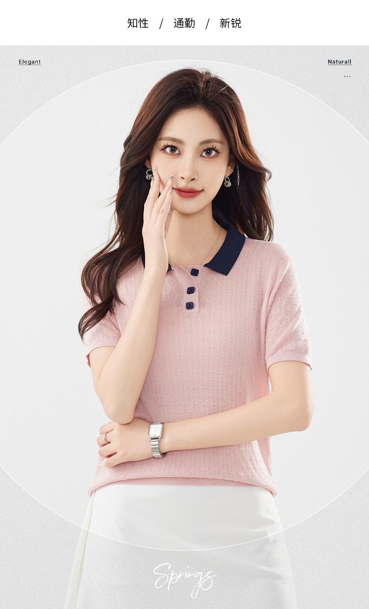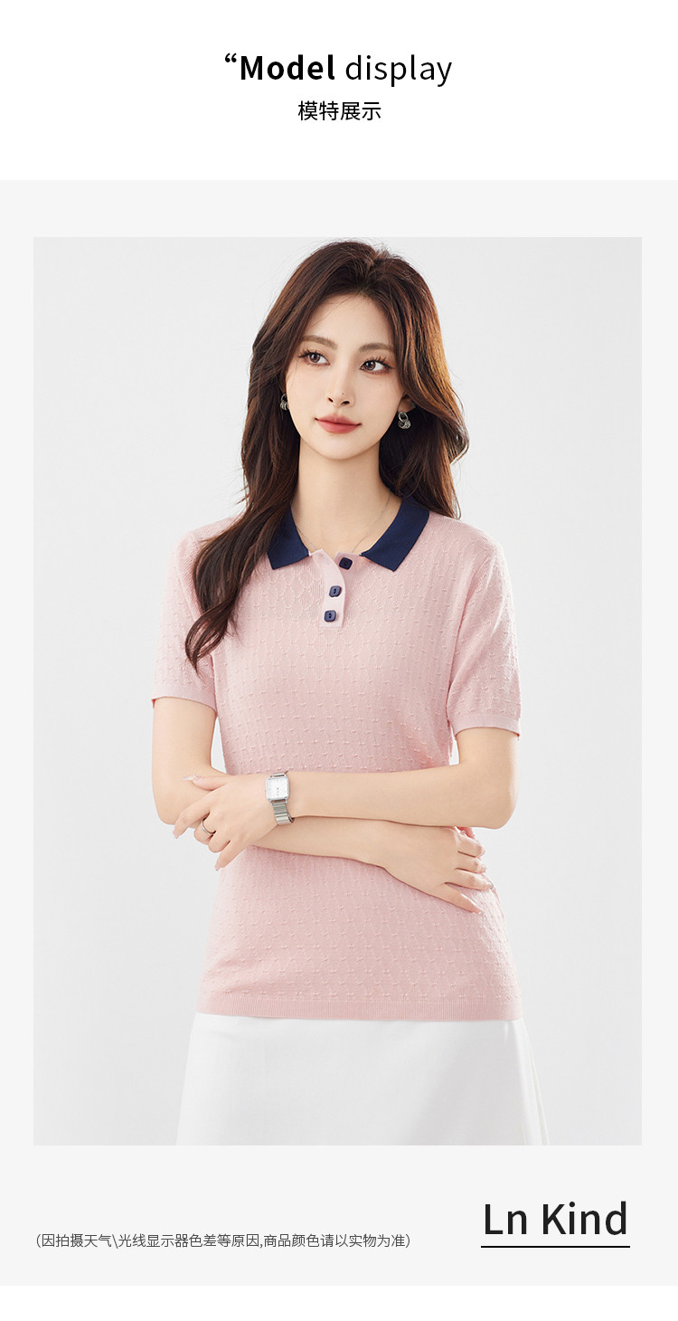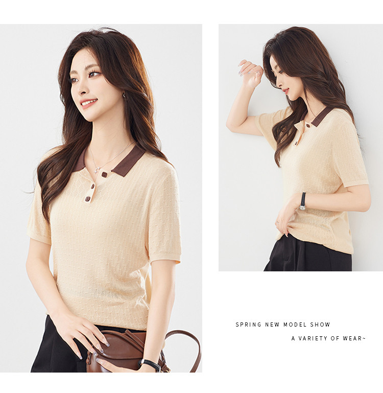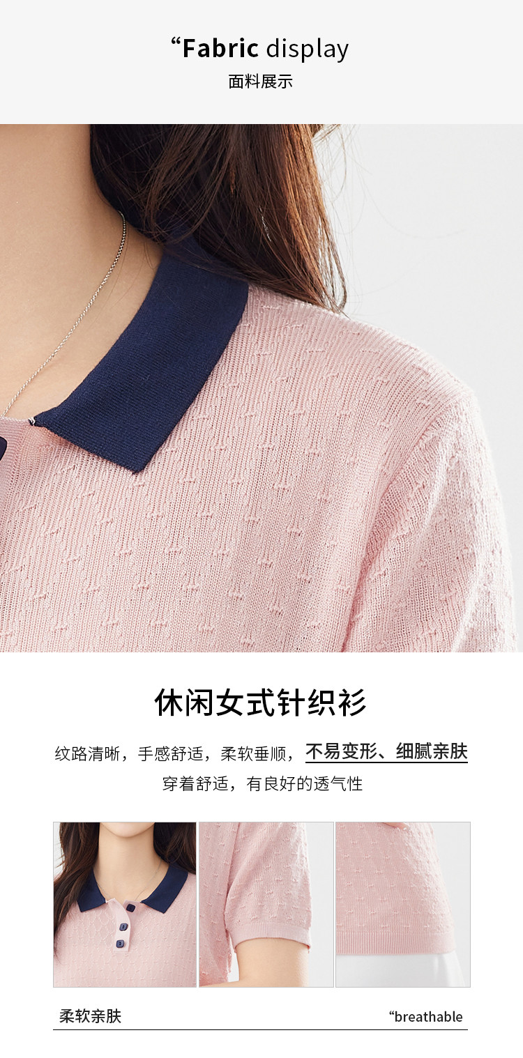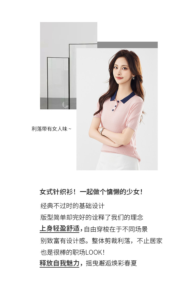 商品名称:【100%莱赛尔】简约高级感撞色翻领针织衫休闲百搭短款上衣女 320607
