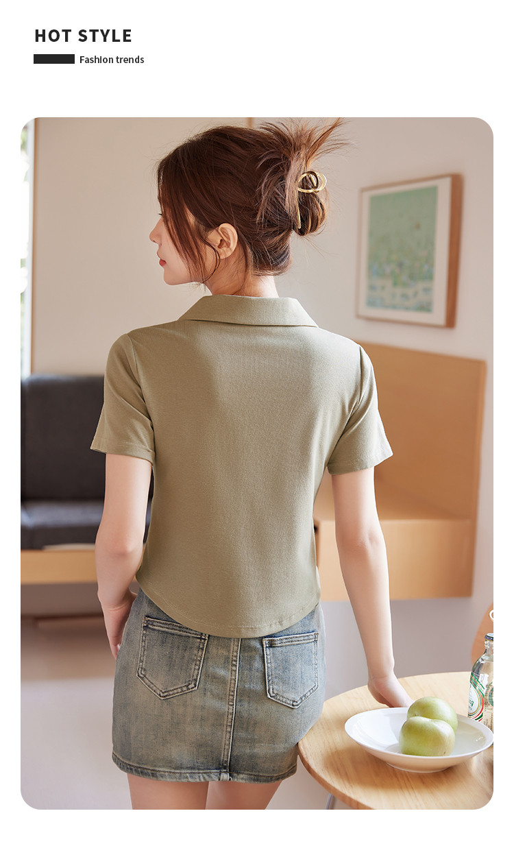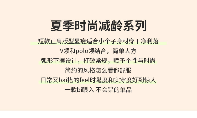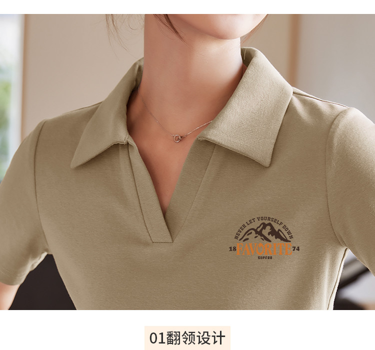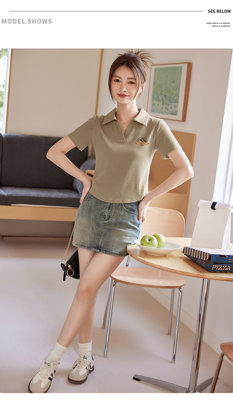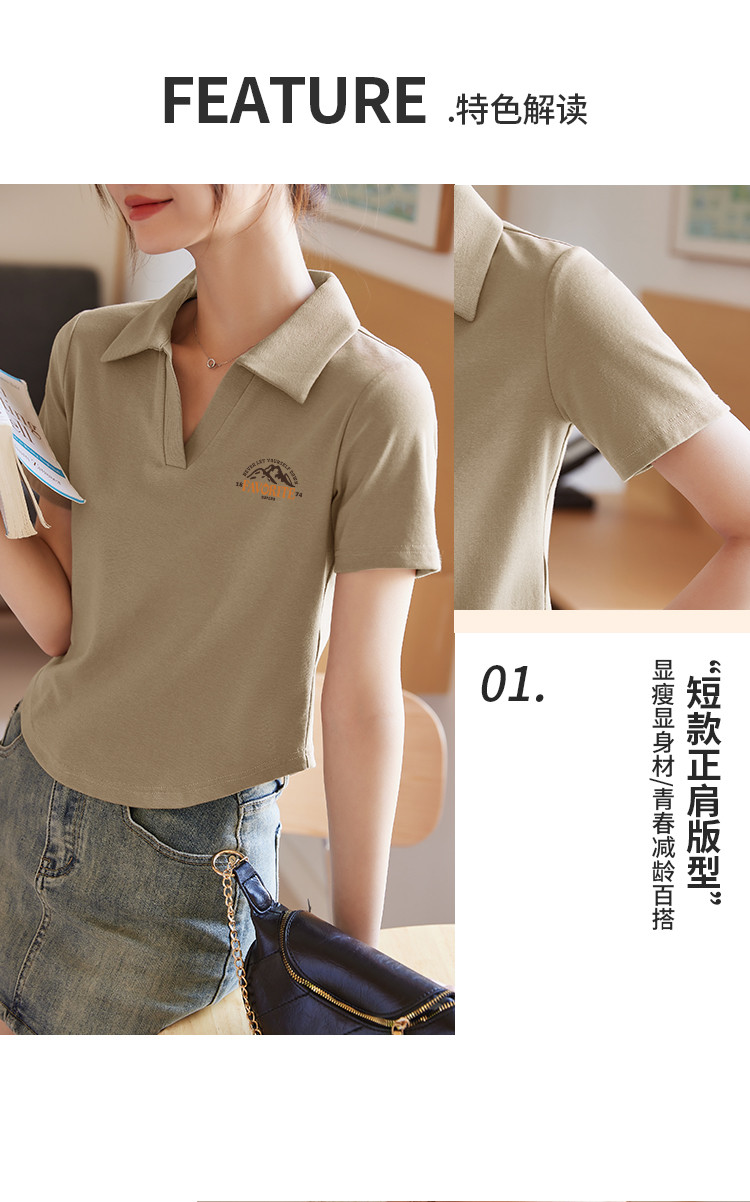 商品名称:米子旗夏季女翻领印花T恤弧形下摆简约小个子短袖上衣 276506