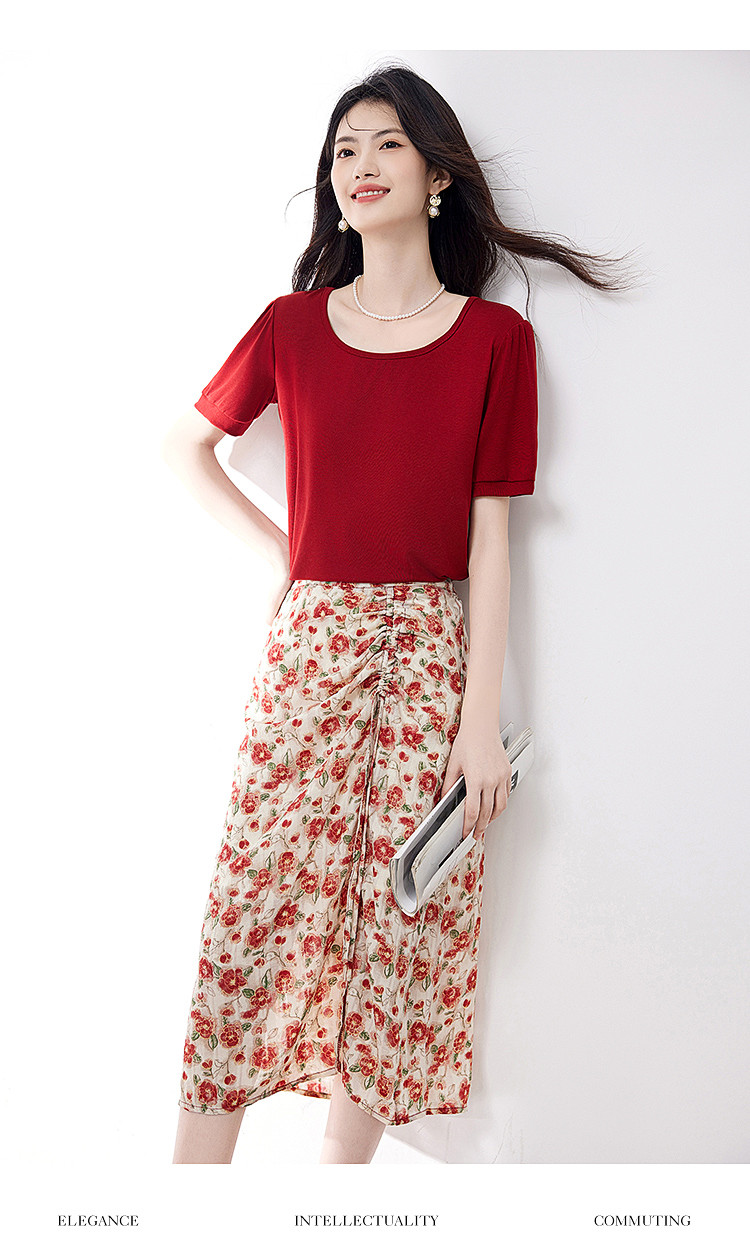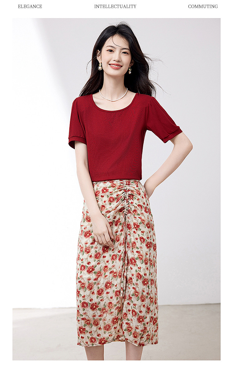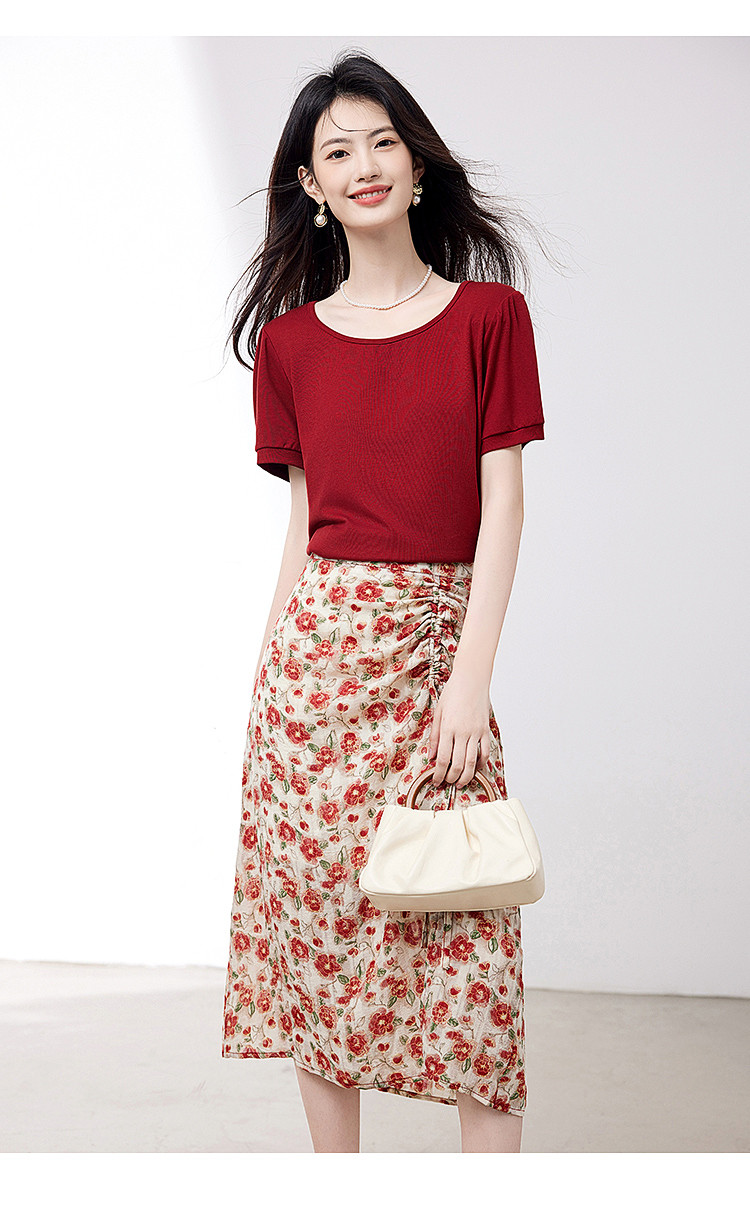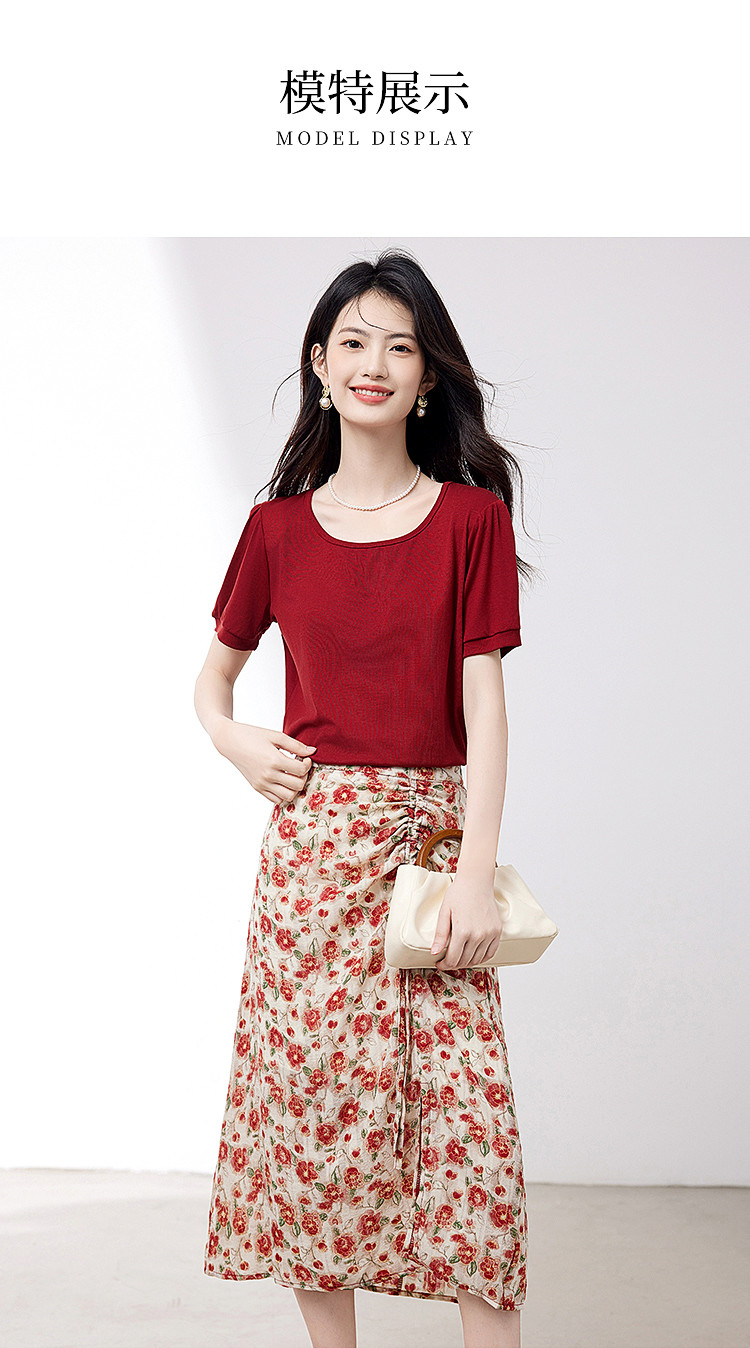 针织短袖T恤套装女2025夏季新款减龄上衣搭碎花半身裙两件套 768152