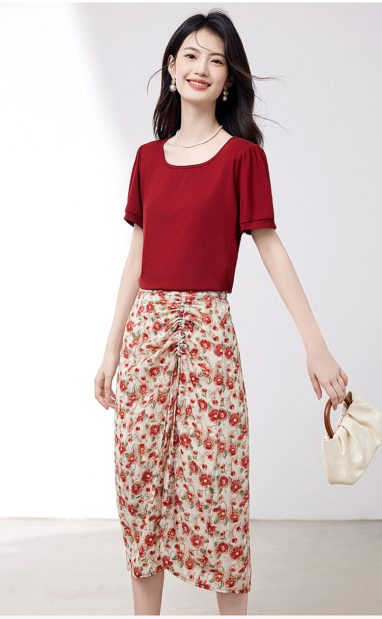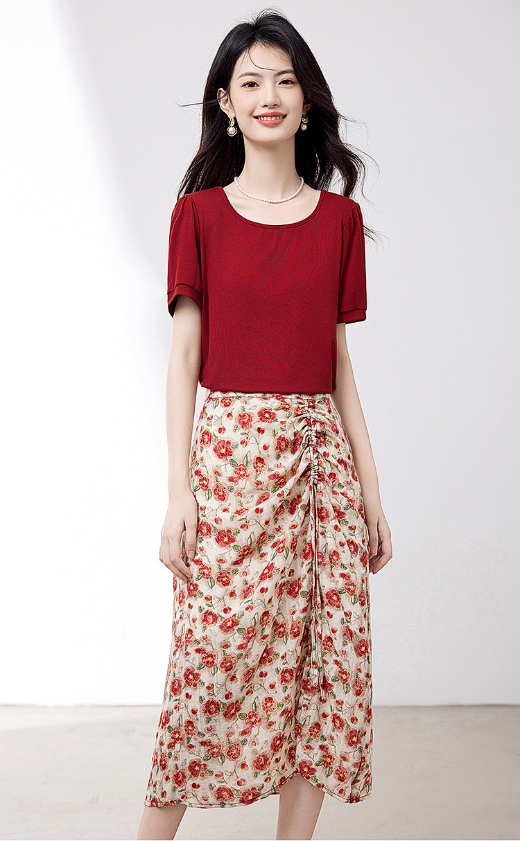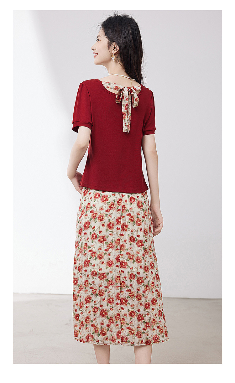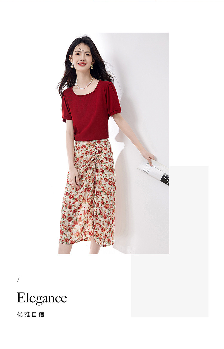 针织短袖T恤套装女2025夏季新款减龄上衣搭碎花半身裙两件套 768152