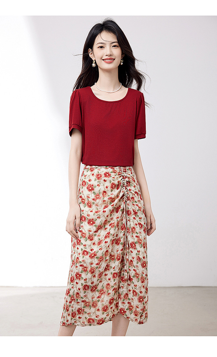 商品名称:针织短袖T恤套装女2025夏季新款减龄上衣搭碎花半身裙两件套 768152