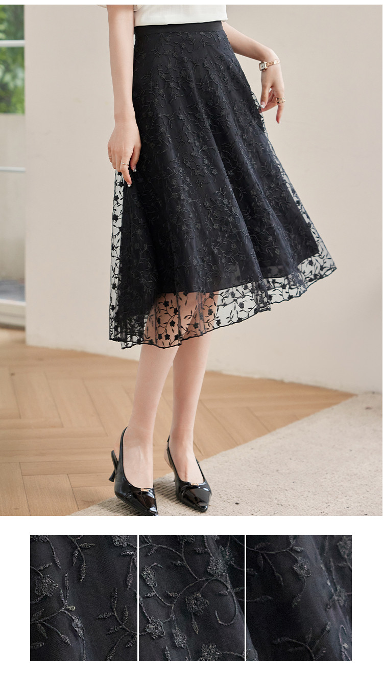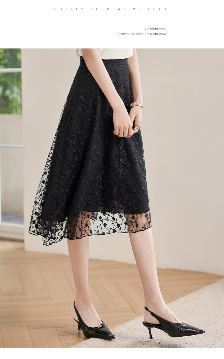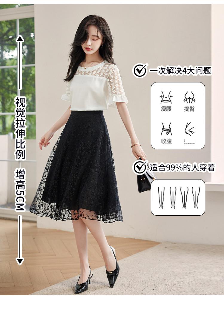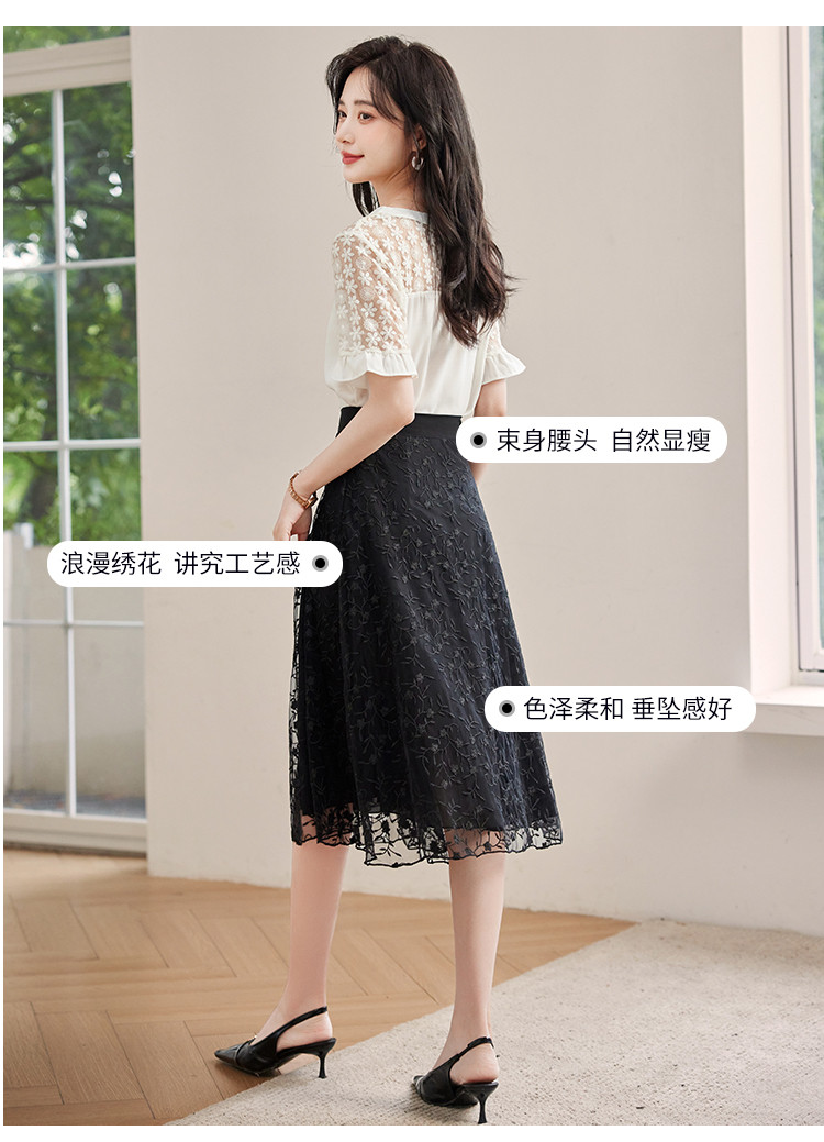 商品名称:轻奢2025清新优雅气质百搭休闲纯色蕾丝绣花大摆a字中长裙女 046680