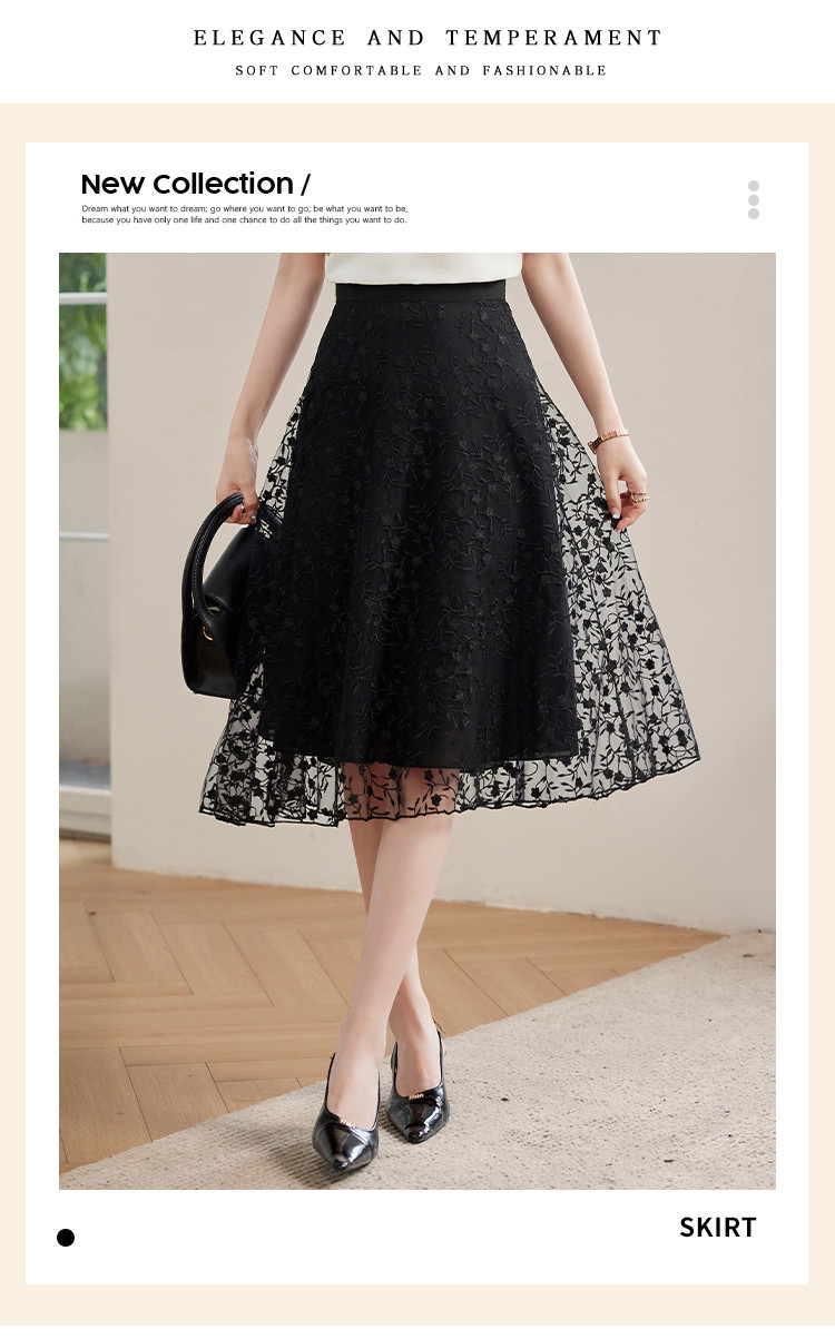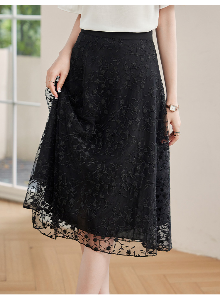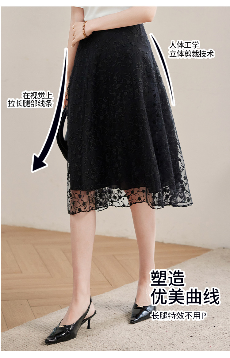 轻奢2025清新优雅气质百搭休闲纯色蕾丝绣花大摆a字中长裙女 046680
