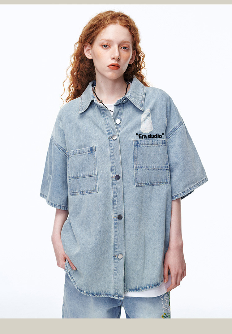美式水洗破洞牛仔短袖衬衫潮情侣款休闲小众外套 437143
