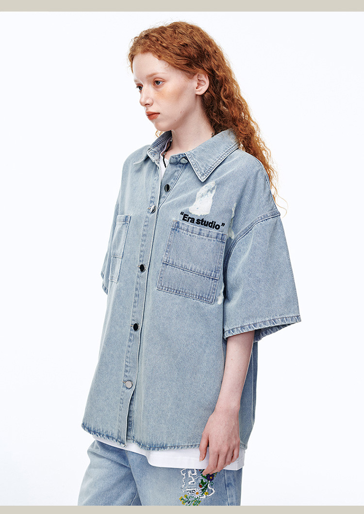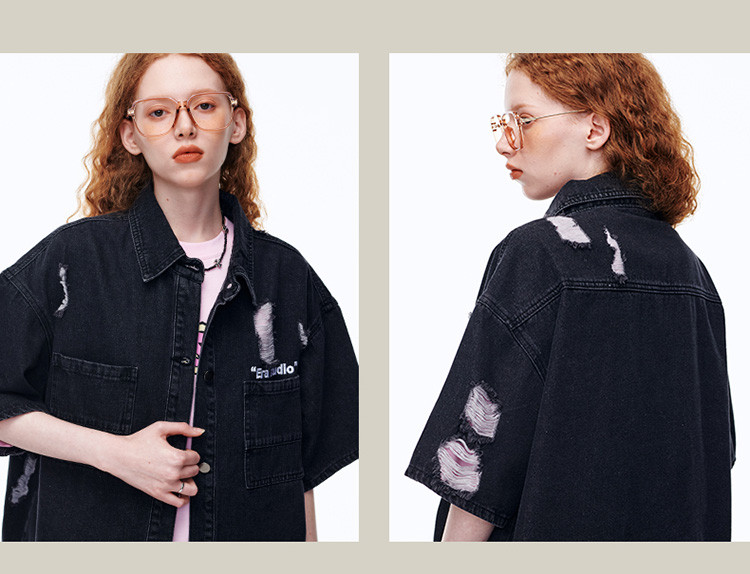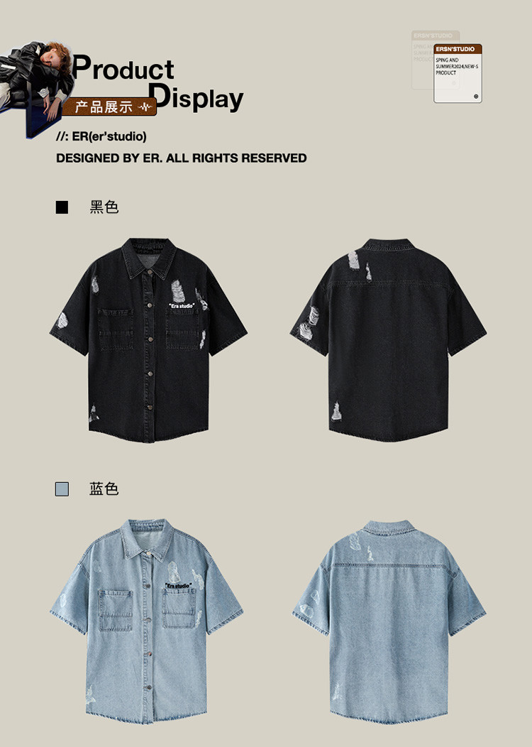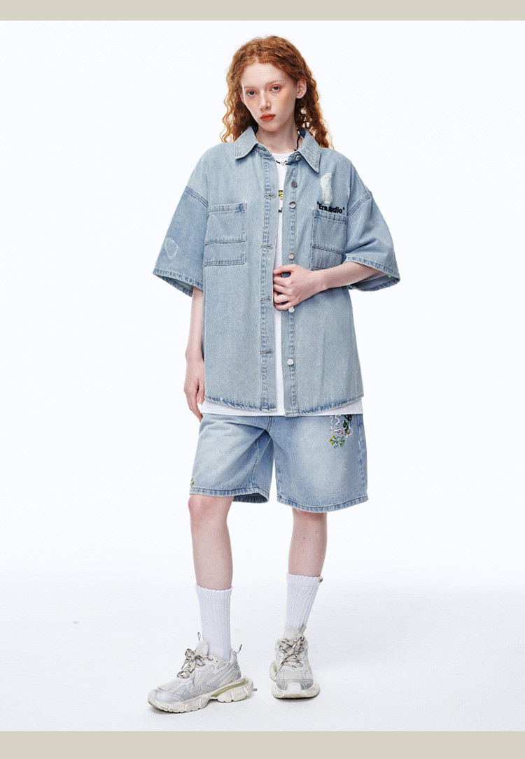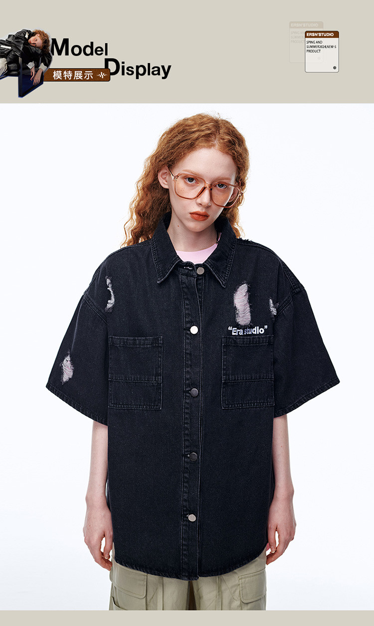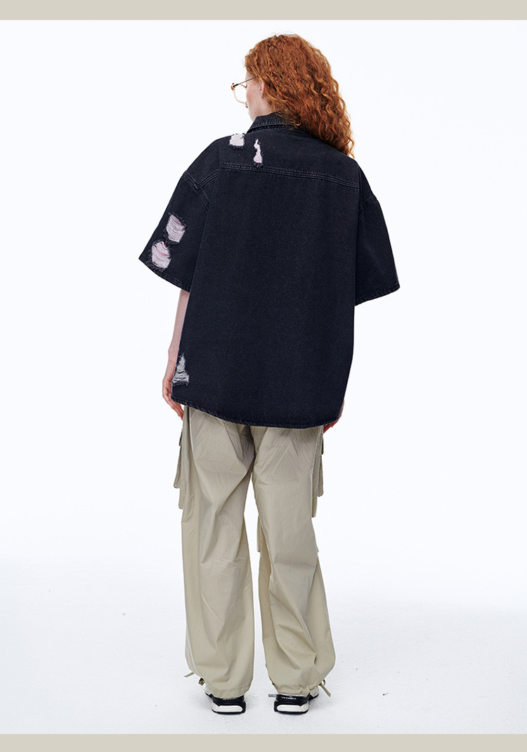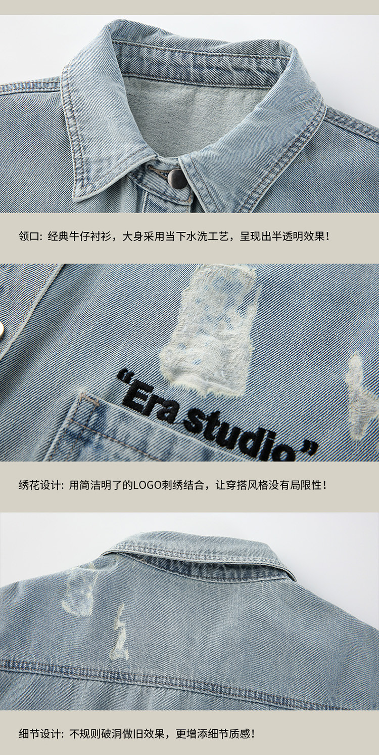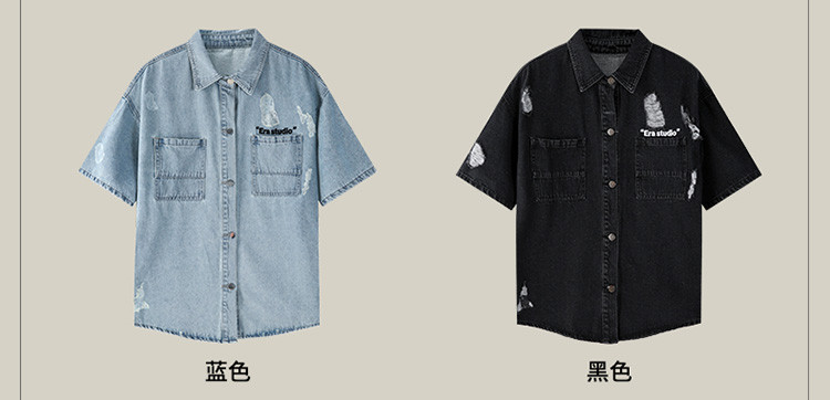 商品名称:美式水洗破洞牛仔短袖衬衫潮情侣款休闲小众外套 437143