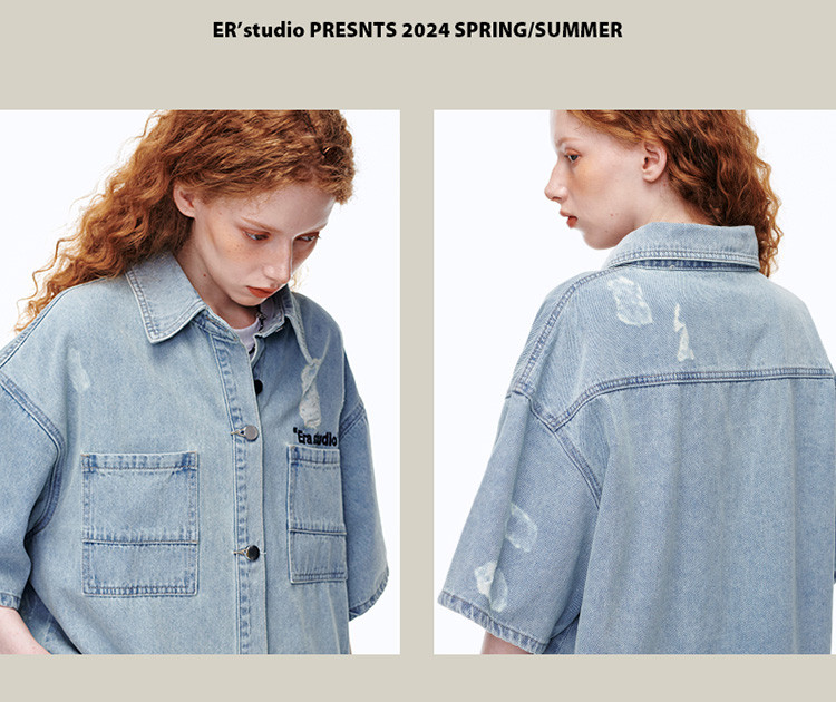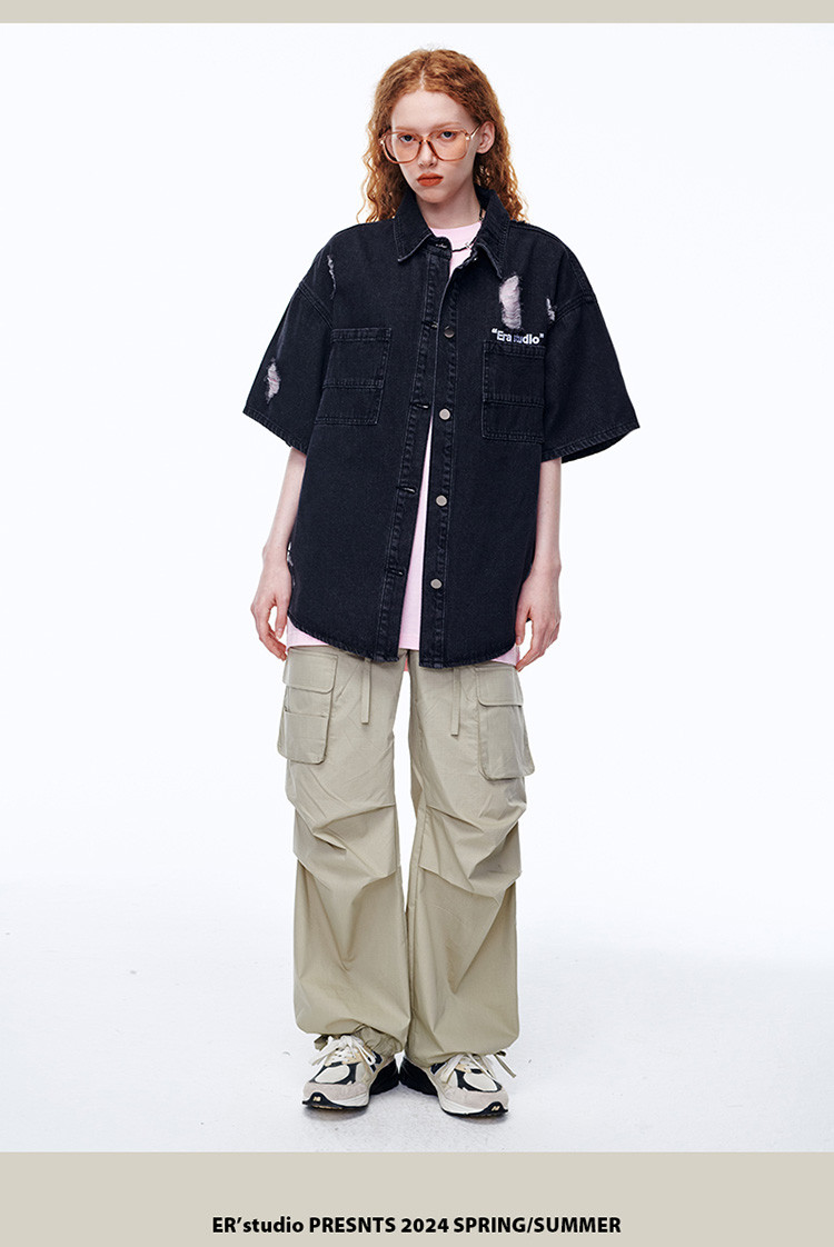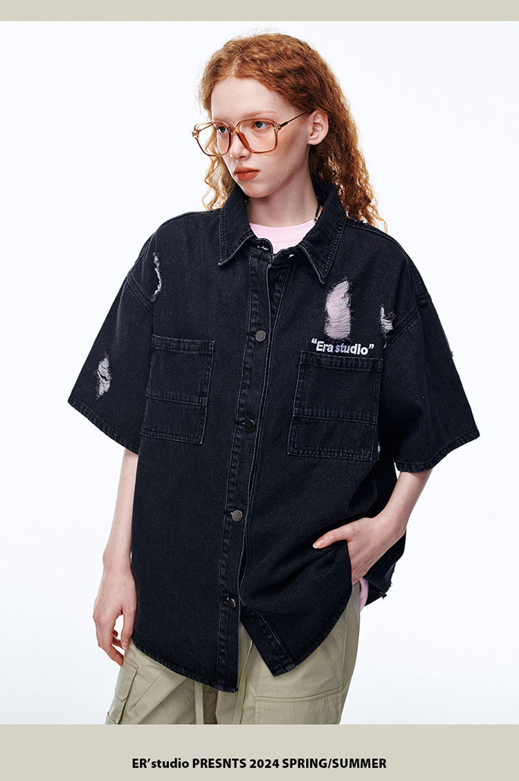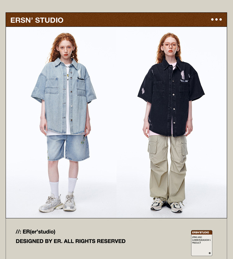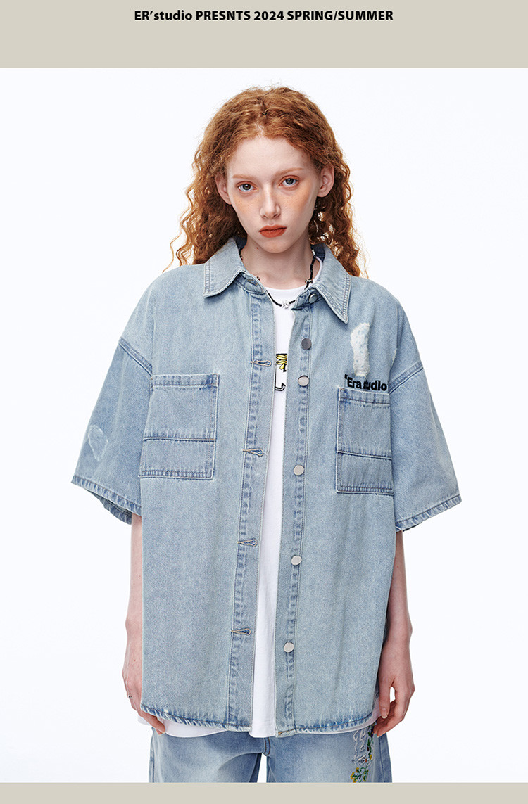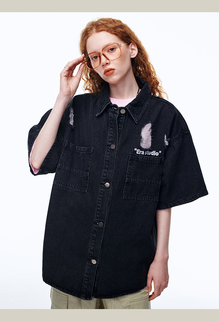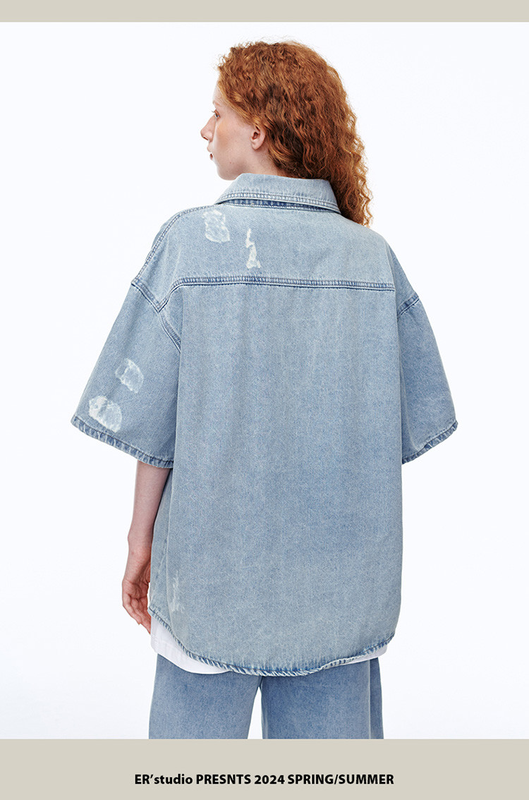商品名称:美式水洗破洞牛仔短袖衬衫潮情侣款休闲小众外套 437143