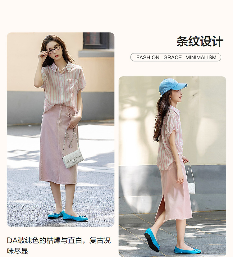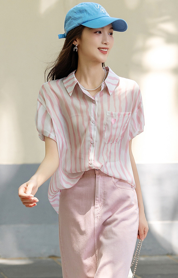 【夏日轻氧吧】轻龄感条纹衬衫甜美花苞袖爽滑雪纺舒适衬衣女上衣 600321
