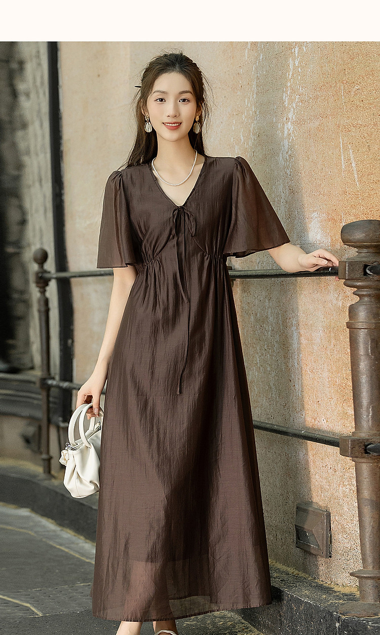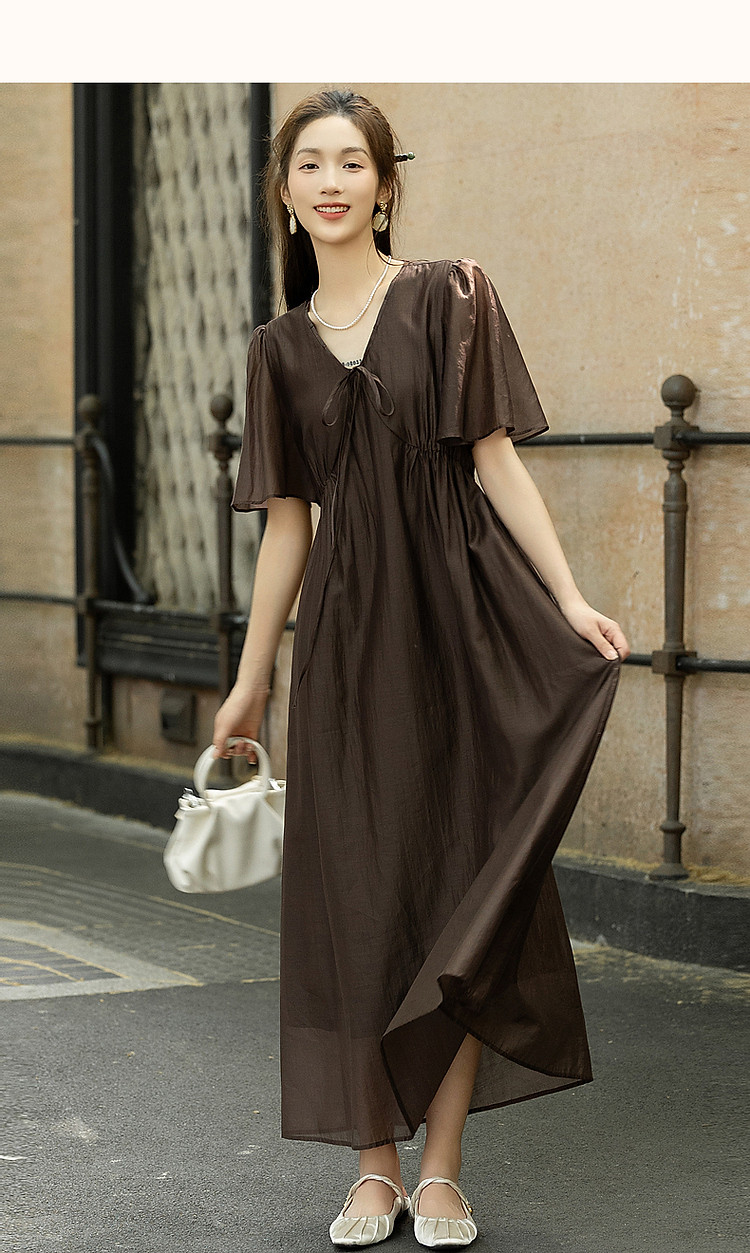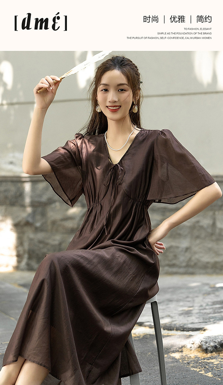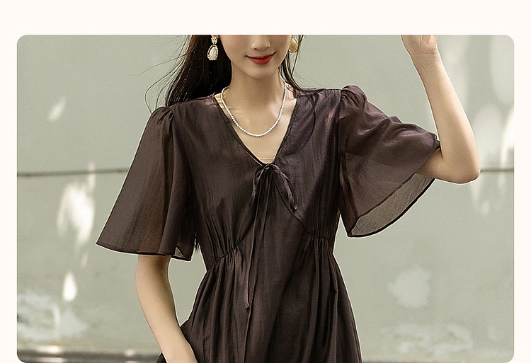 【轻薄莱赛尔】夏季法式V领系带花苞袖小个子飘逸气质女式连衣裙 862465