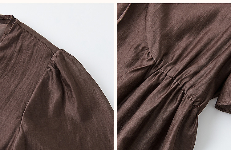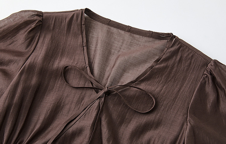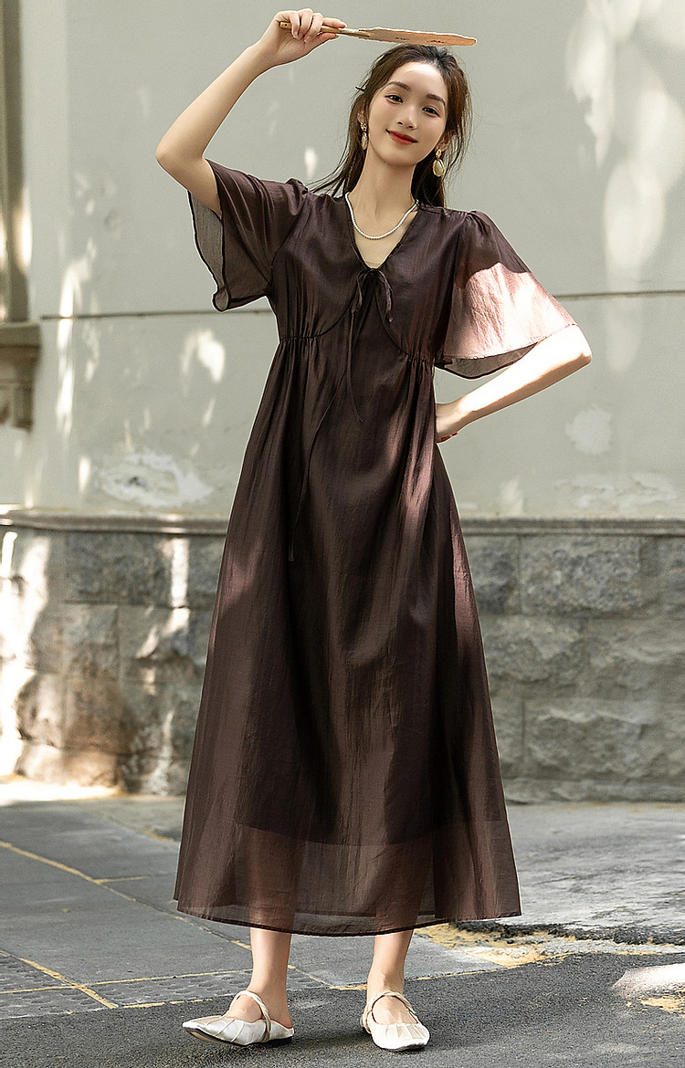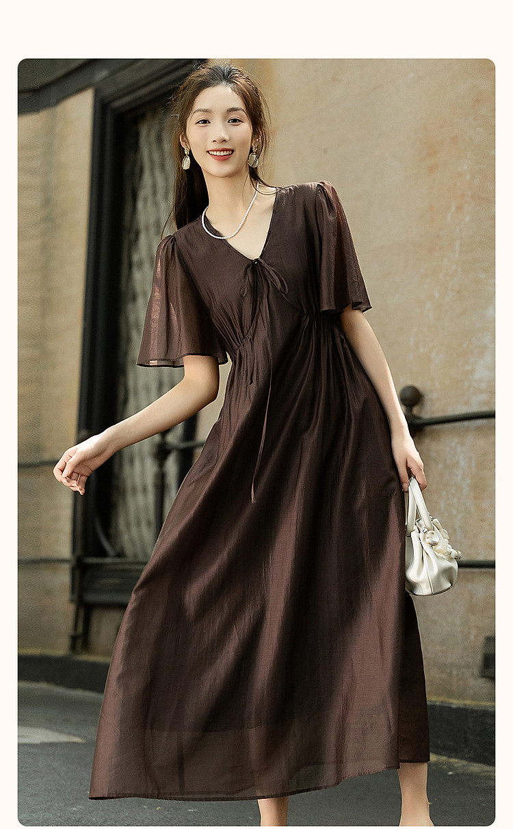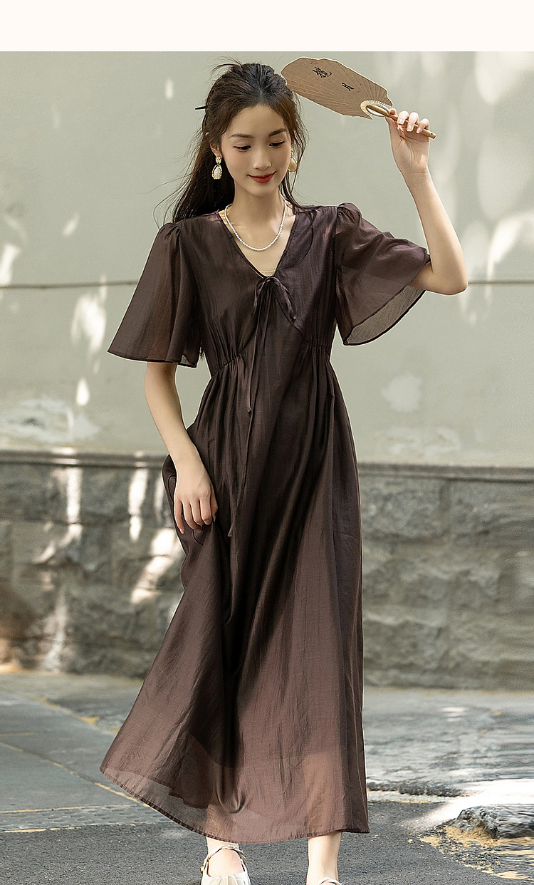 【轻薄莱赛尔】夏季法式V领系带花苞袖小个子飘逸气质女式连衣裙 862465